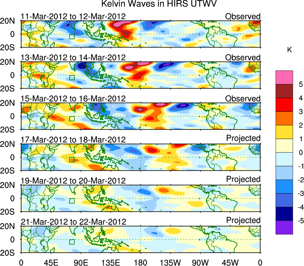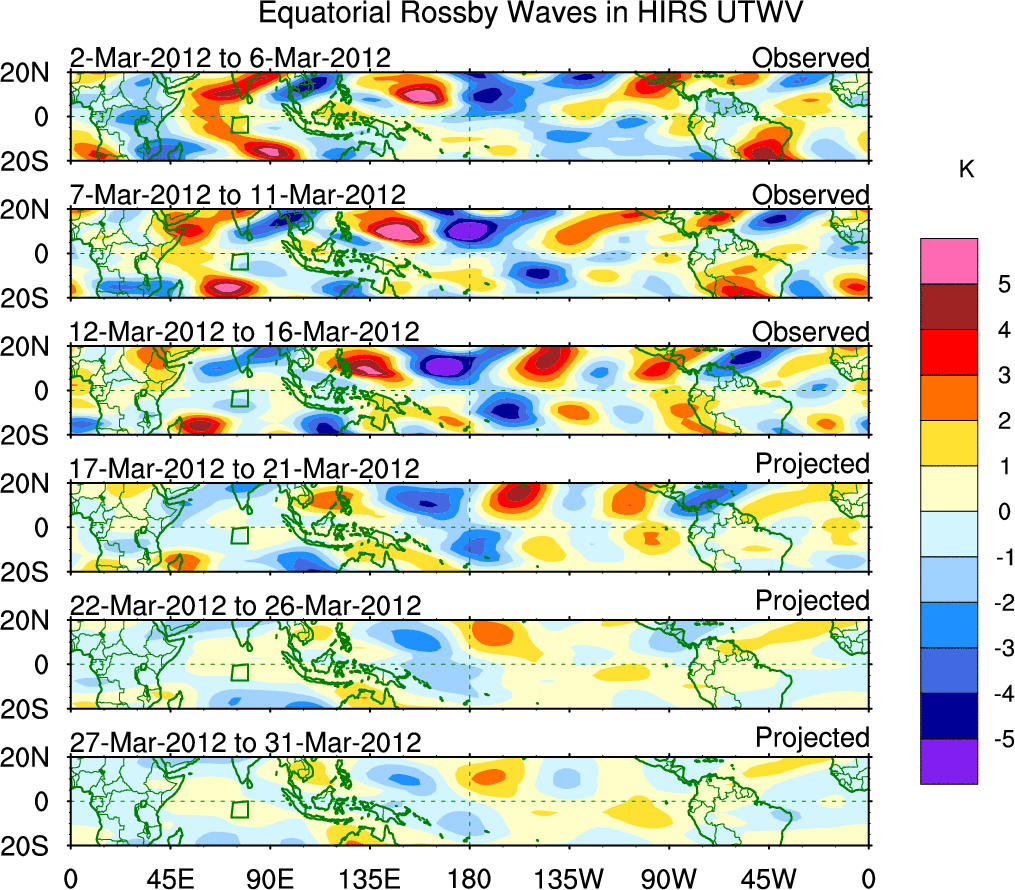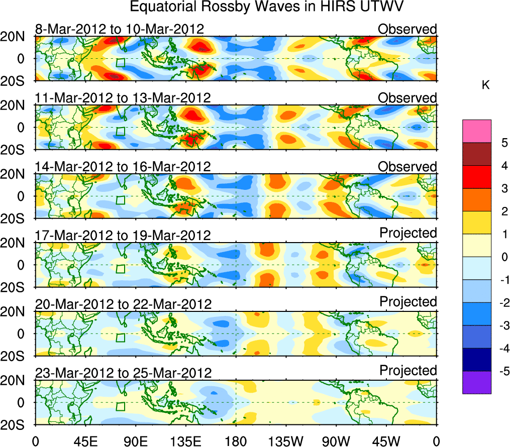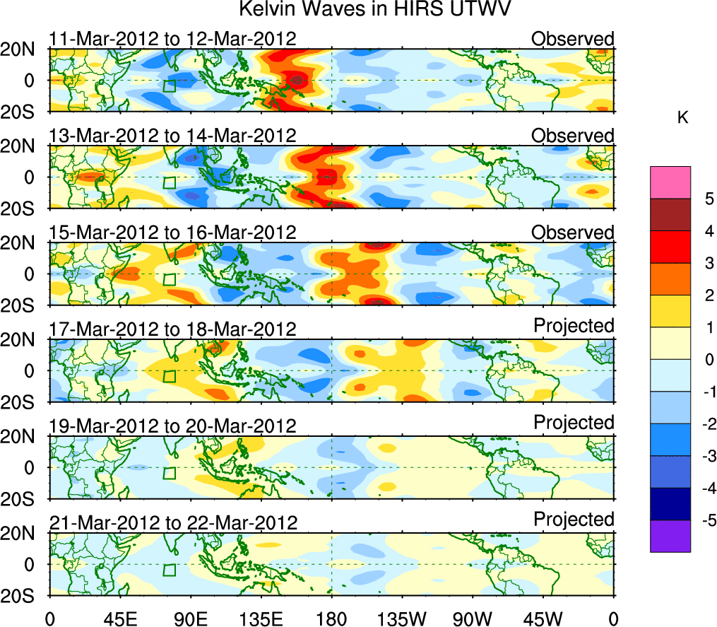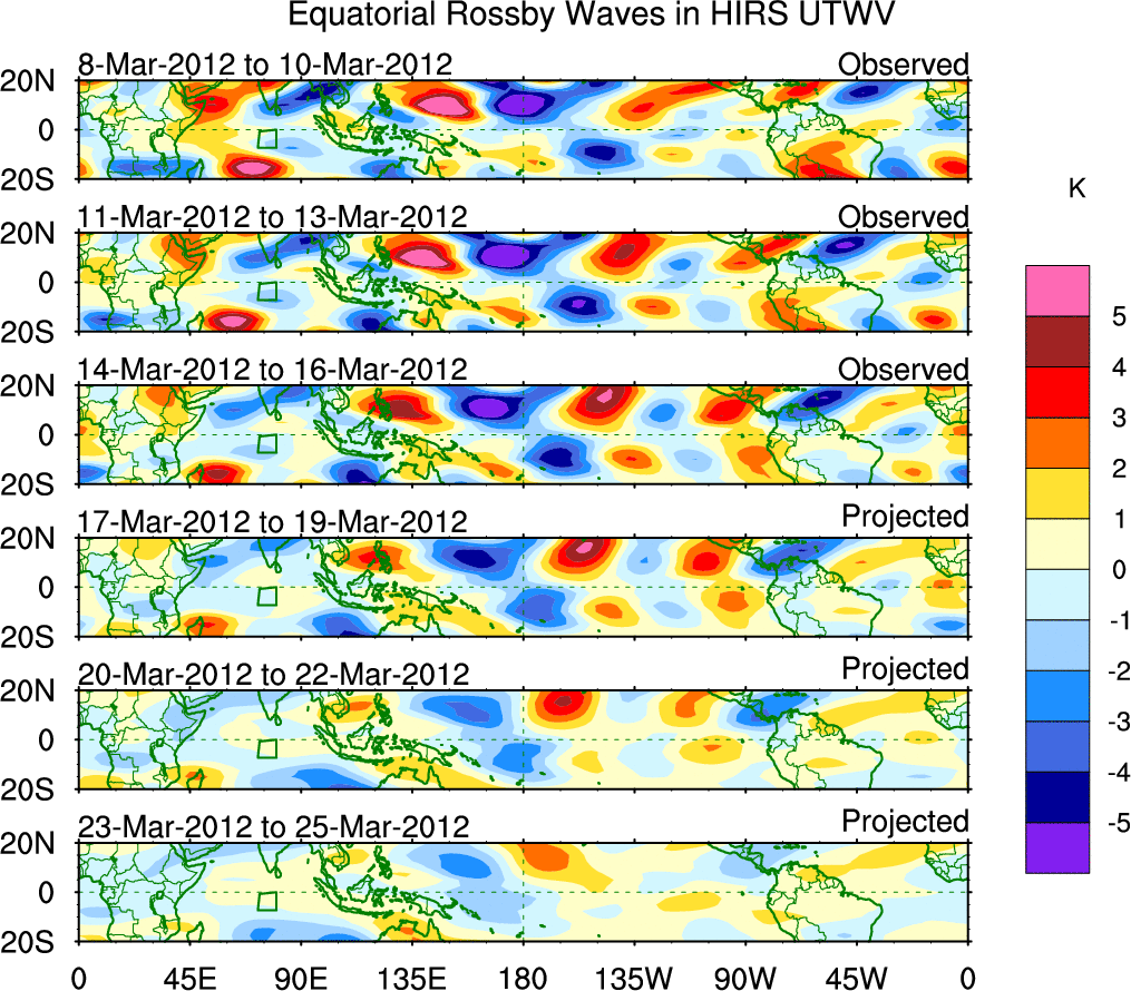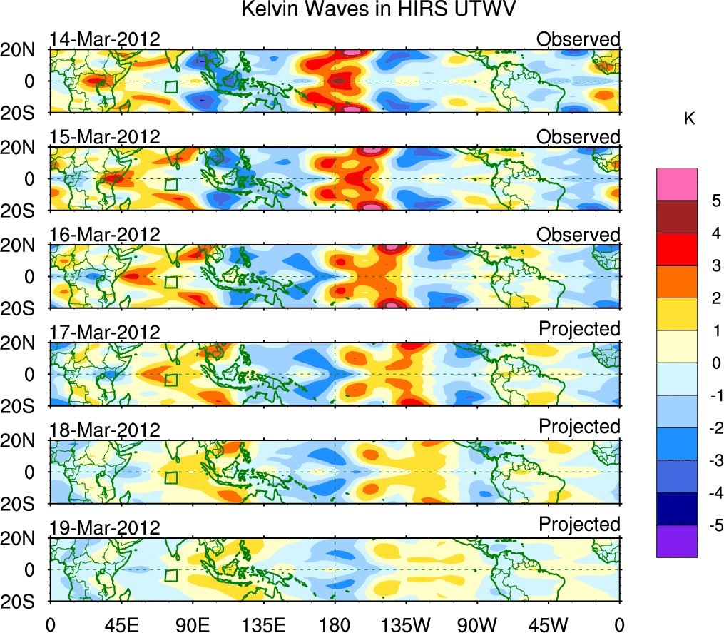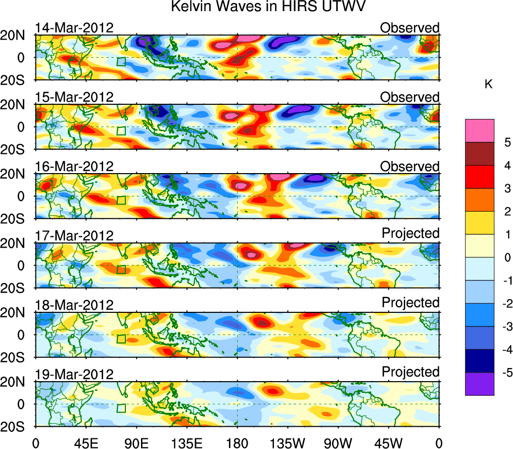 To identify tropical waves in near real-time, the OLR and UTWV data are filtered following Wheeler & Weickmann (2001 MWR). The daily anomalies are calculated using the first 3 harmonics of the seasonal cycle for 1979–2009. Missing values are then filled using linear interpolation in space and time. The most recent 365 days of anomalies are padded with 659 days of zeroes, and the result is filtered for each wave type.