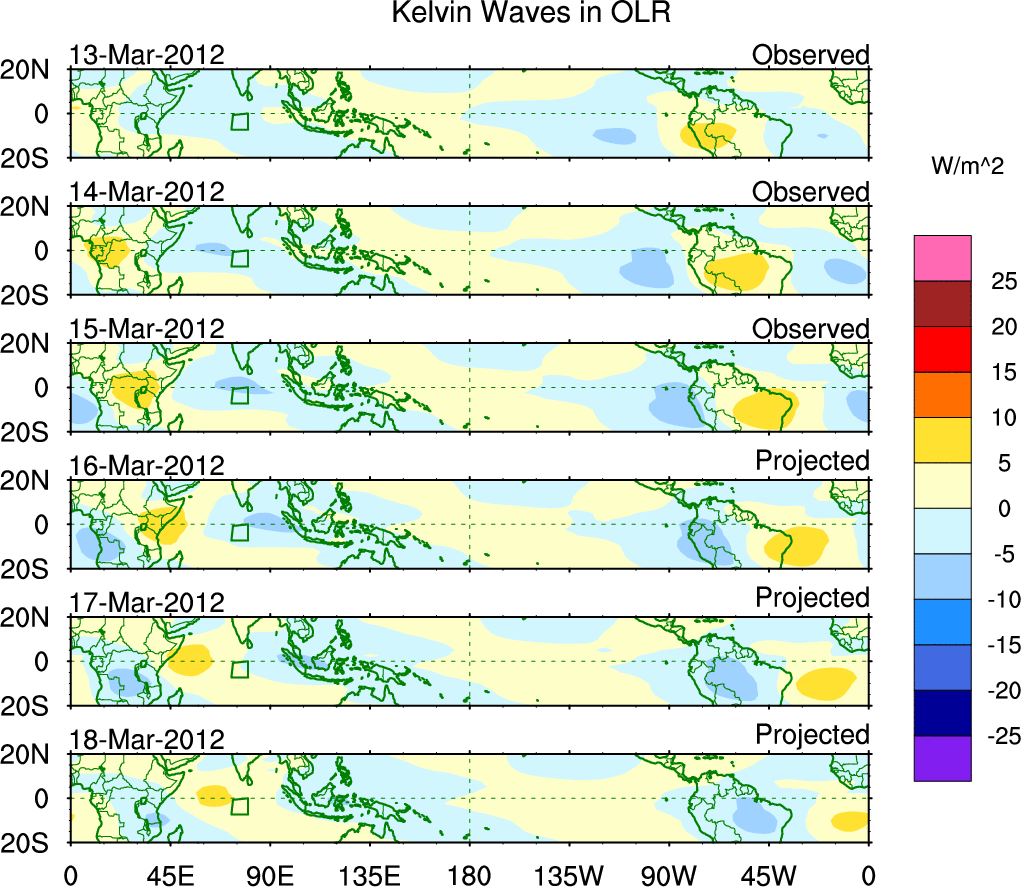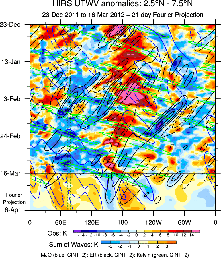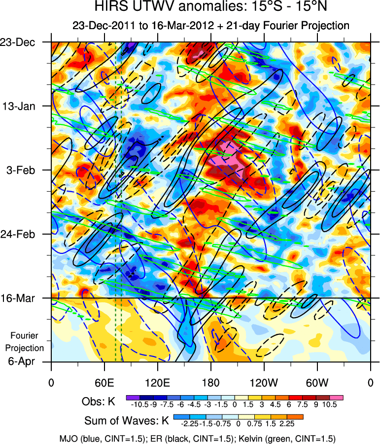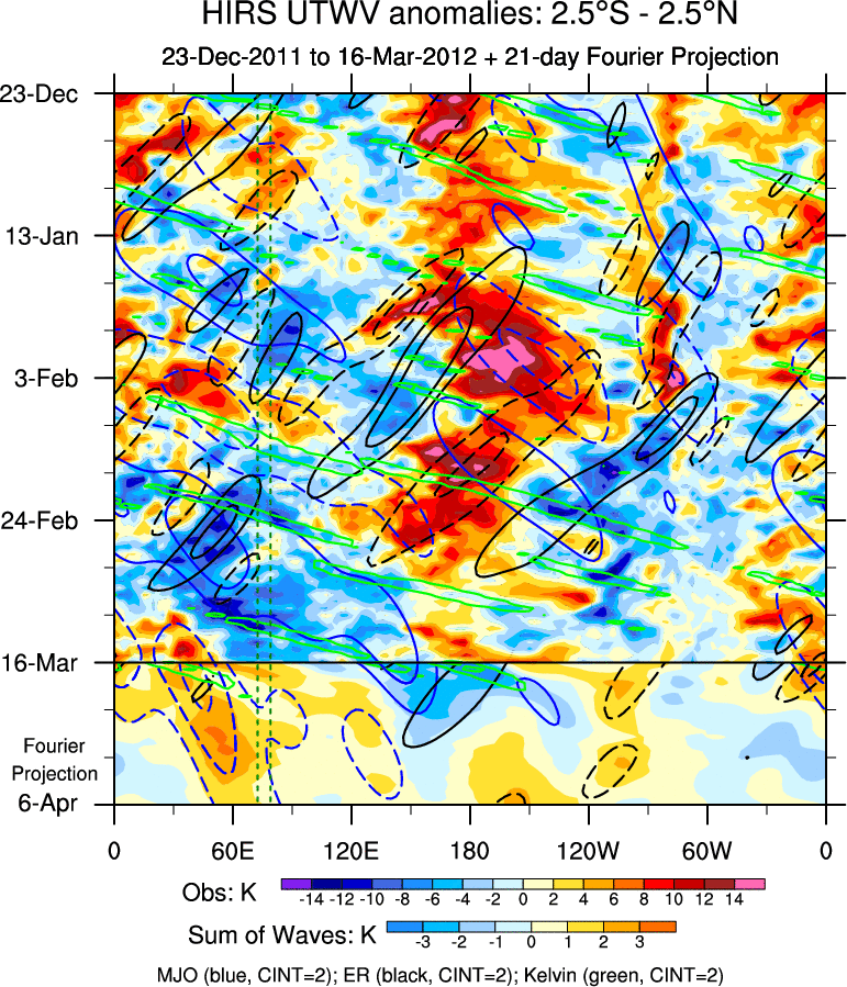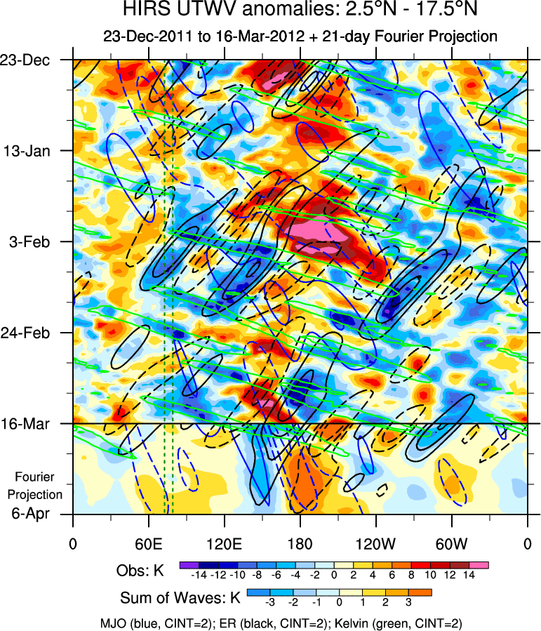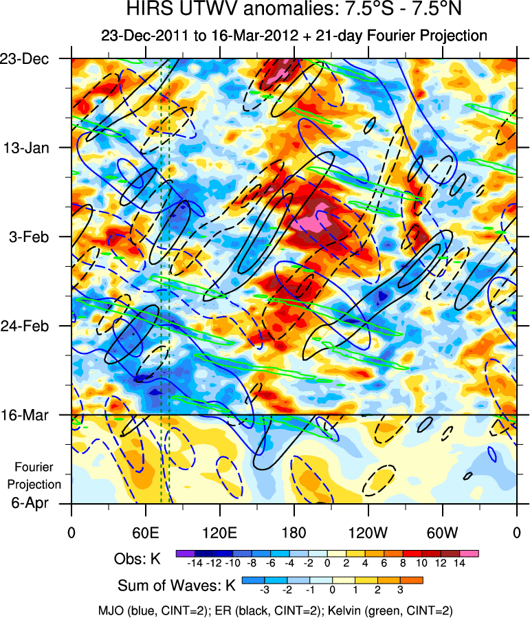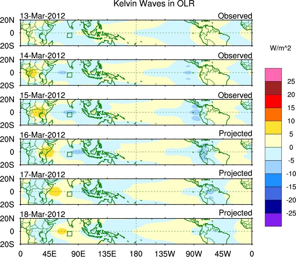 To identify tropical waves in near real-time, the OLR and UTWV data are filtered following Wheeler & Weickmann (2001 MWR). The daily anomalies are calculated using the first 3 harmonics of the seasonal cycle for 1979–2009. Missing values are then filled using linear interpolation in space and time. The most recent 365 days of anomalies are padded with 659 days of zeroes, and the result is filtered for each wave type.