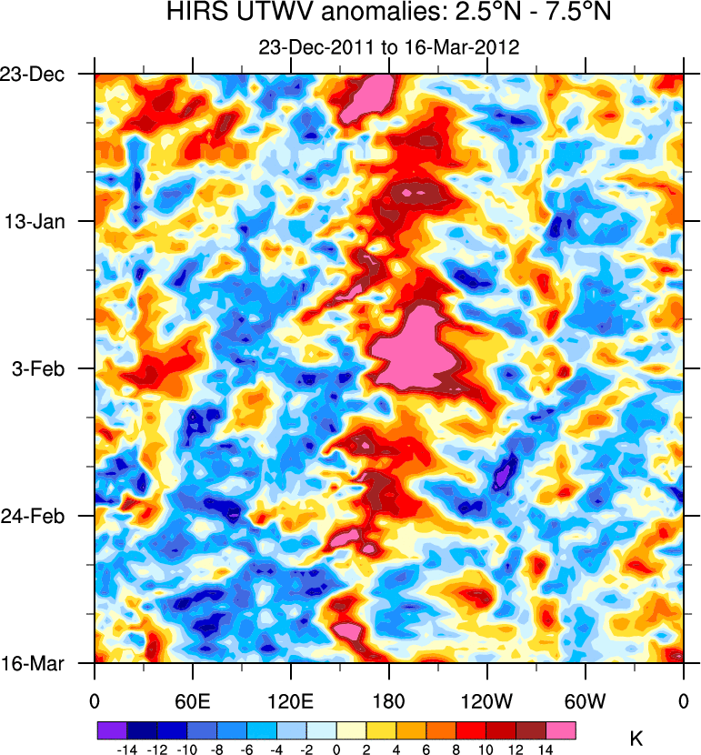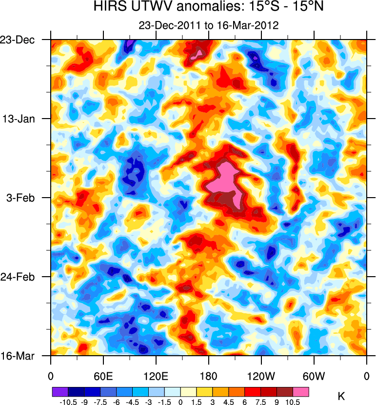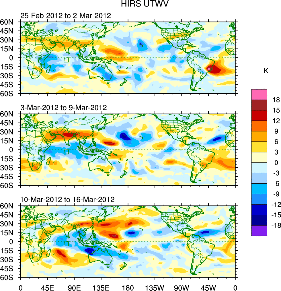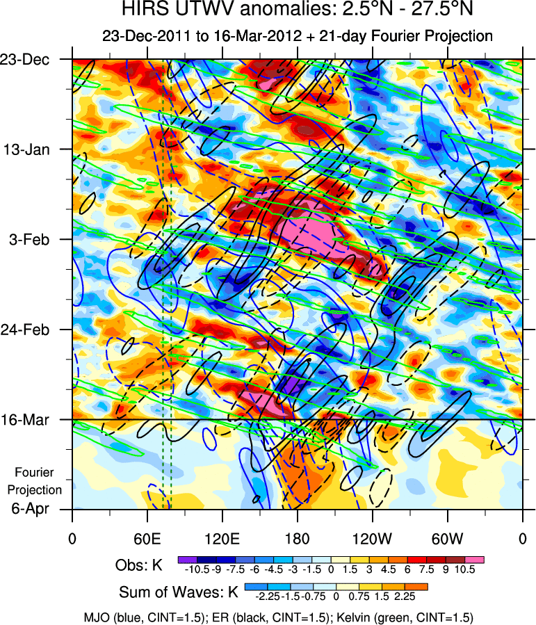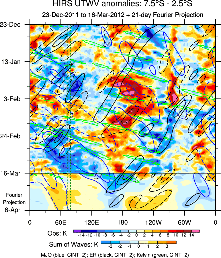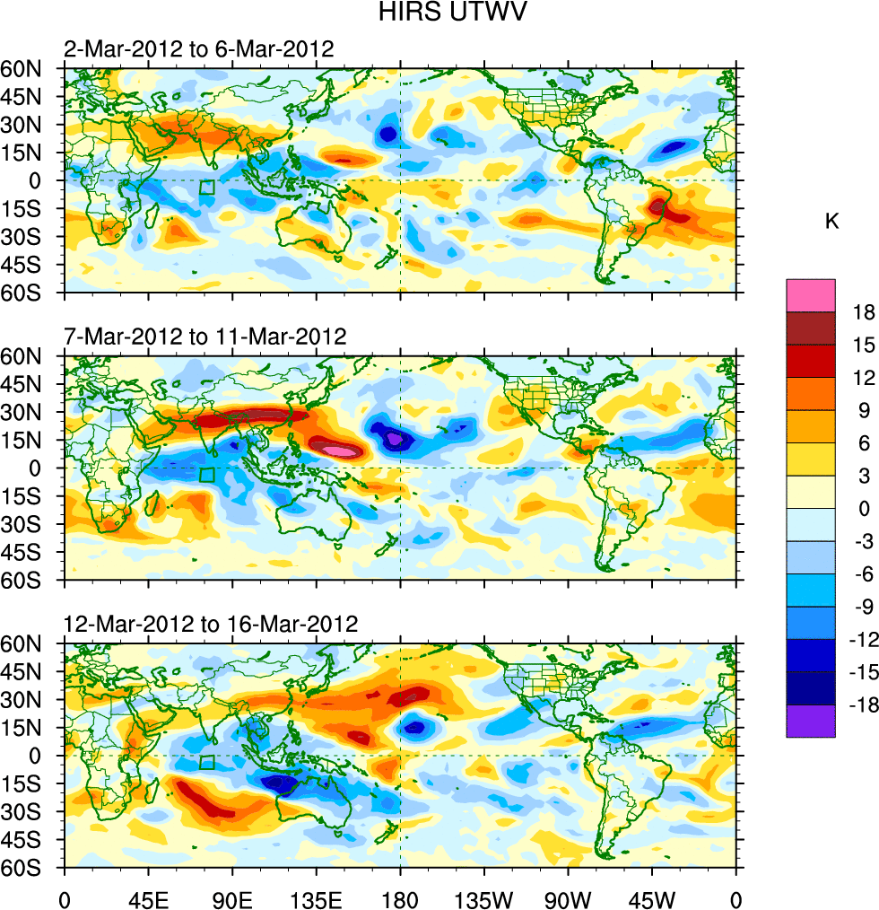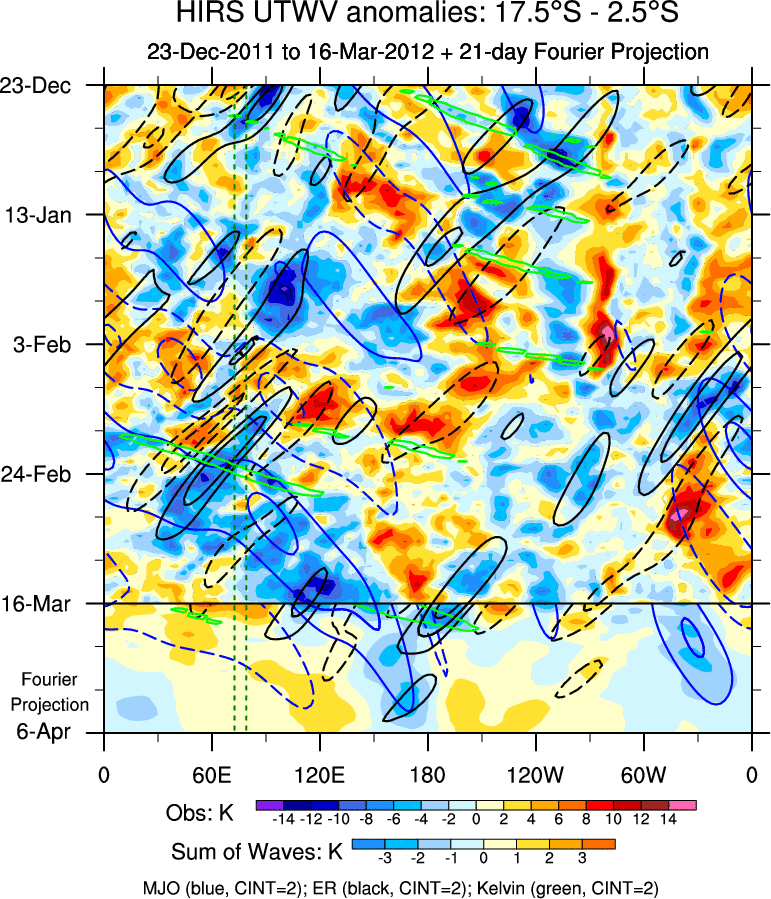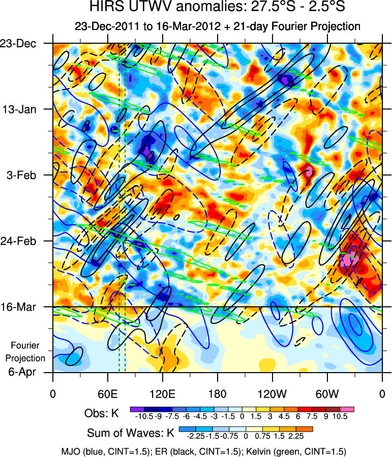 To identify tropical waves in near real-time, the OLR and UTWV data are filtered following Wheeler & Weickmann (2001 MWR). The daily anomalies are calculated using the first 3 harmonics of the seasonal cycle for 1979–2009. Missing values are then filled using linear interpolation in space and time. The most recent 365 days of anomalies are padded with 659 days of zeroes, and the result is filtered for each wave type.