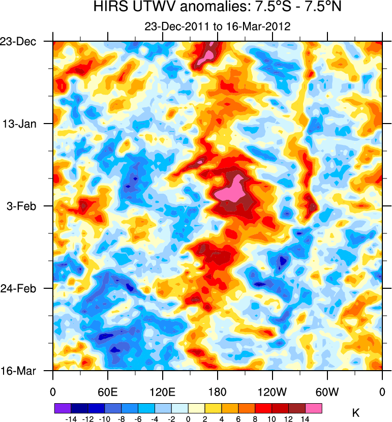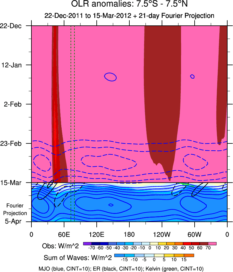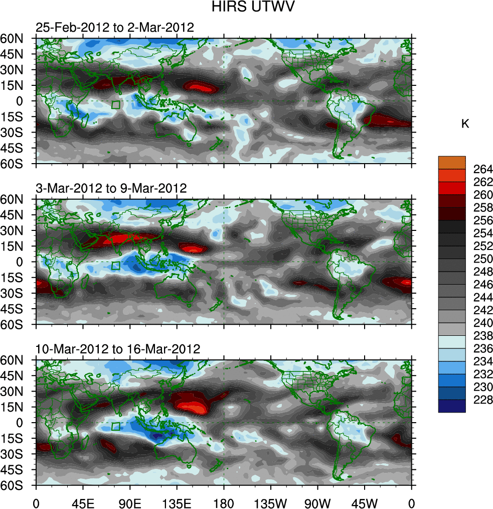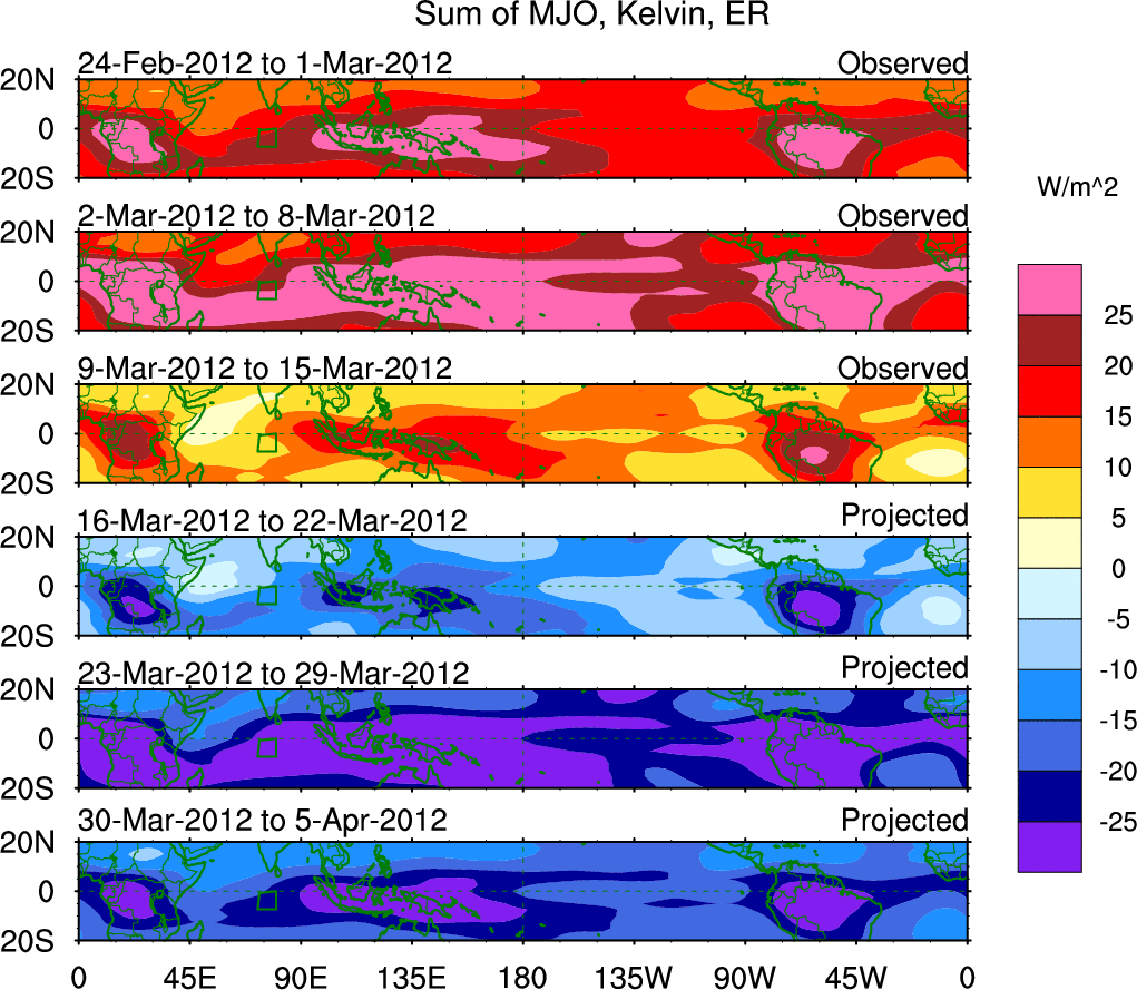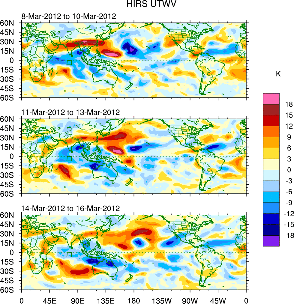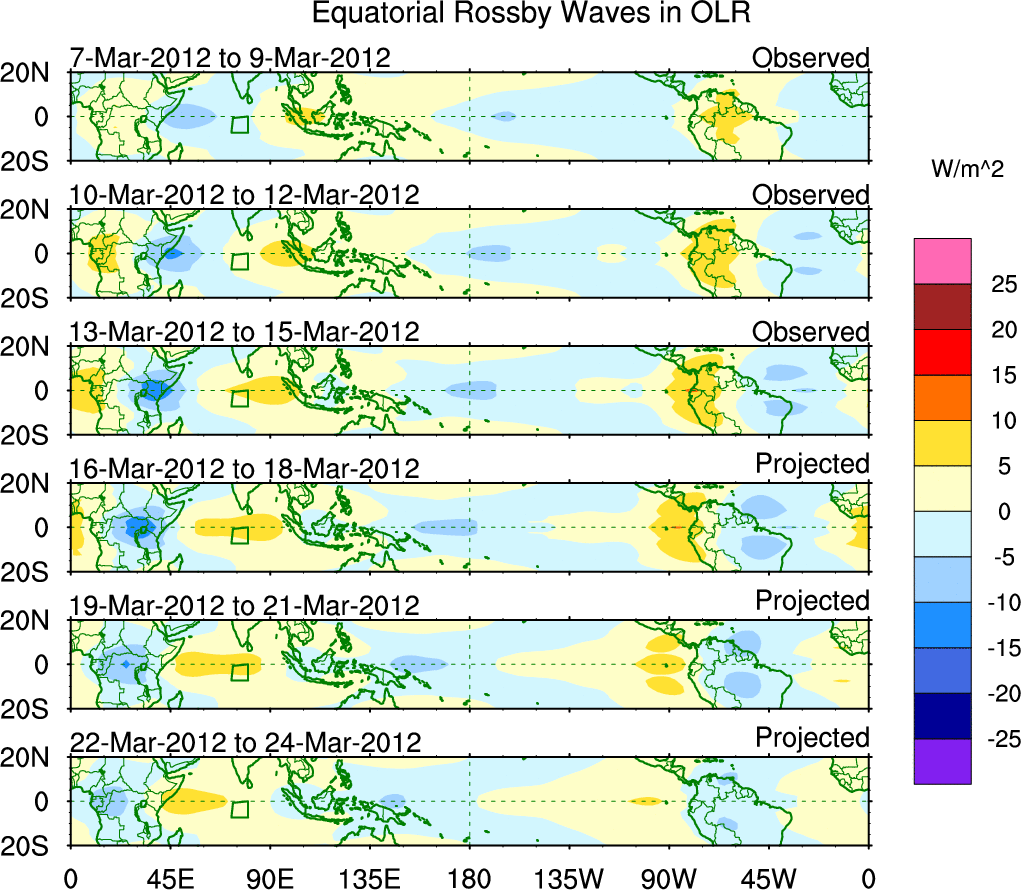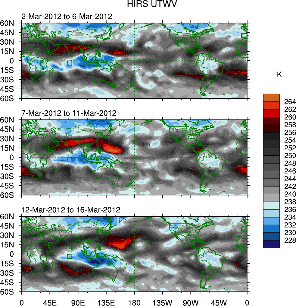 To identify tropical waves in near real-time, the OLR and UTWV data are filtered following Wheeler & Weickmann (2001 MWR). The daily anomalies are calculated using the first 3 harmonics of the seasonal cycle for 1979–2009. Missing values are then filled using linear interpolation in space and time. The most recent 365 days of anomalies are padded with 659 days of zeroes, and the result is filtered for each wave type.
