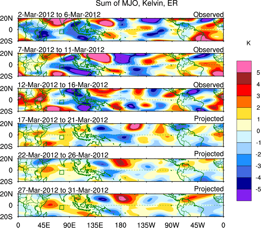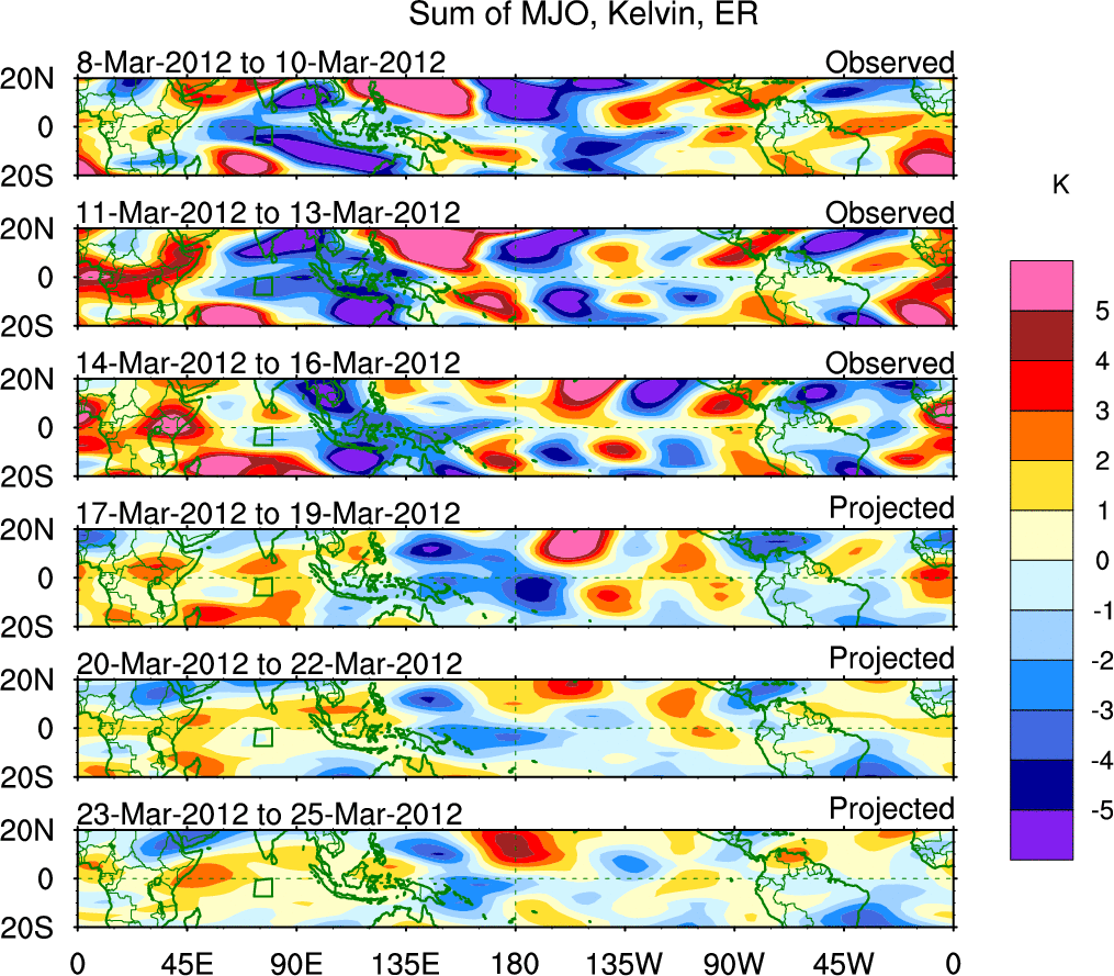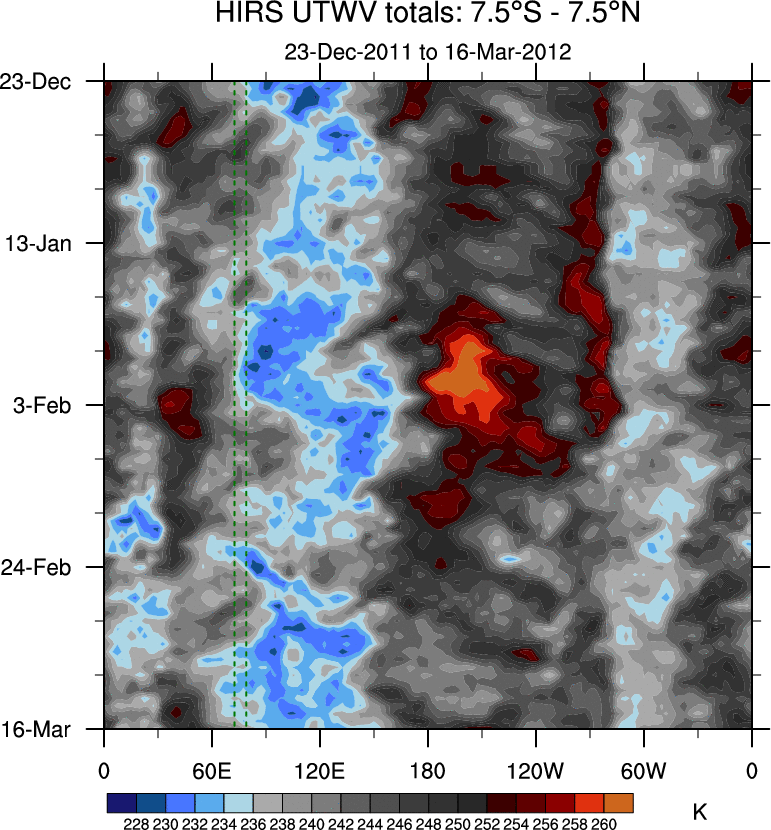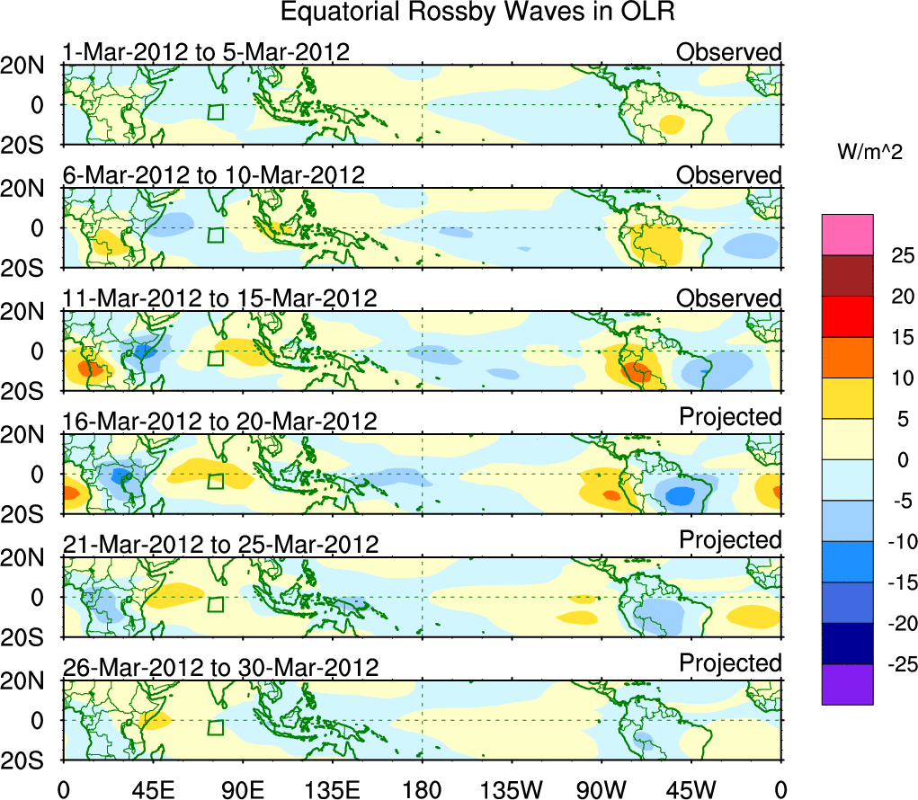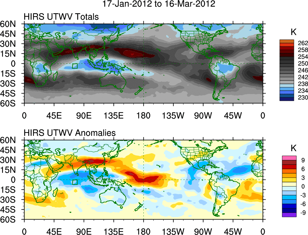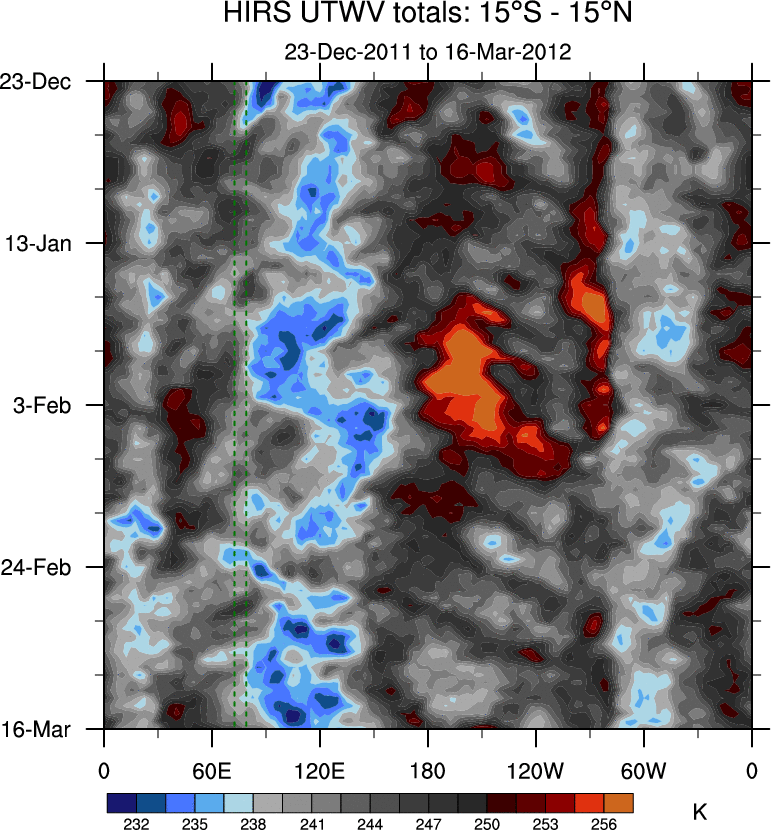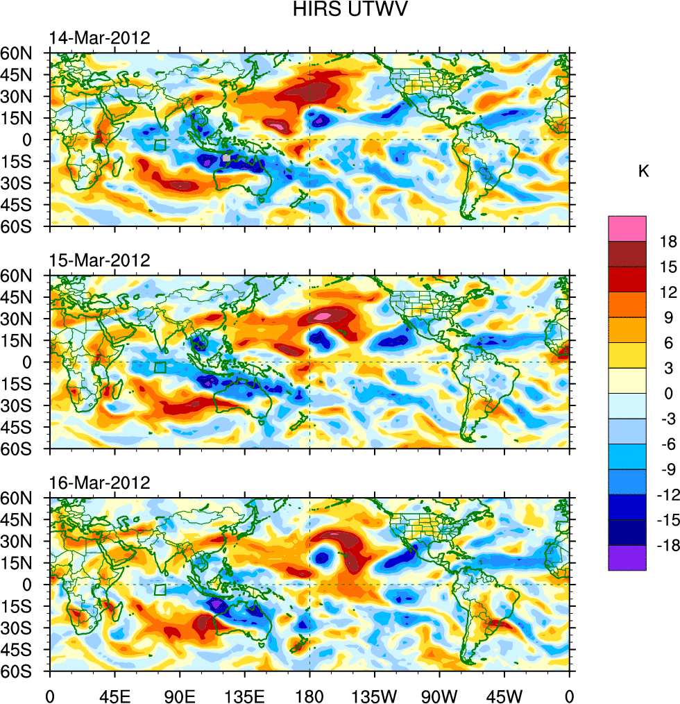 To identify tropical waves in near real-time, the OLR and UTWV data are filtered following Wheeler & Weickmann (2001 MWR). The daily anomalies are calculated using the first 3 harmonics of the seasonal cycle for 1979–2009. Missing values are then filled using linear interpolation in space and time. The most recent 365 days of anomalies are padded with 659 days of zeroes, and the result is filtered for each wave type.