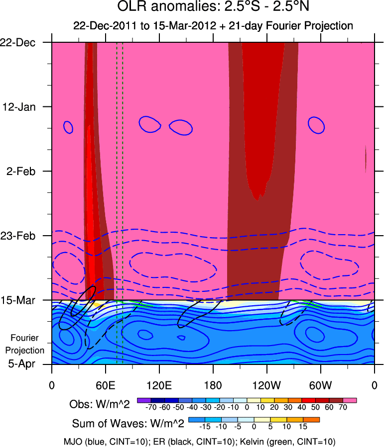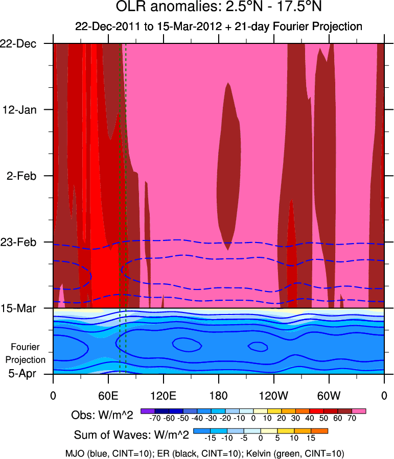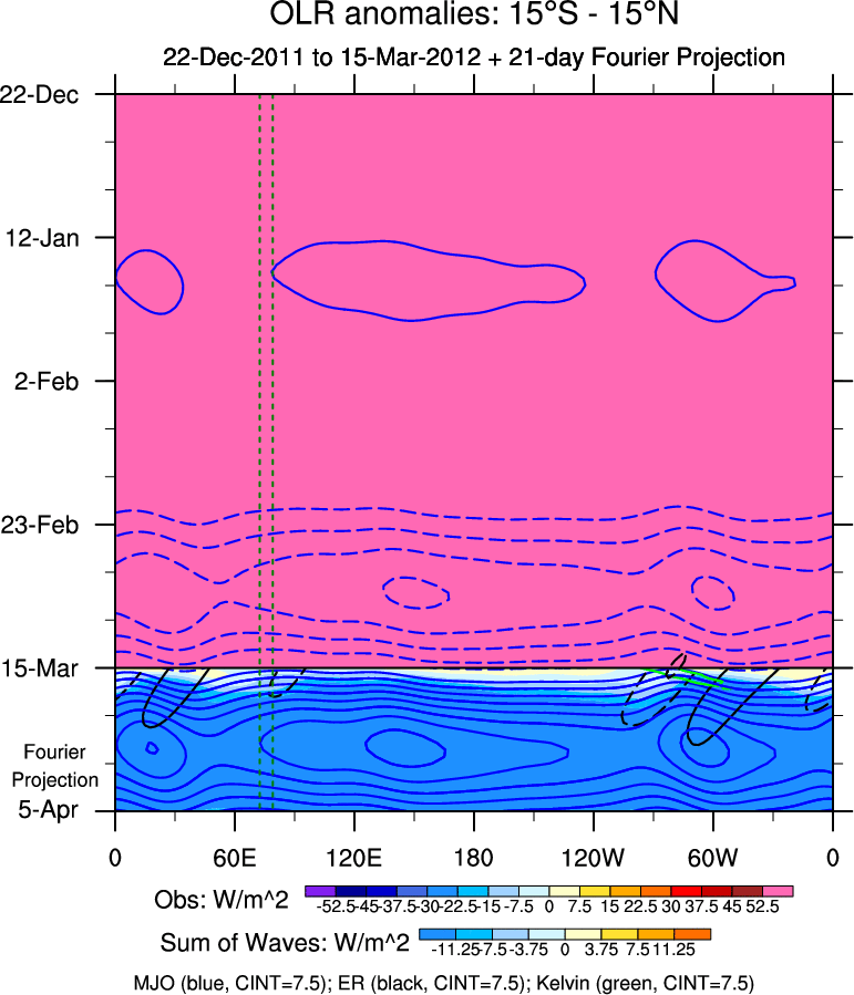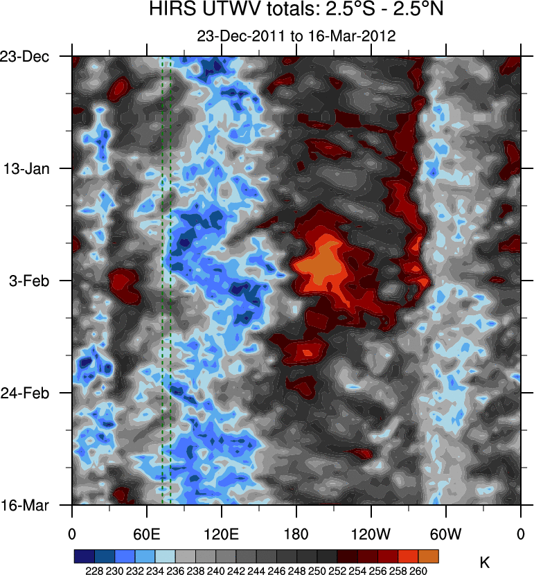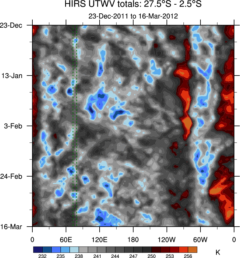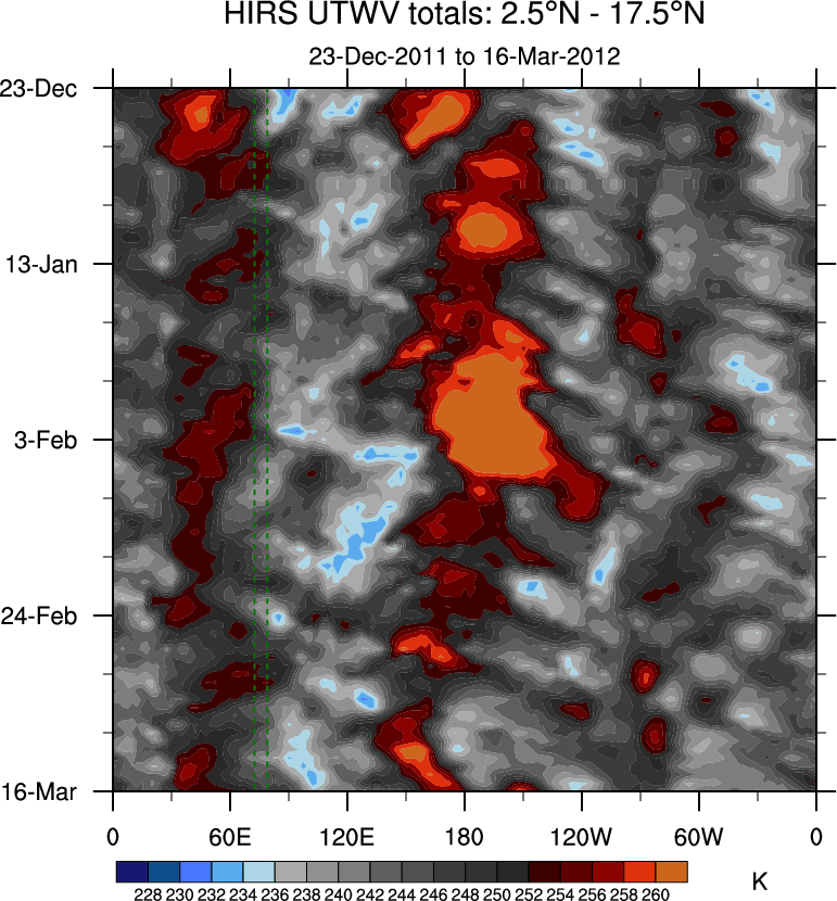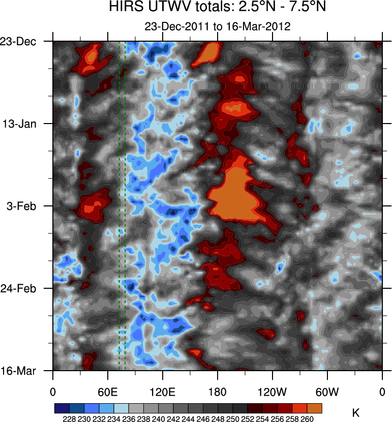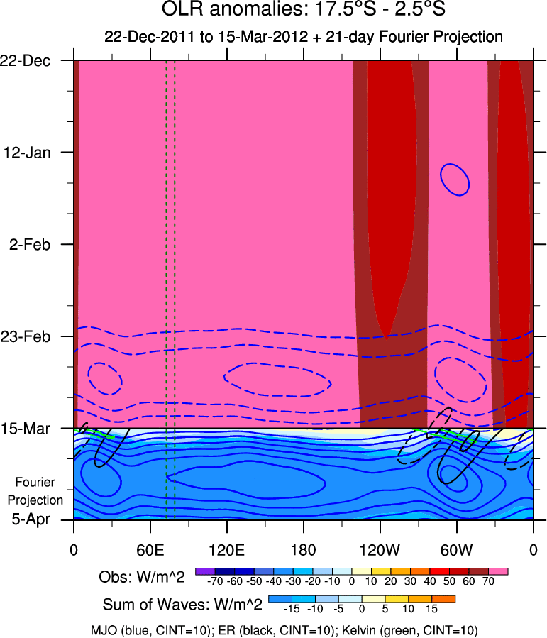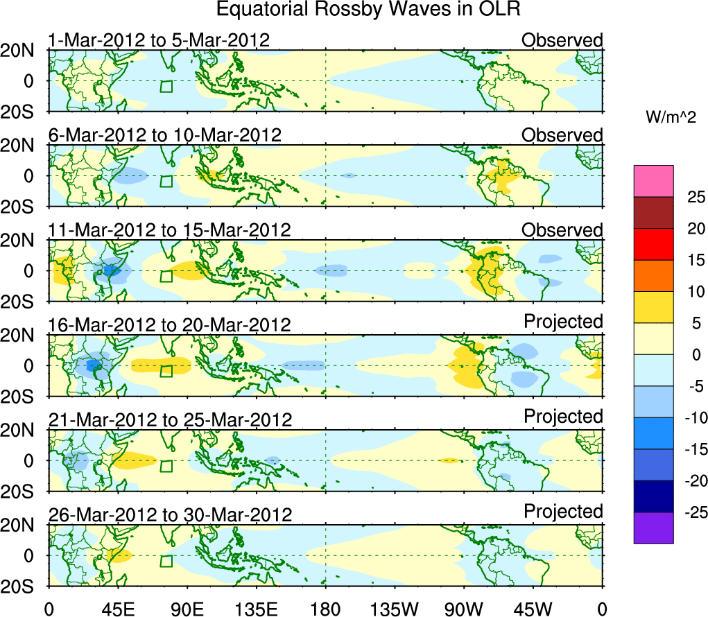 To identify tropical waves in near real-time, the OLR and UTWV data are filtered following Wheeler & Weickmann (2001 MWR). The daily anomalies are calculated using the first 3 harmonics of the seasonal cycle for 1979–2009. Missing values are then filled using linear interpolation in space and time. The most recent 365 days of anomalies are padded with 659 days of zeroes, and the result is filtered for each wave type.