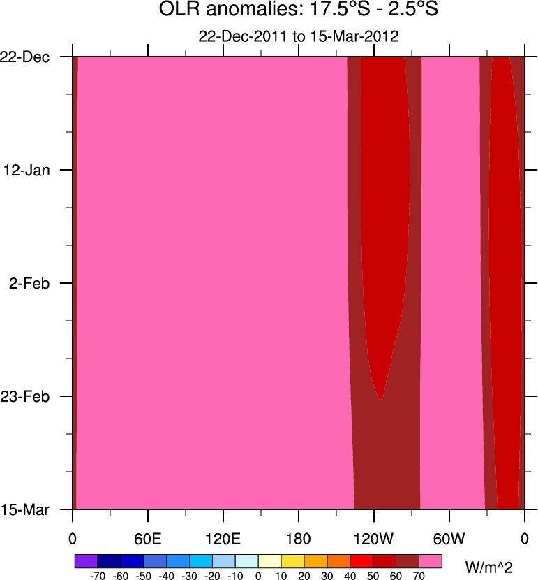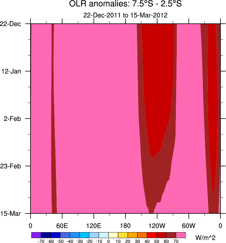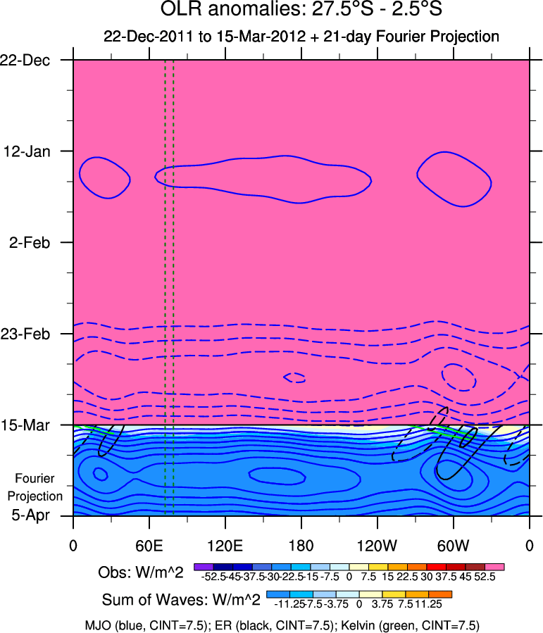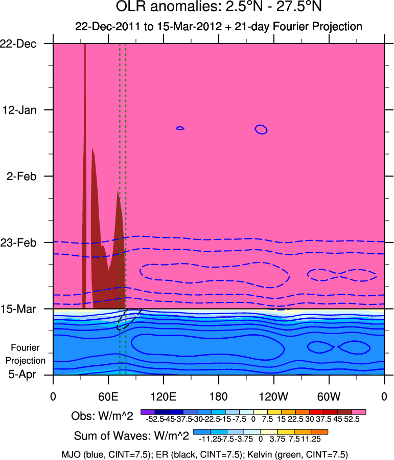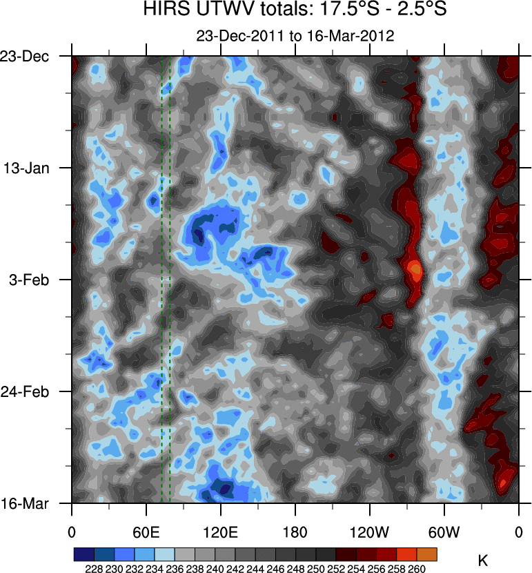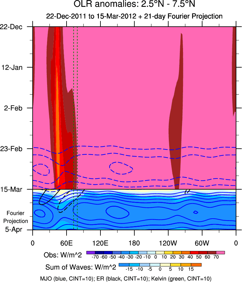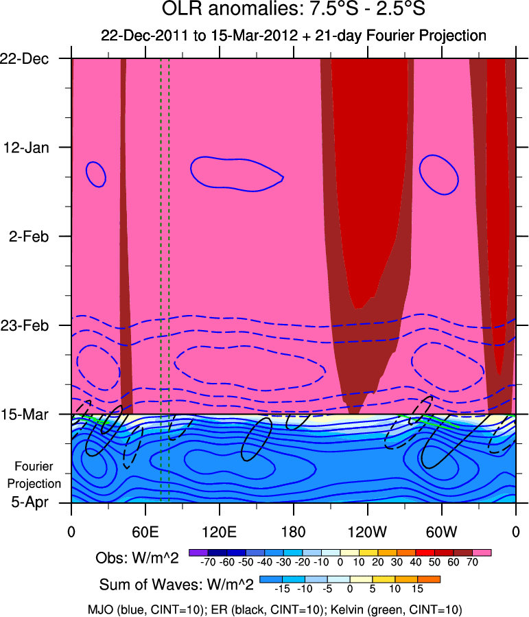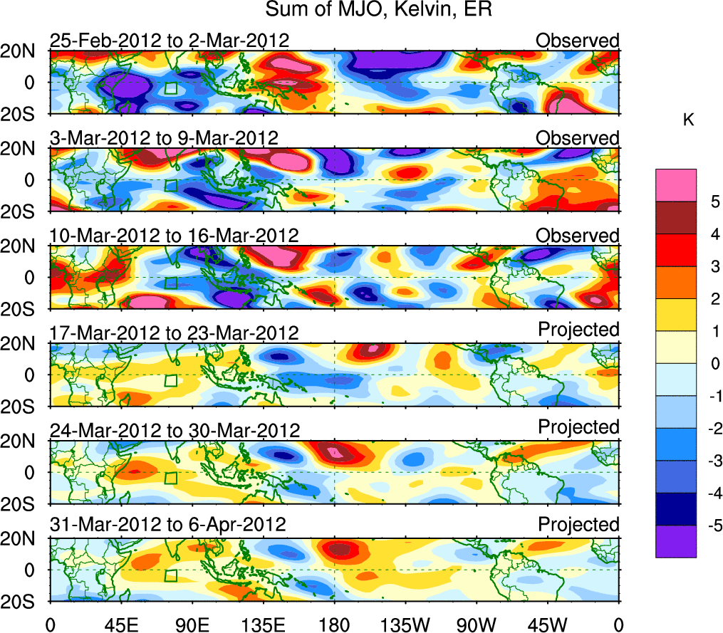To identify tropical waves in near real-time, the OLR and UTWV data are filtered following Wheeler & Weickmann (2001 MWR). The daily anomalies are calculated using the first 3 harmonics of the seasonal cycle for 1979–2009. Missing values are then filled using linear interpolation in space and time. The most recent 365 days of anomalies are padded with 659 days of zeroes, and the result is filtered for each wave type.