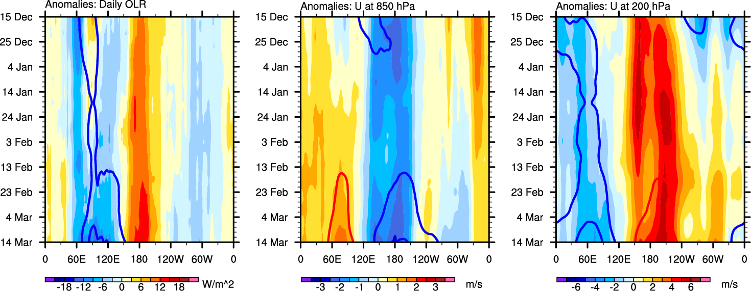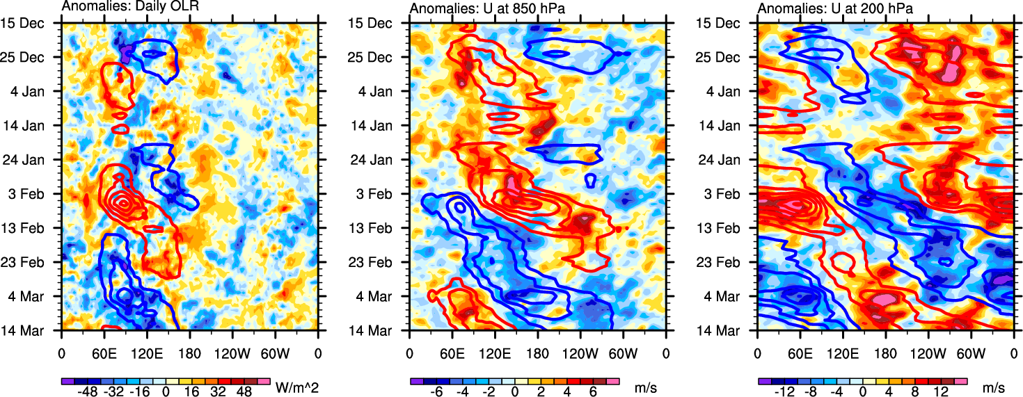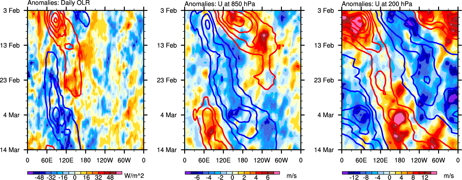 The Hovmollers show longitude-time plots for OLR, U-850, and U-200. The shading indicates the observed anomalies, while the contours are the projection of those anomalies onto the RMM EOFs.