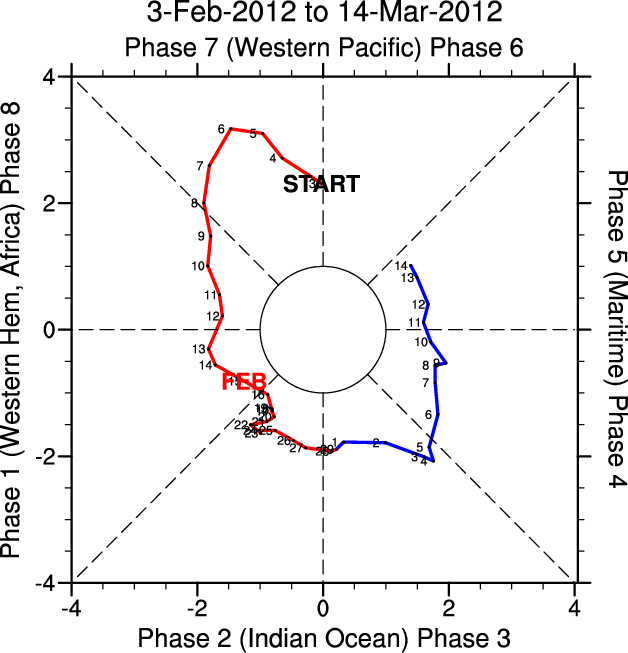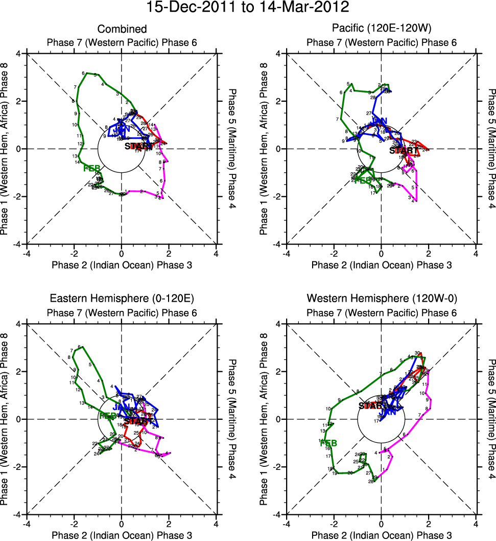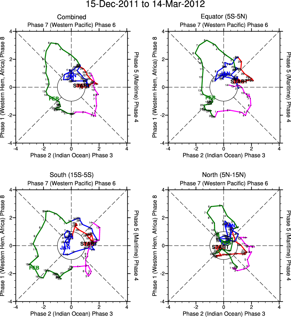 Wheeler and Hendon (2004) constructed the RMM index for monitoring the MJO. This index consists of the first two principal components (PCs) of OLR, 850-hPa zonal wind, and 200-hPa zonal wind averaged 15S-15N.