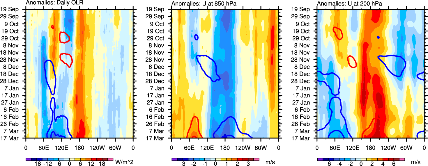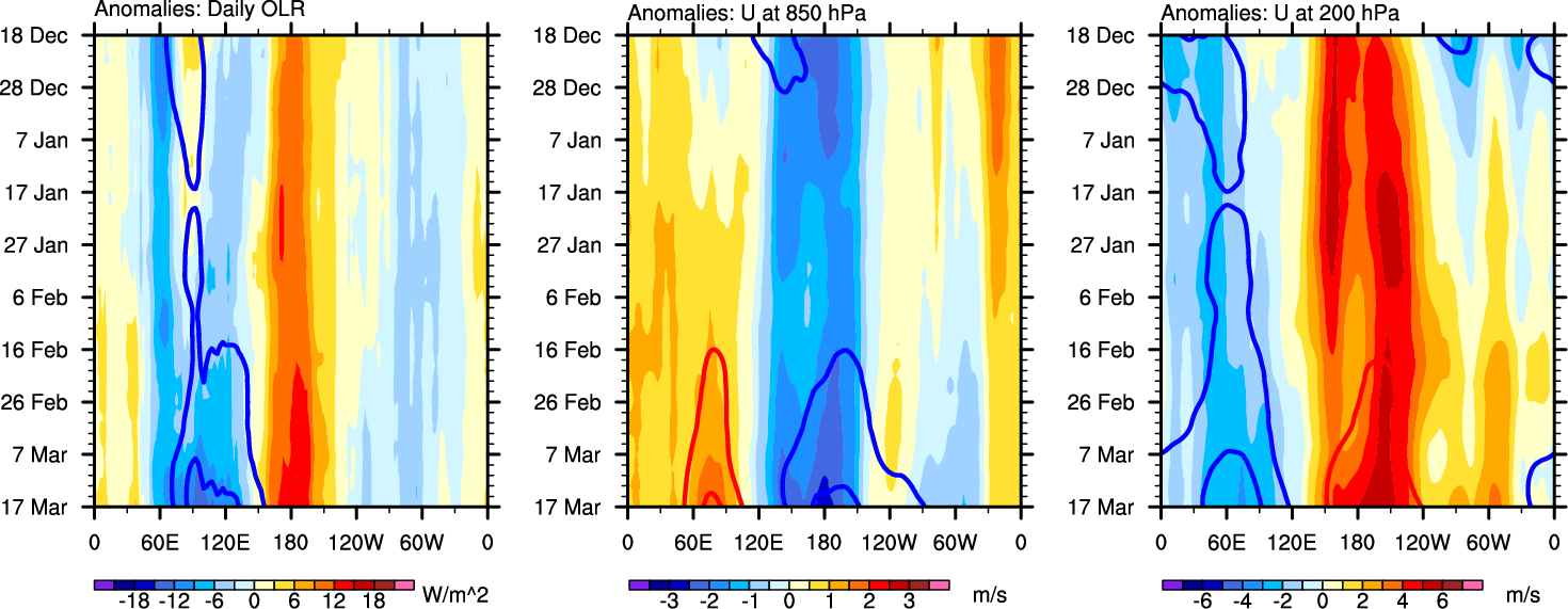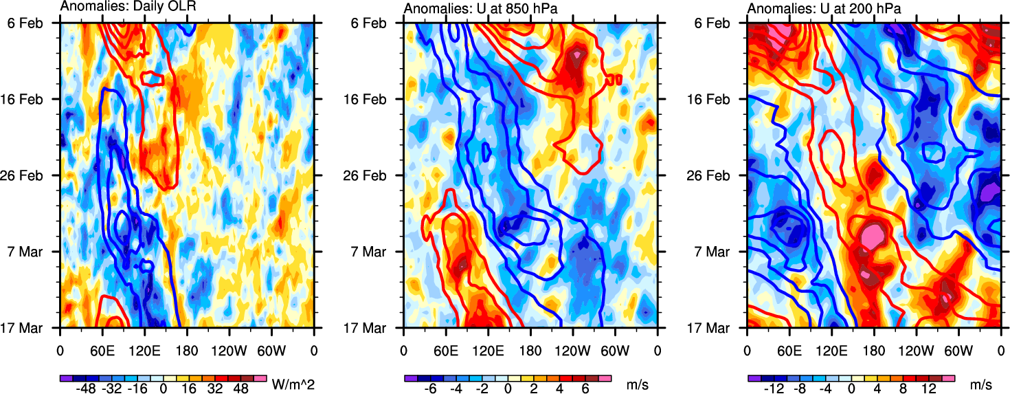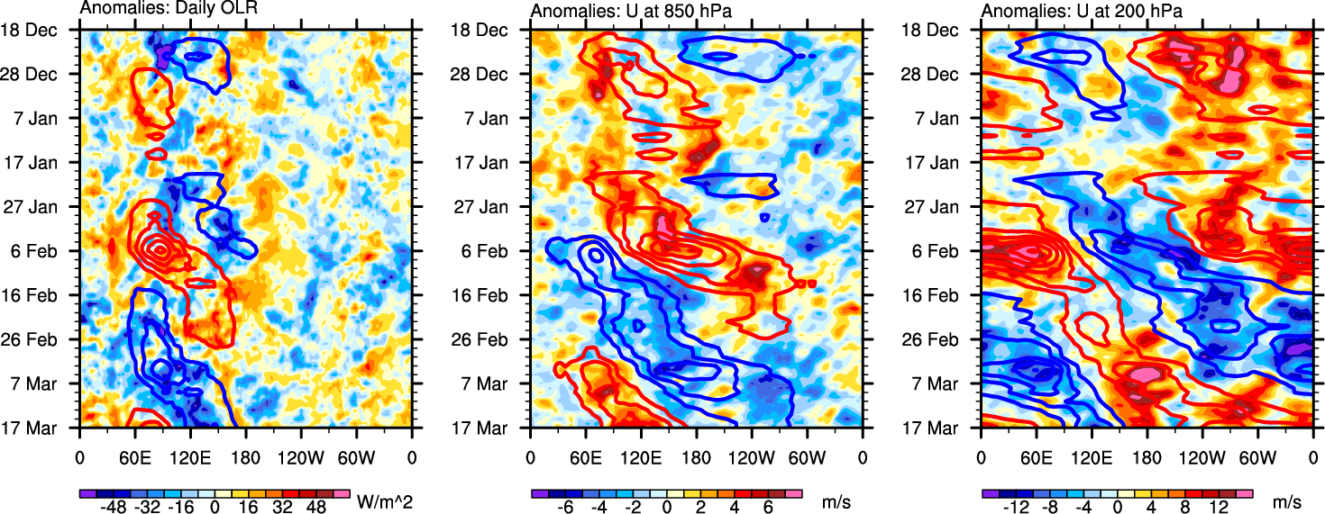 The Hovmollers show longitude-time plots for OLR, U-850, and U-200. The shading indicates the observed anomalies, while the contours are the projection of those anomalies onto the RMM EOFs.