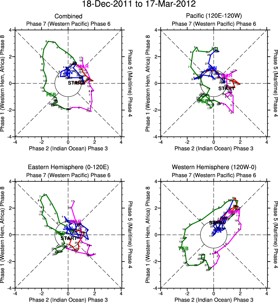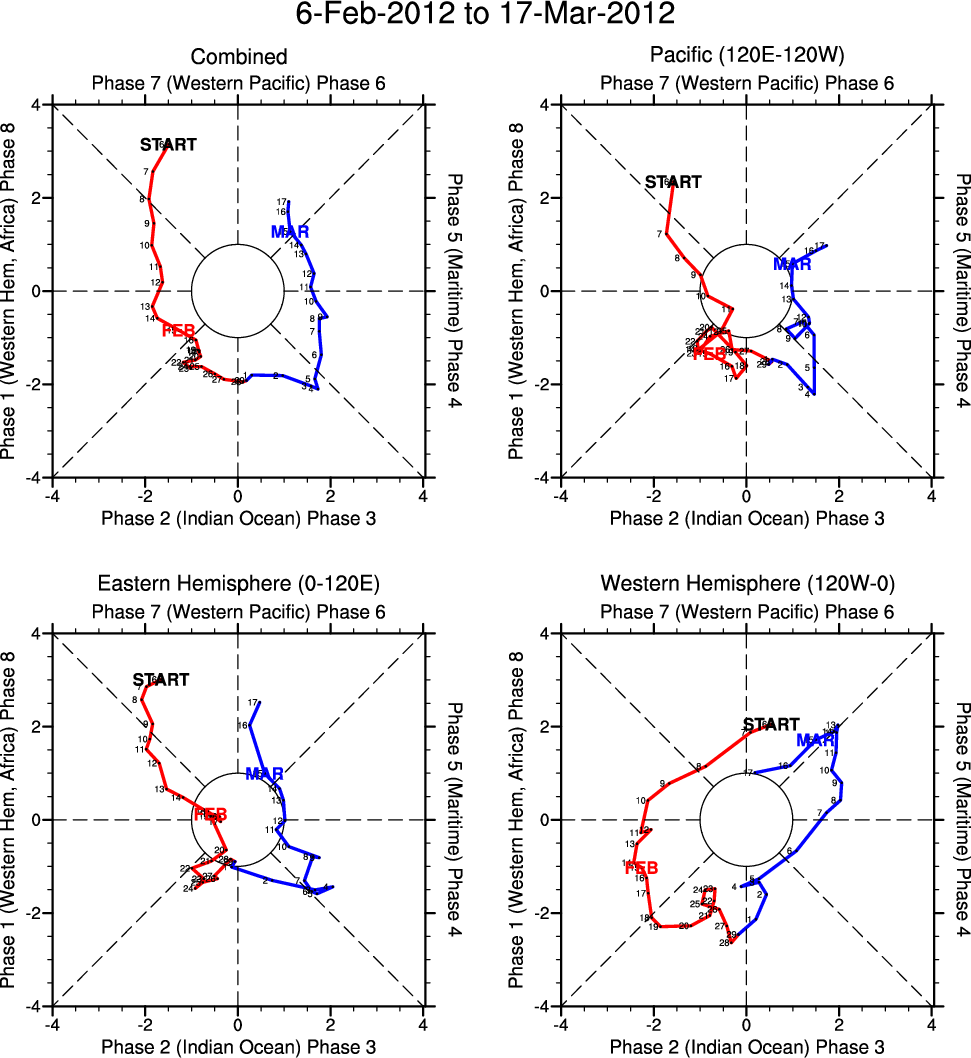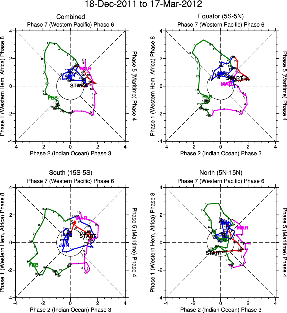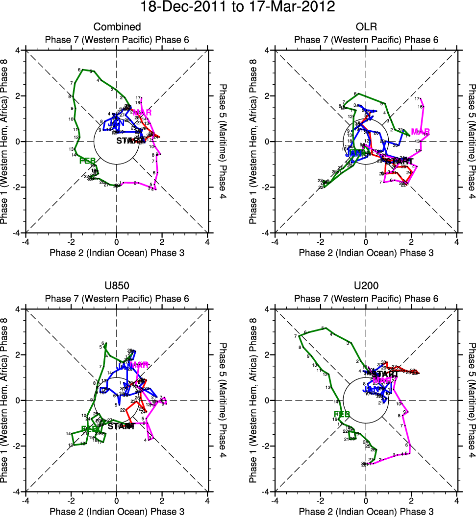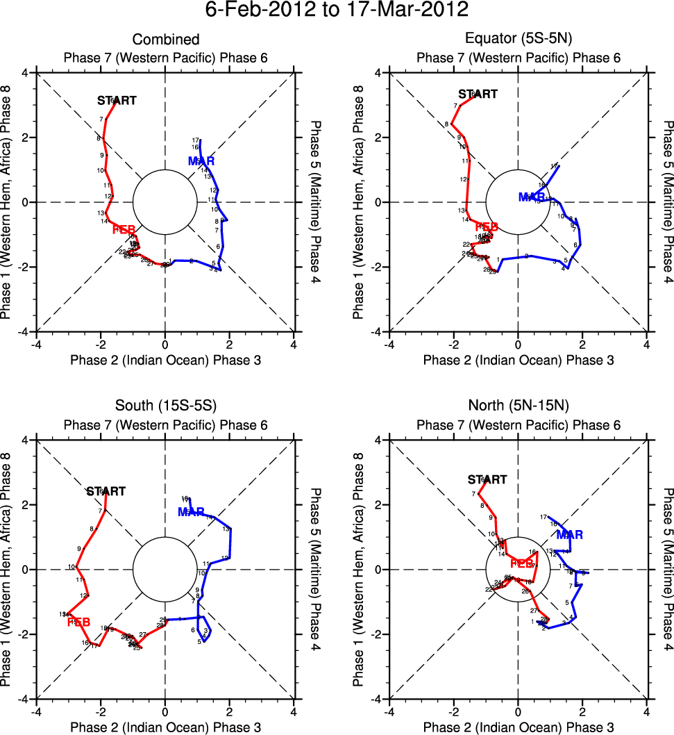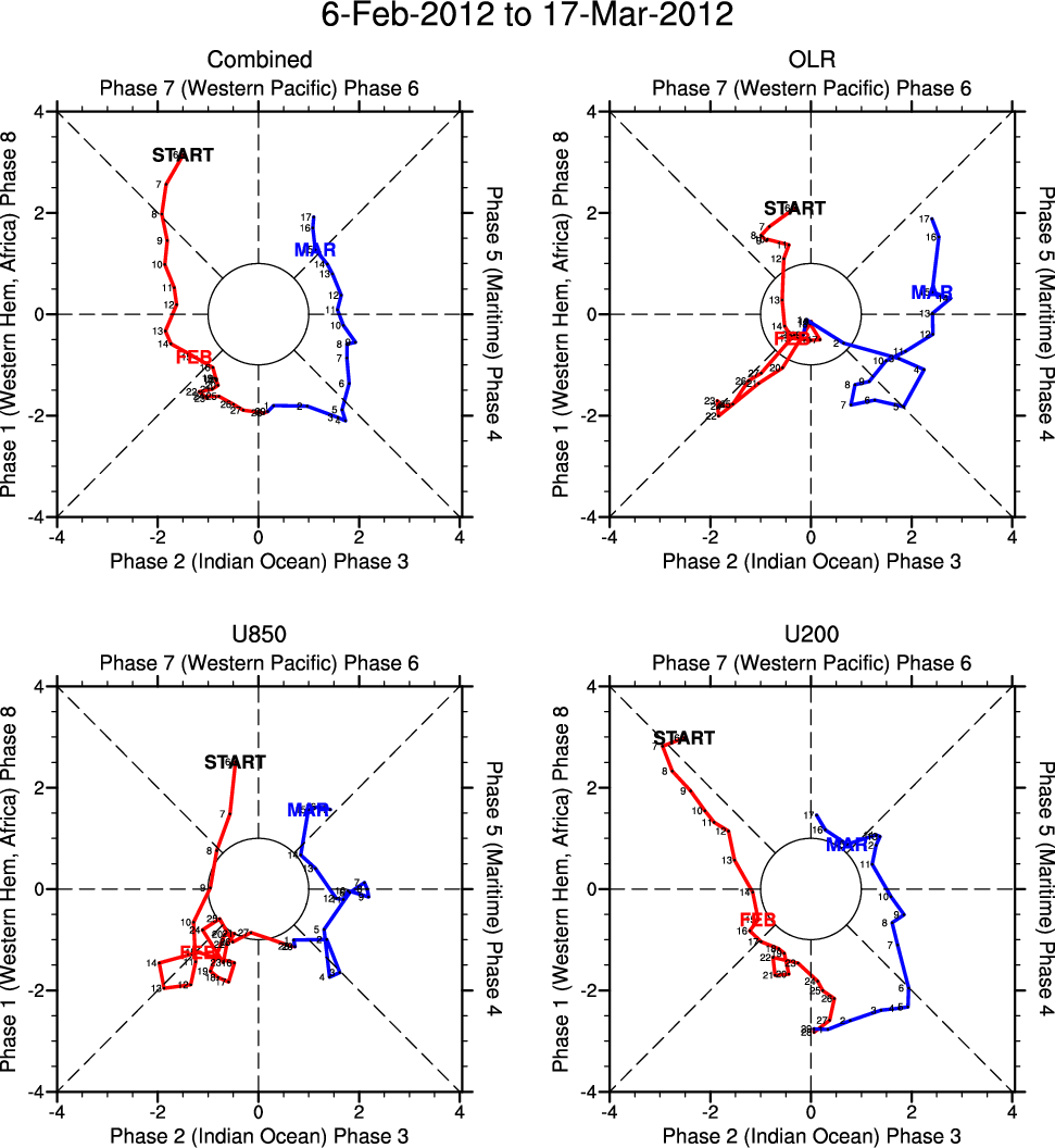 Wheeler and Hendon (2004) constructed the RMM index for monitoring the MJO. This index consists of the first two principal components (PCs) of OLR, 850-hPa zonal wind, and 200-hPa zonal wind averaged 15S-15N.