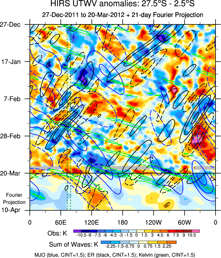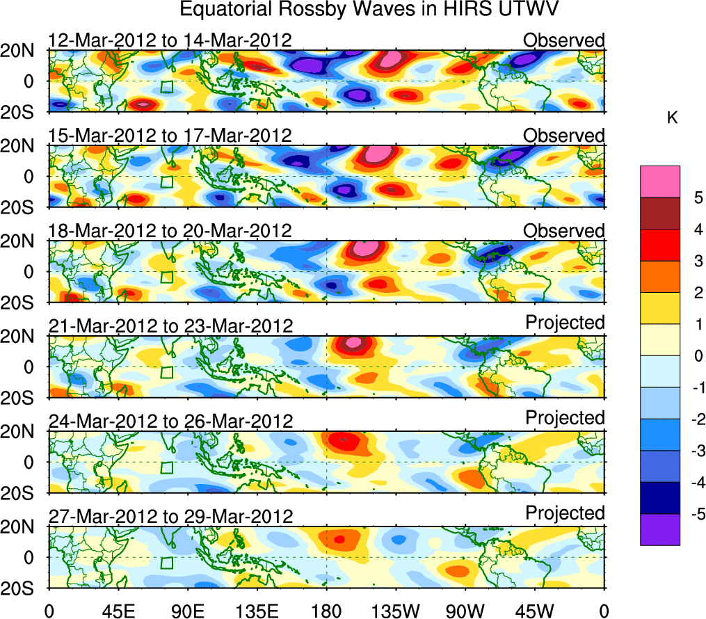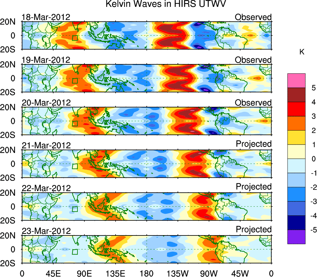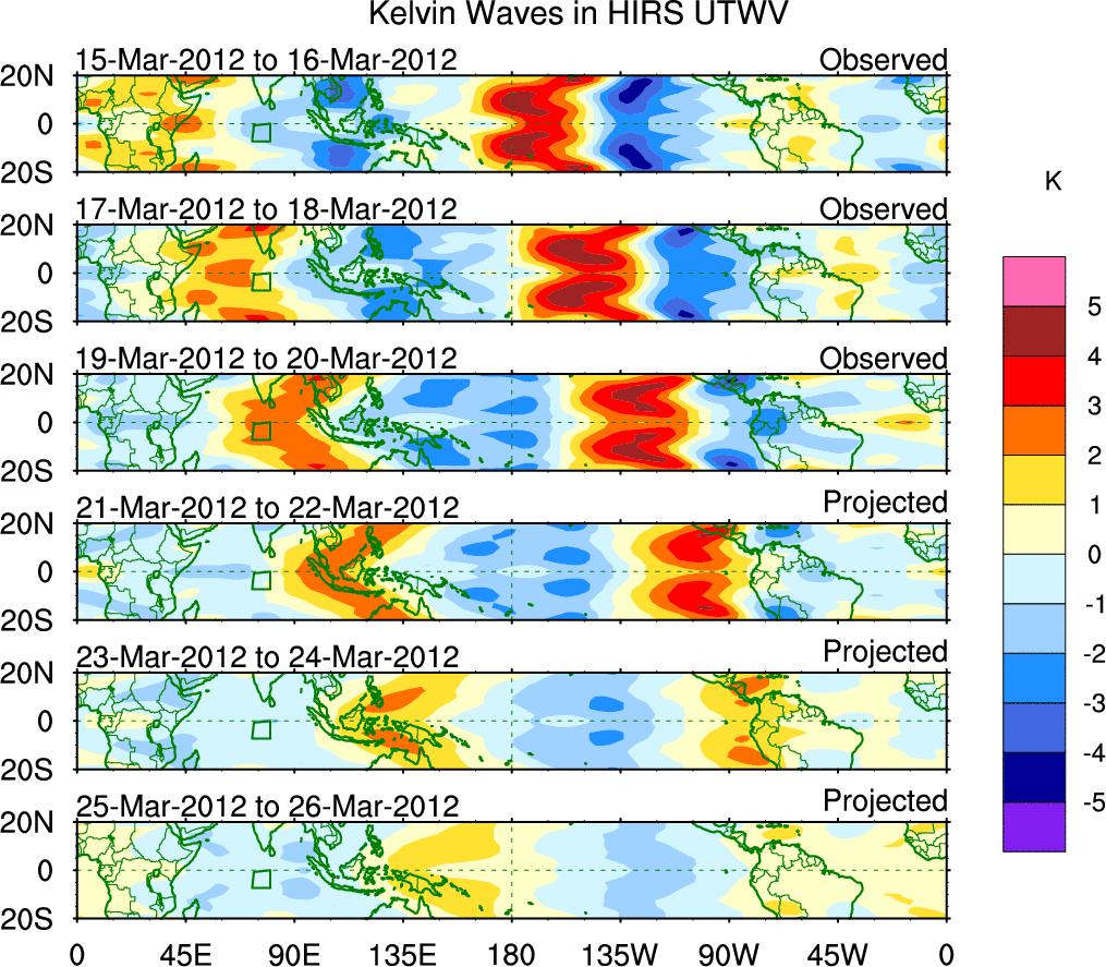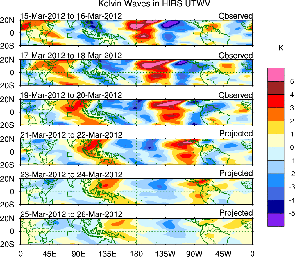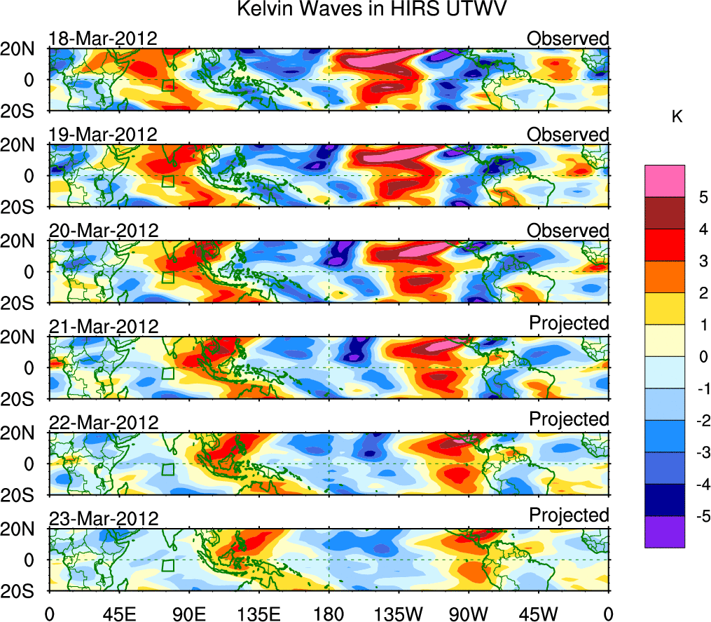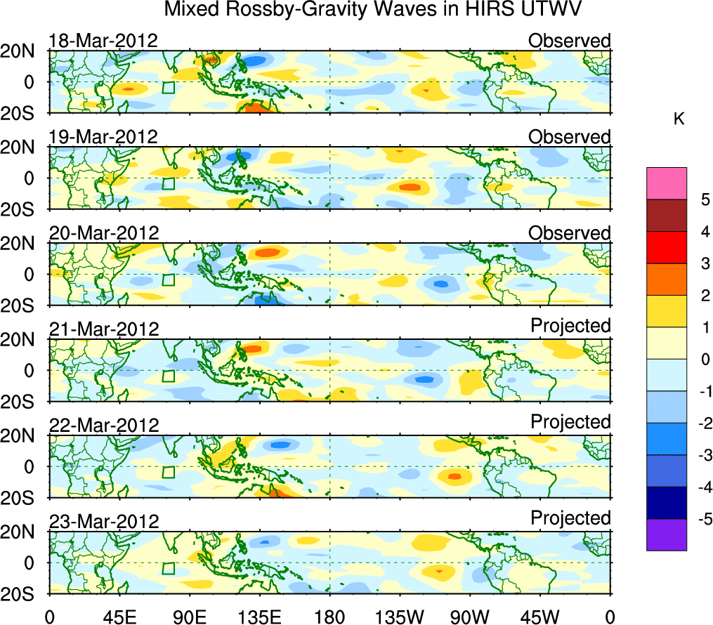 To identify tropical waves in near real-time, the OLR and UTWV data are filtered following Wheeler & Weickmann (2001 MWR). The daily anomalies are calculated using the first 3 harmonics of the seasonal cycle for 1979–2009. Missing values are then filled using linear interpolation in space and time. The most recent 365 days of anomalies are padded with 659 days of zeroes, and the result is filtered for each wave type.