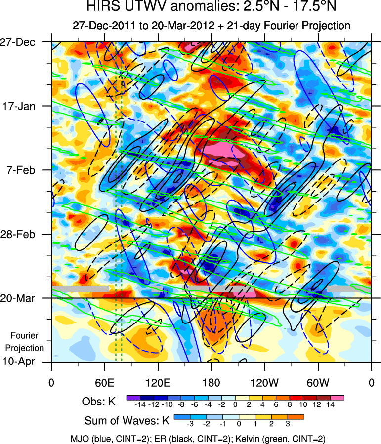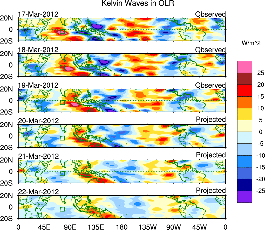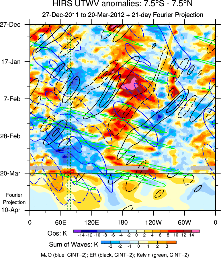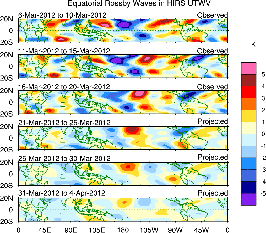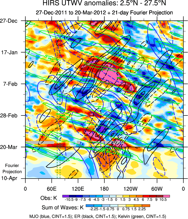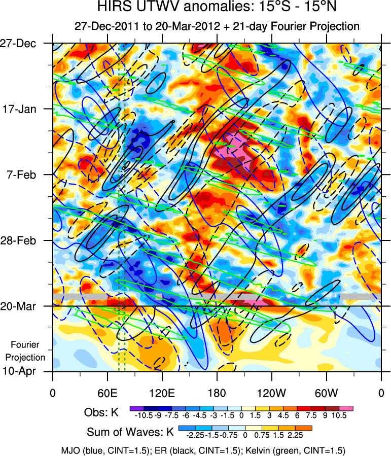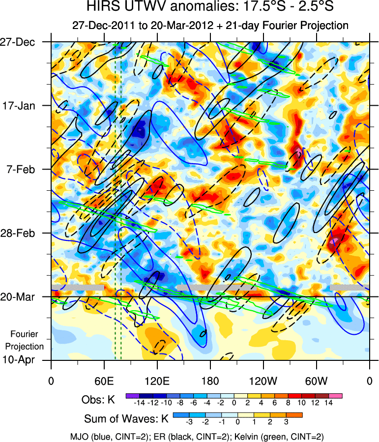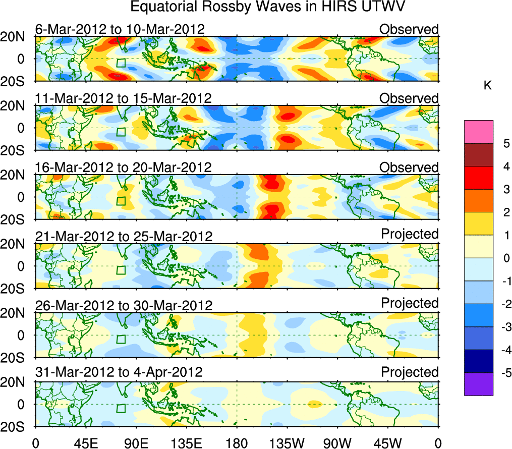 To identify tropical waves in near real-time, the OLR and UTWV data are filtered following Wheeler & Weickmann (2001 MWR). The daily anomalies are calculated using the first 3 harmonics of the seasonal cycle for 1979–2009. Missing values are then filled using linear interpolation in space and time. The most recent 365 days of anomalies are padded with 659 days of zeroes, and the result is filtered for each wave type.