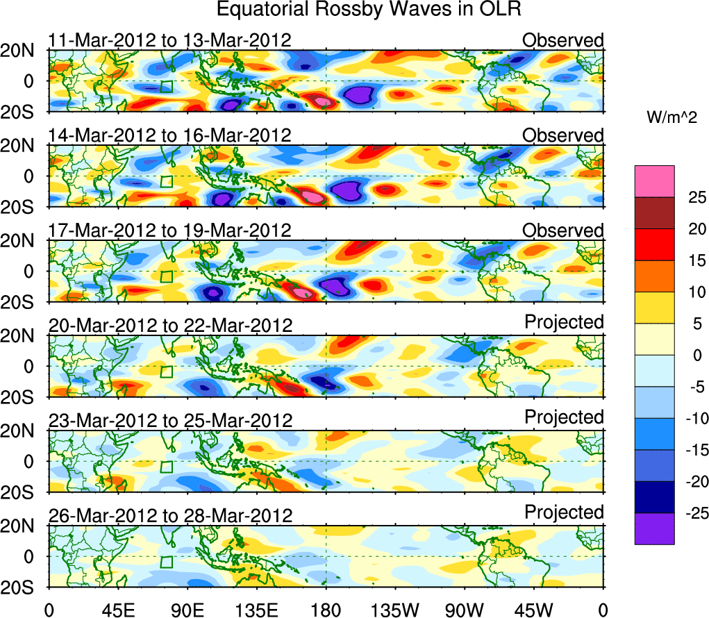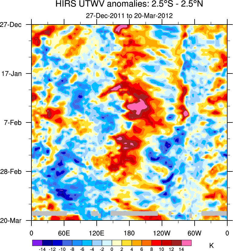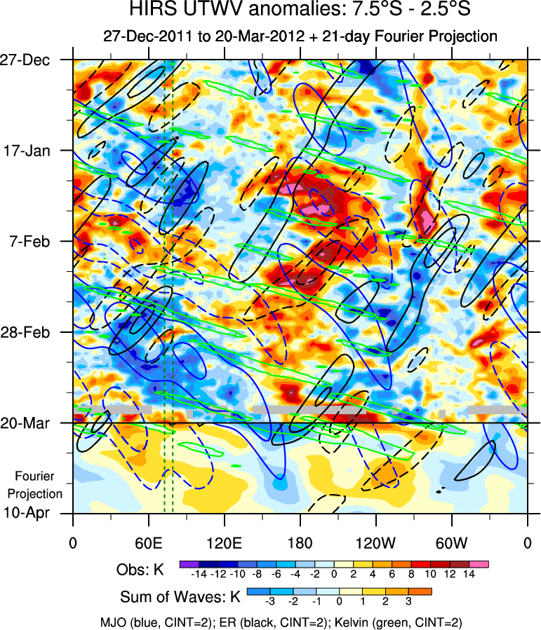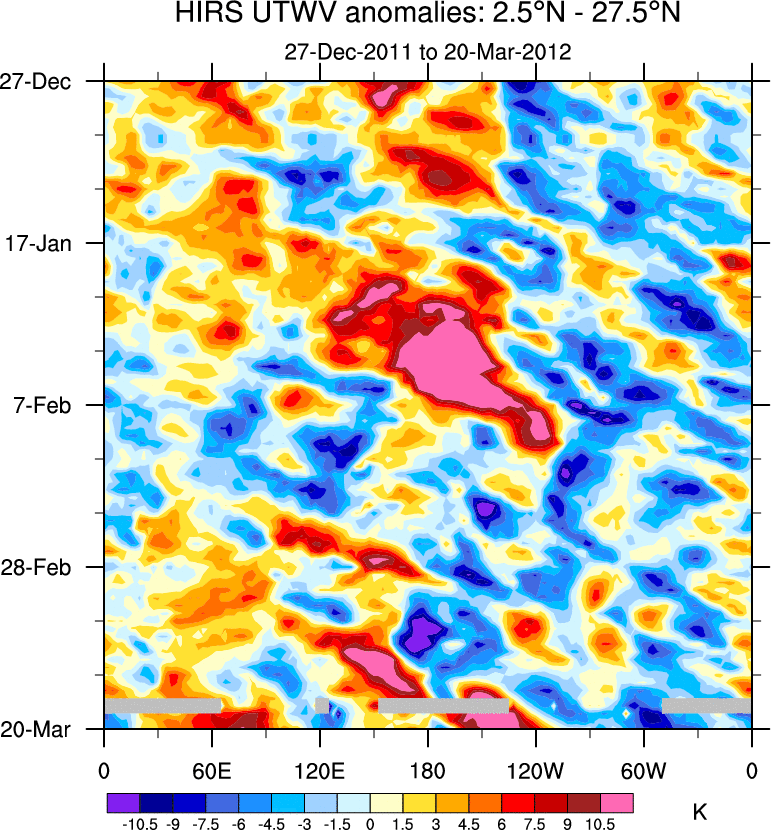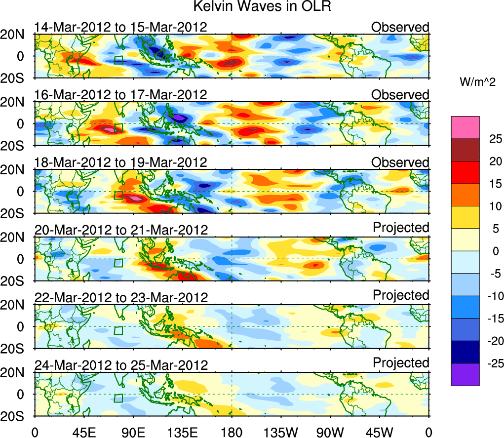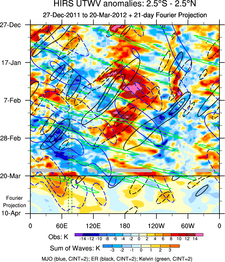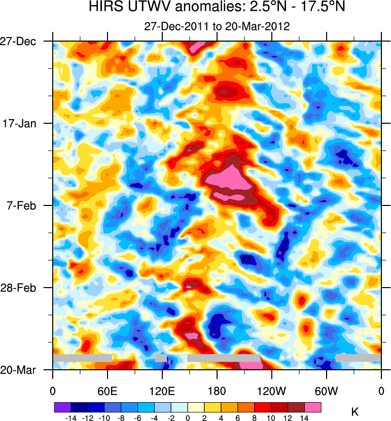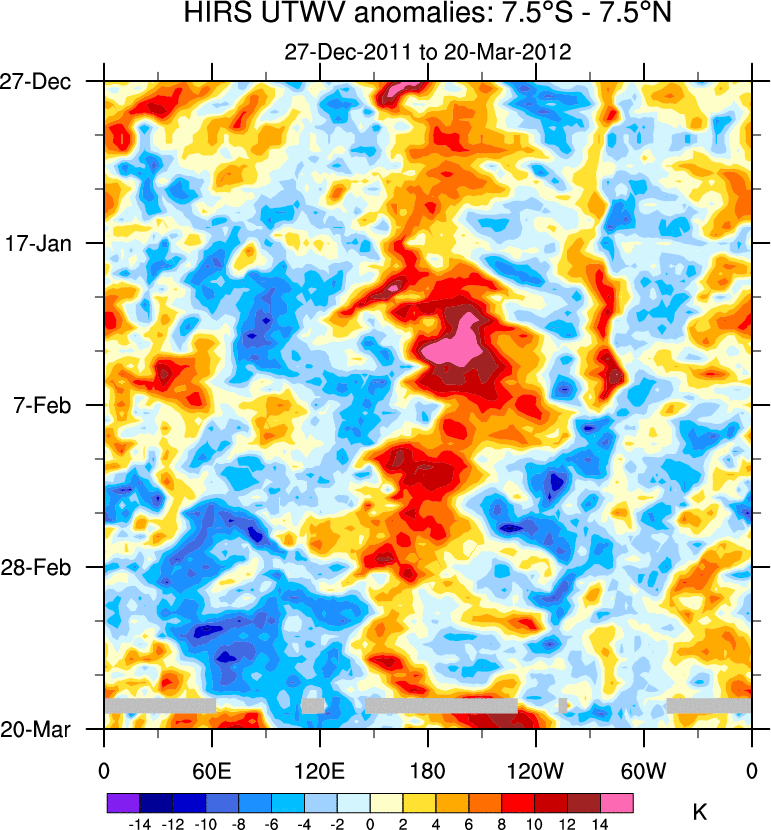 To identify tropical waves in near real-time, the OLR and UTWV data are filtered following Wheeler & Weickmann (2001 MWR). The daily anomalies are calculated using the first 3 harmonics of the seasonal cycle for 1979–2009. Missing values are then filled using linear interpolation in space and time. The most recent 365 days of anomalies are padded with 659 days of zeroes, and the result is filtered for each wave type.