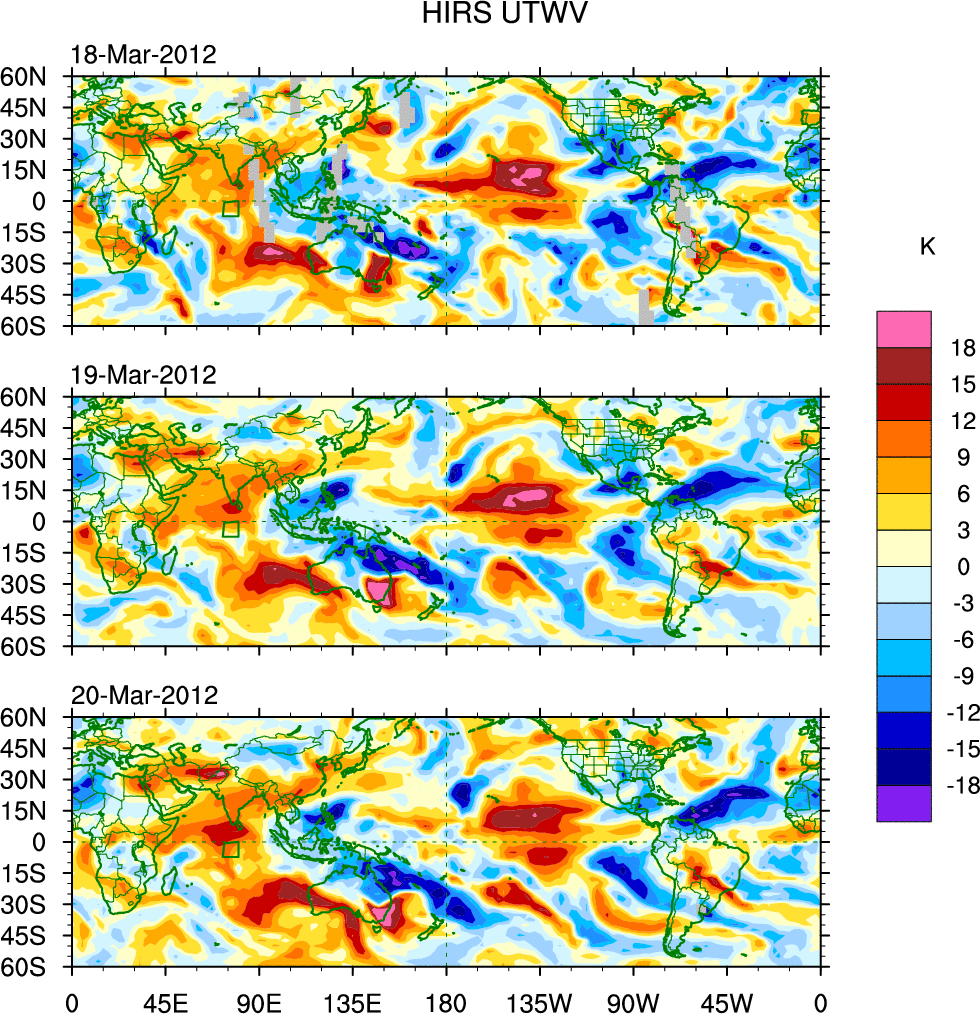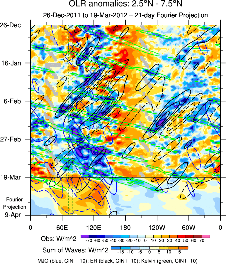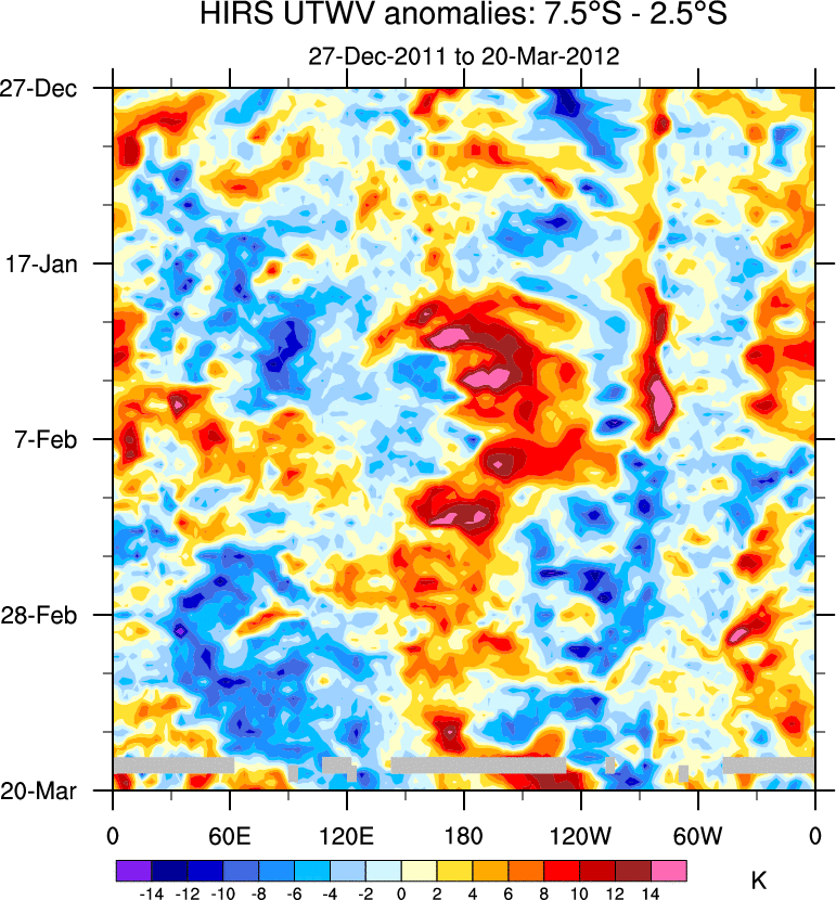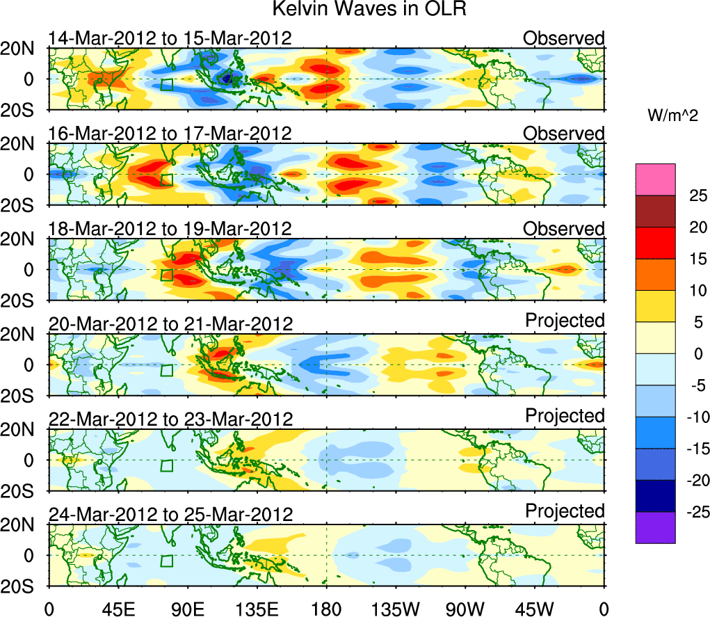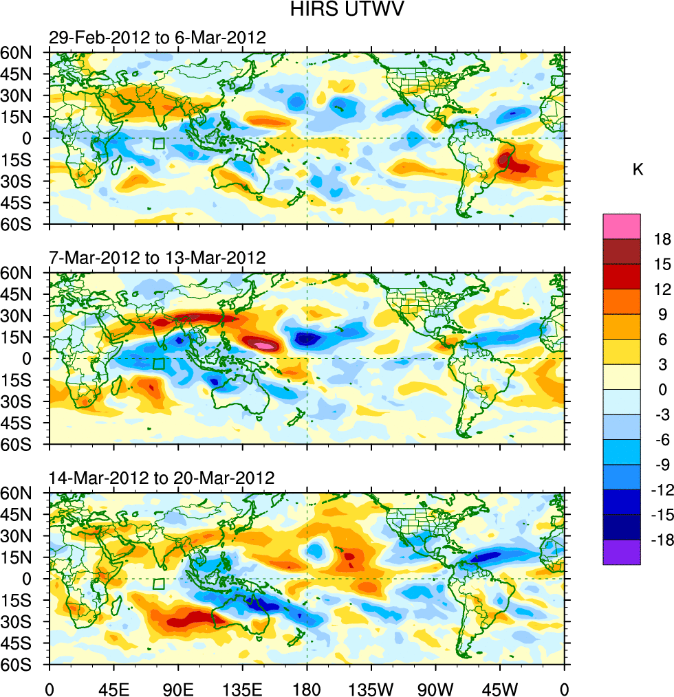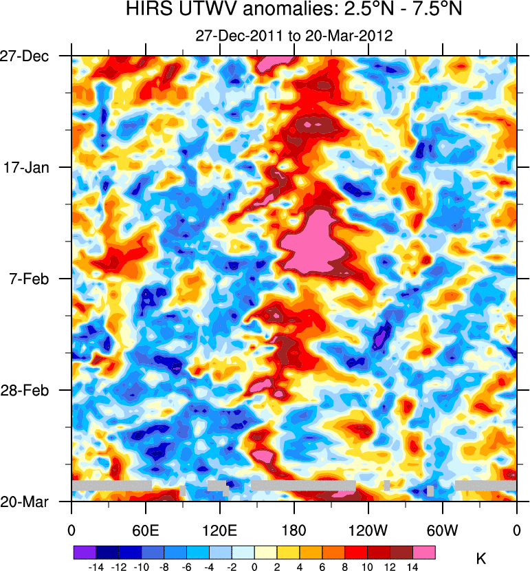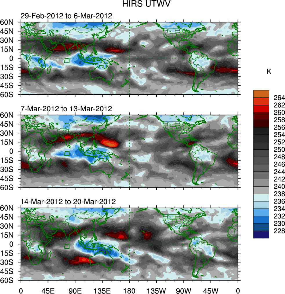 To identify tropical waves in near real-time, the OLR and UTWV data are filtered following Wheeler & Weickmann (2001 MWR). The daily anomalies are calculated using the first 3 harmonics of the seasonal cycle for 1979–2009. Missing values are then filled using linear interpolation in space and time. The most recent 365 days of anomalies are padded with 659 days of zeroes, and the result is filtered for each wave type.