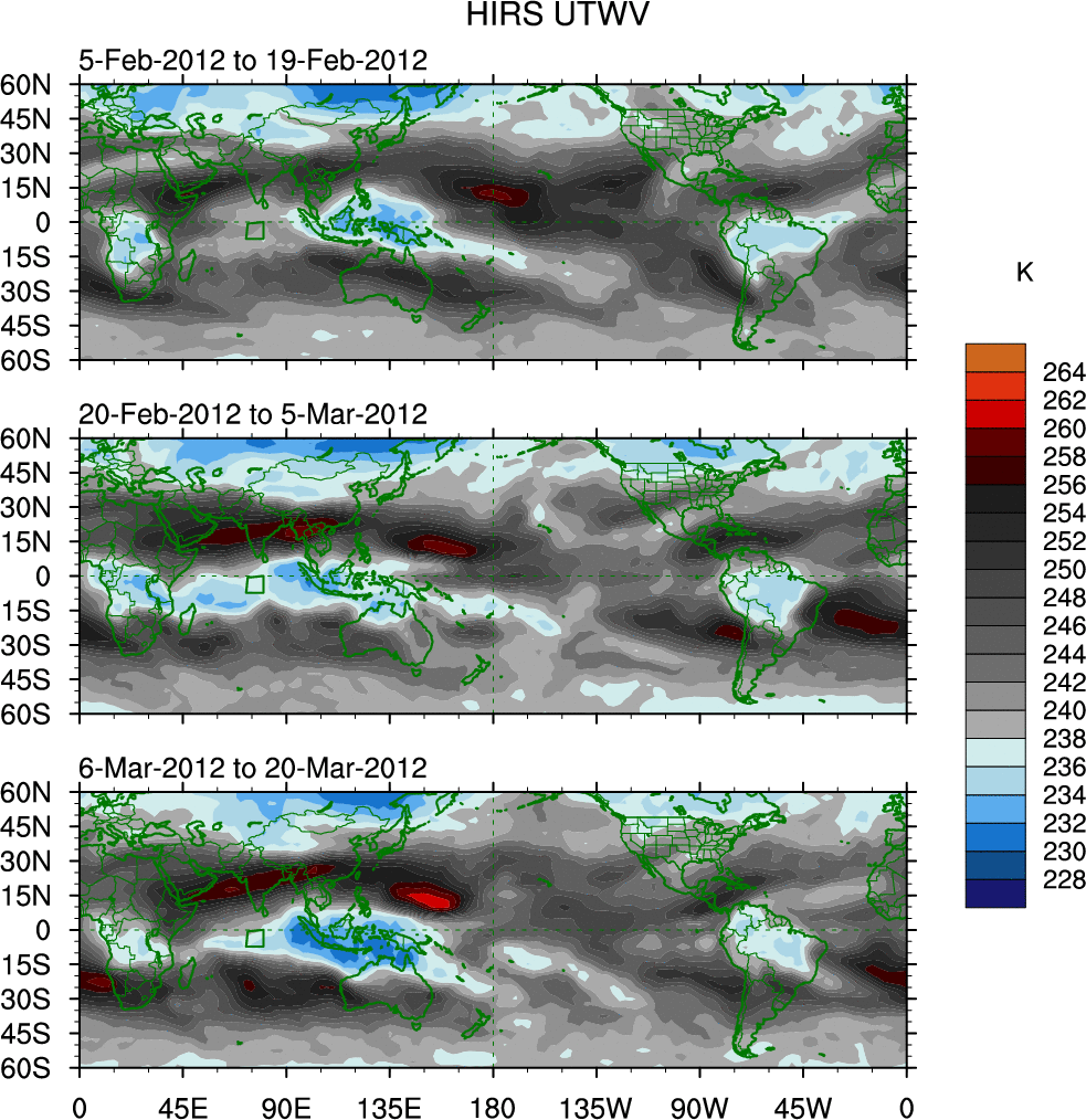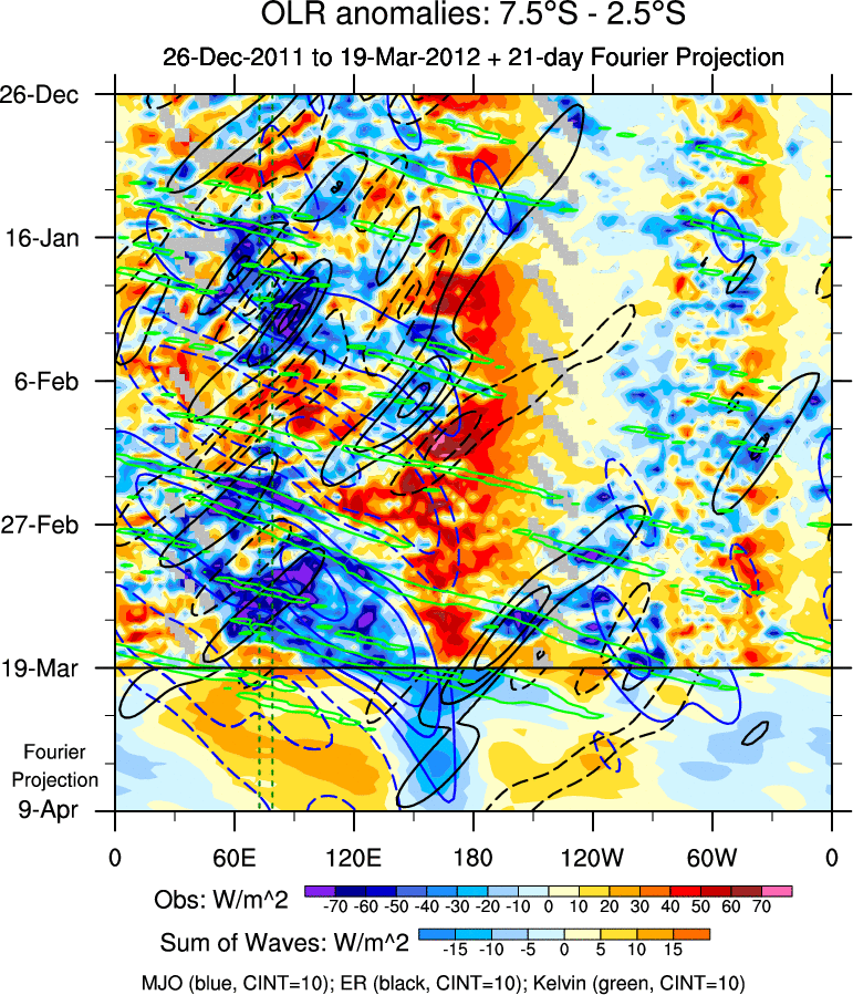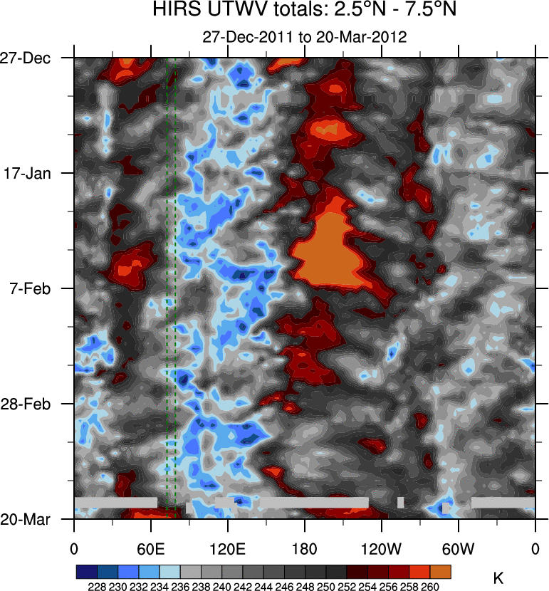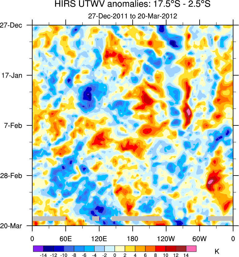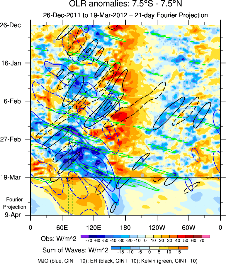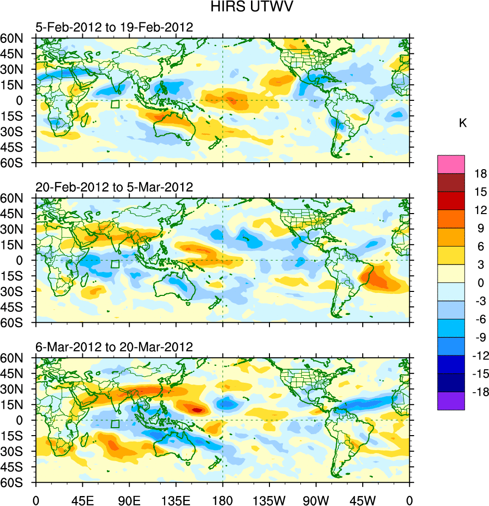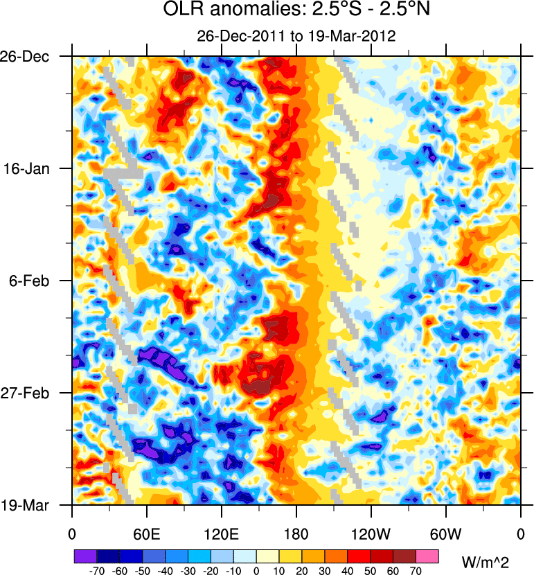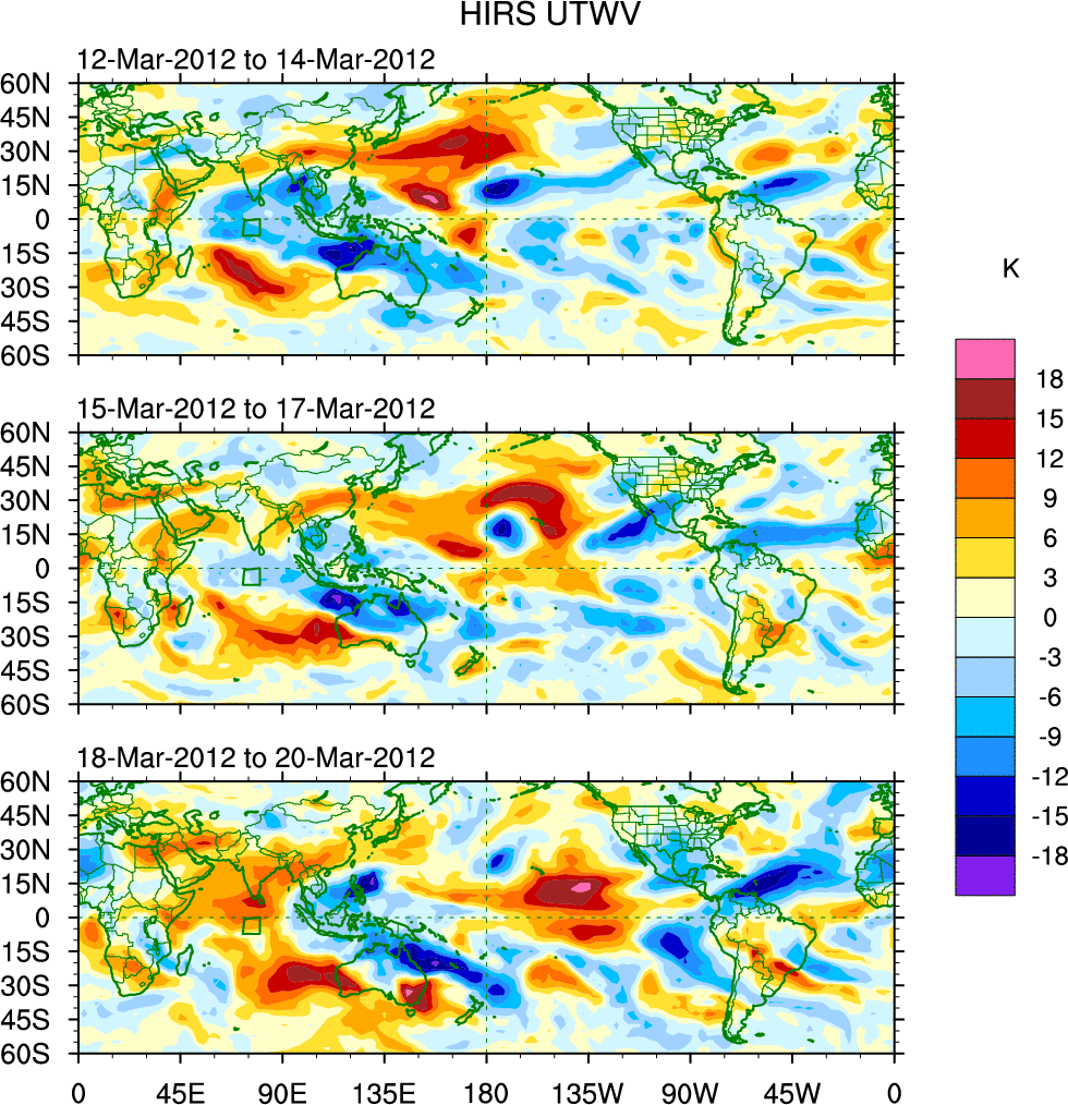 To identify tropical waves in near real-time, the OLR and UTWV data are filtered following Wheeler & Weickmann (2001 MWR). The daily anomalies are calculated using the first 3 harmonics of the seasonal cycle for 1979–2009. Missing values are then filled using linear interpolation in space and time. The most recent 365 days of anomalies are padded with 659 days of zeroes, and the result is filtered for each wave type.