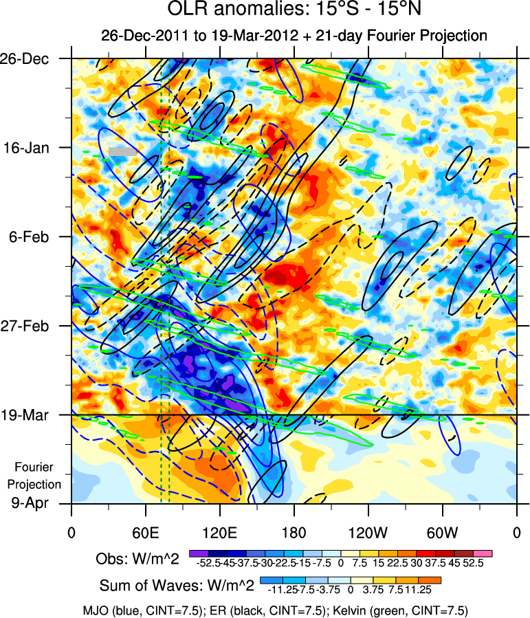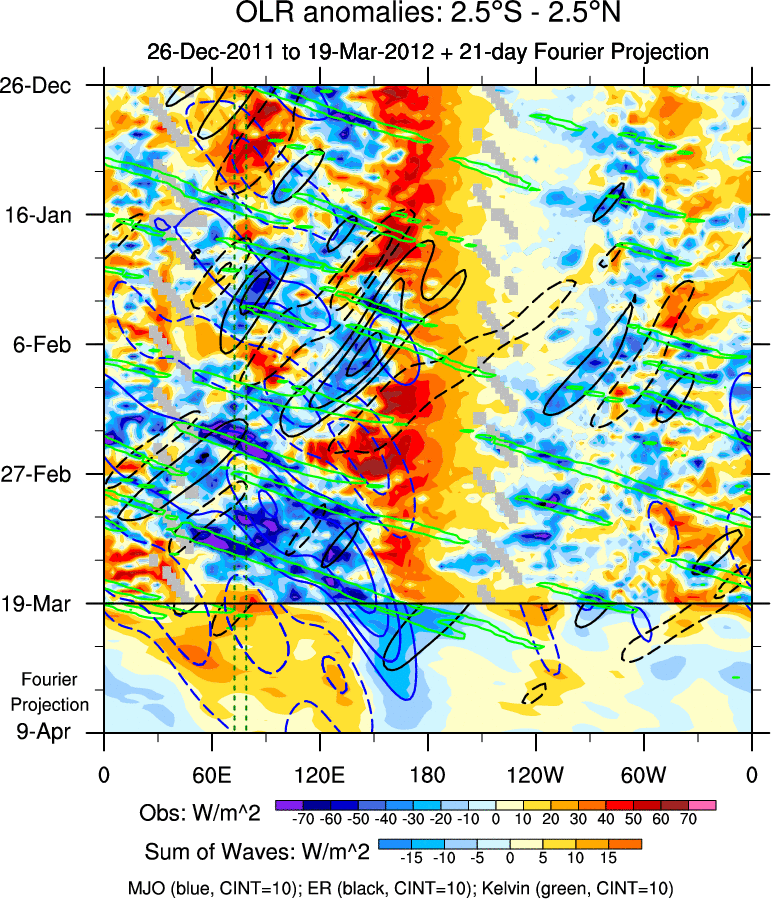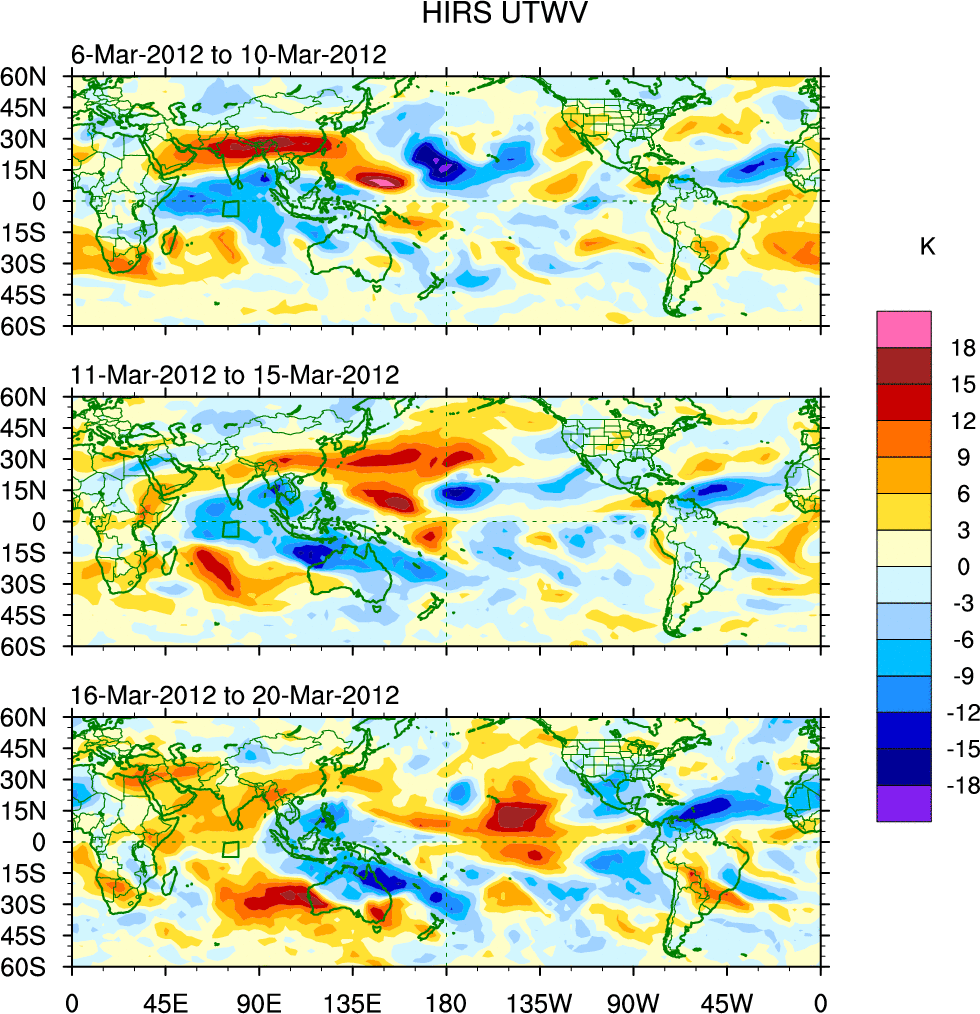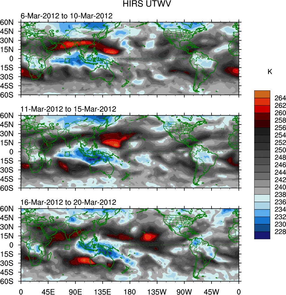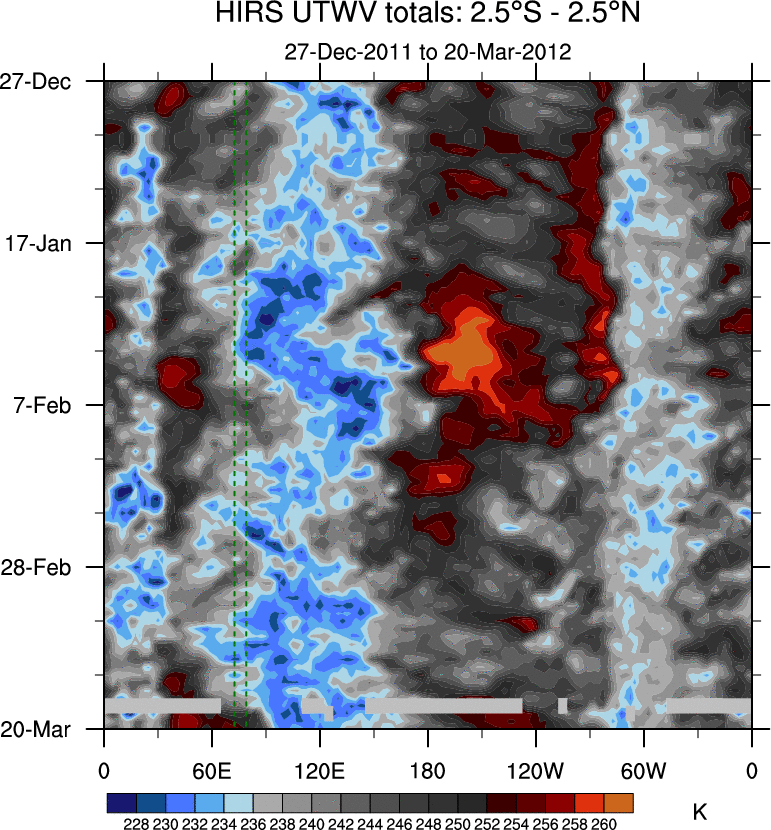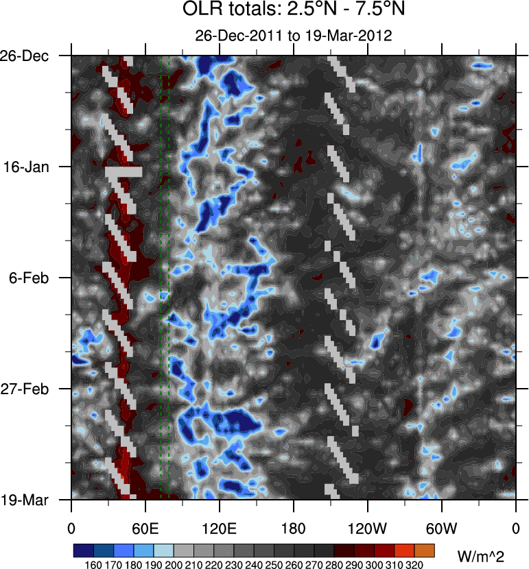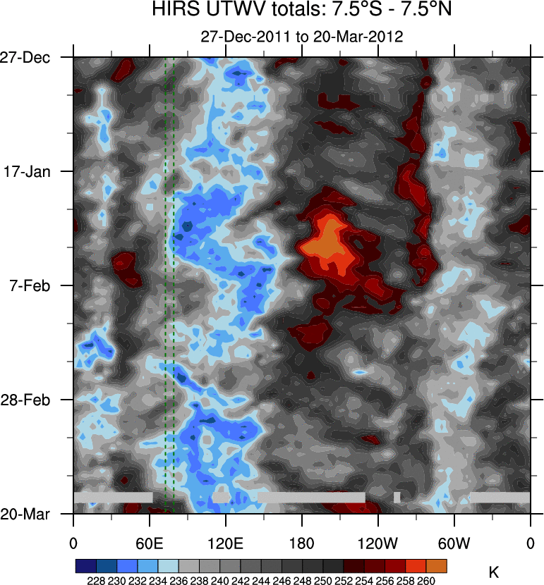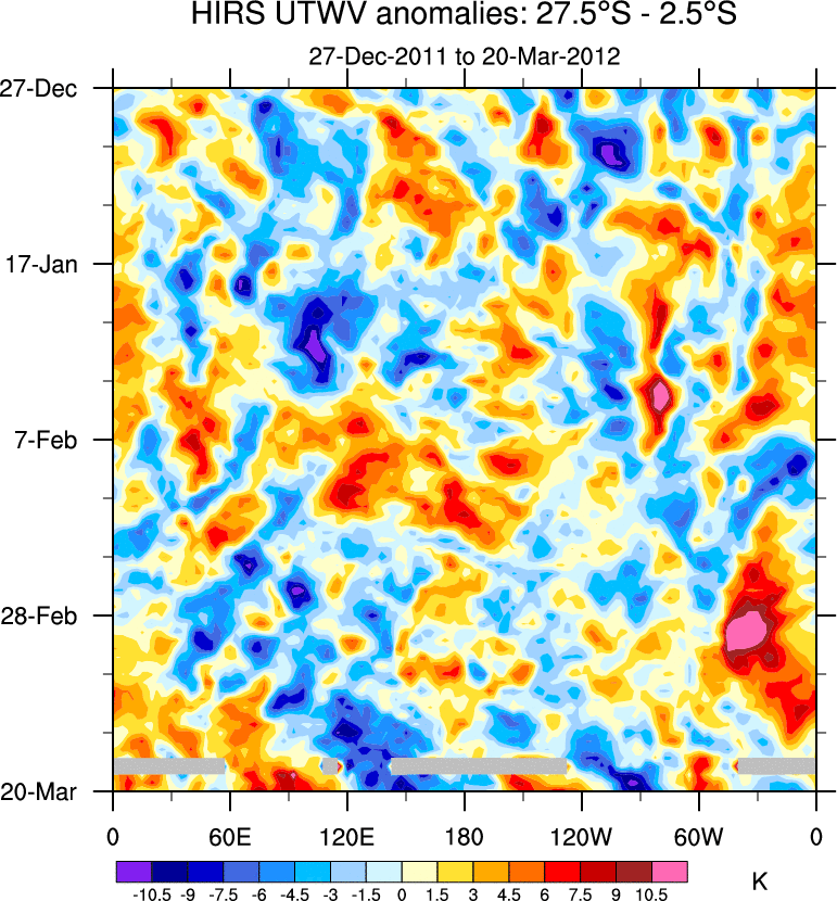 To identify tropical waves in near real-time, the OLR and UTWV data are filtered following Wheeler & Weickmann (2001 MWR). The daily anomalies are calculated using the first 3 harmonics of the seasonal cycle for 1979–2009. Missing values are then filled using linear interpolation in space and time. The most recent 365 days of anomalies are padded with 659 days of zeroes, and the result is filtered for each wave type.