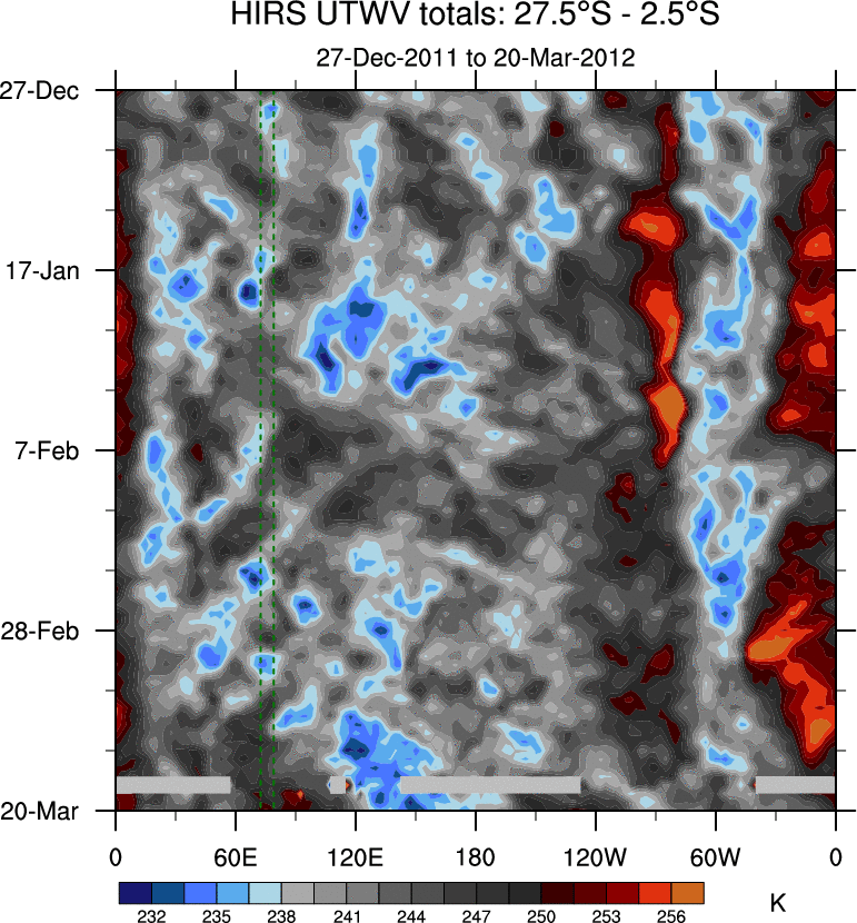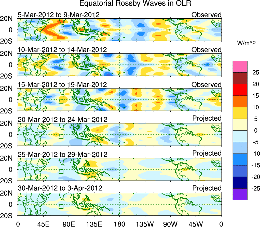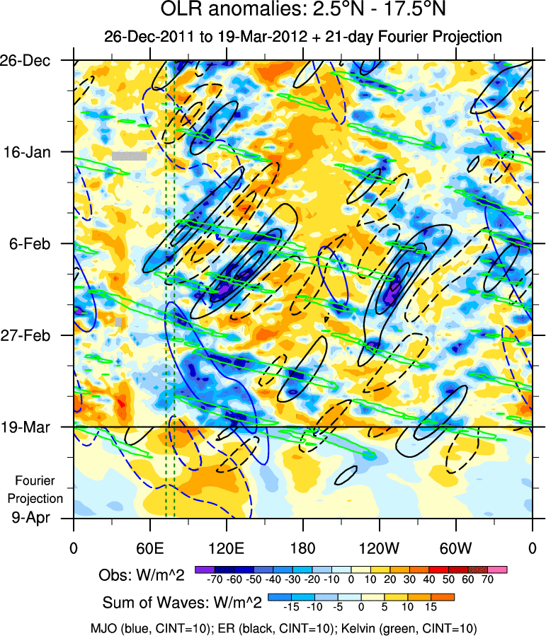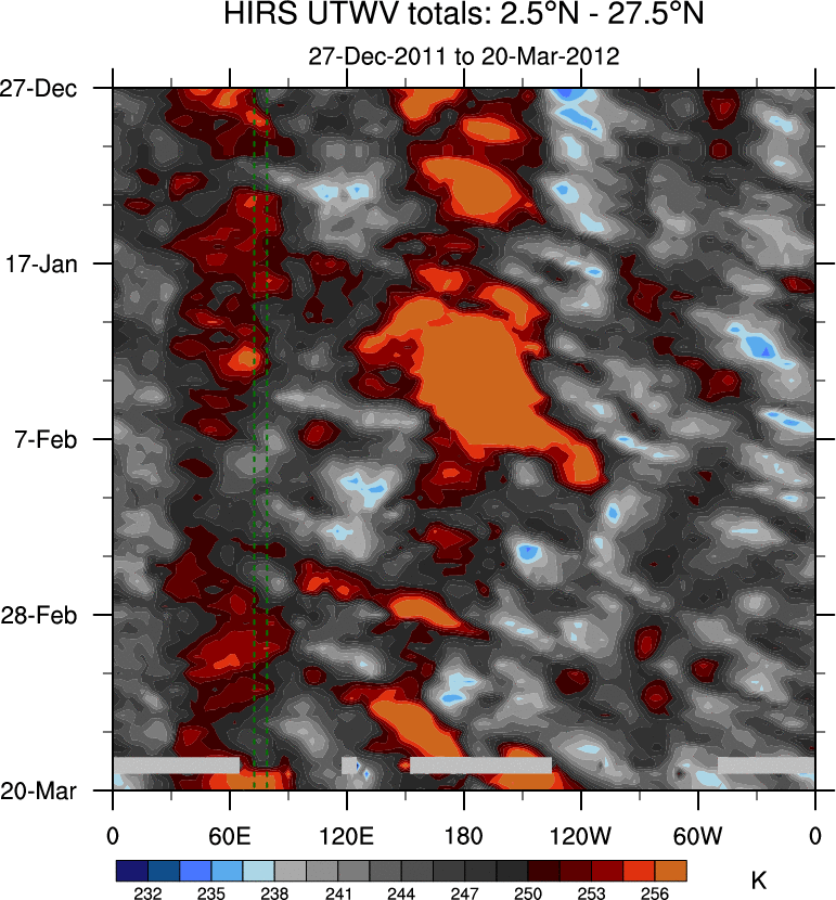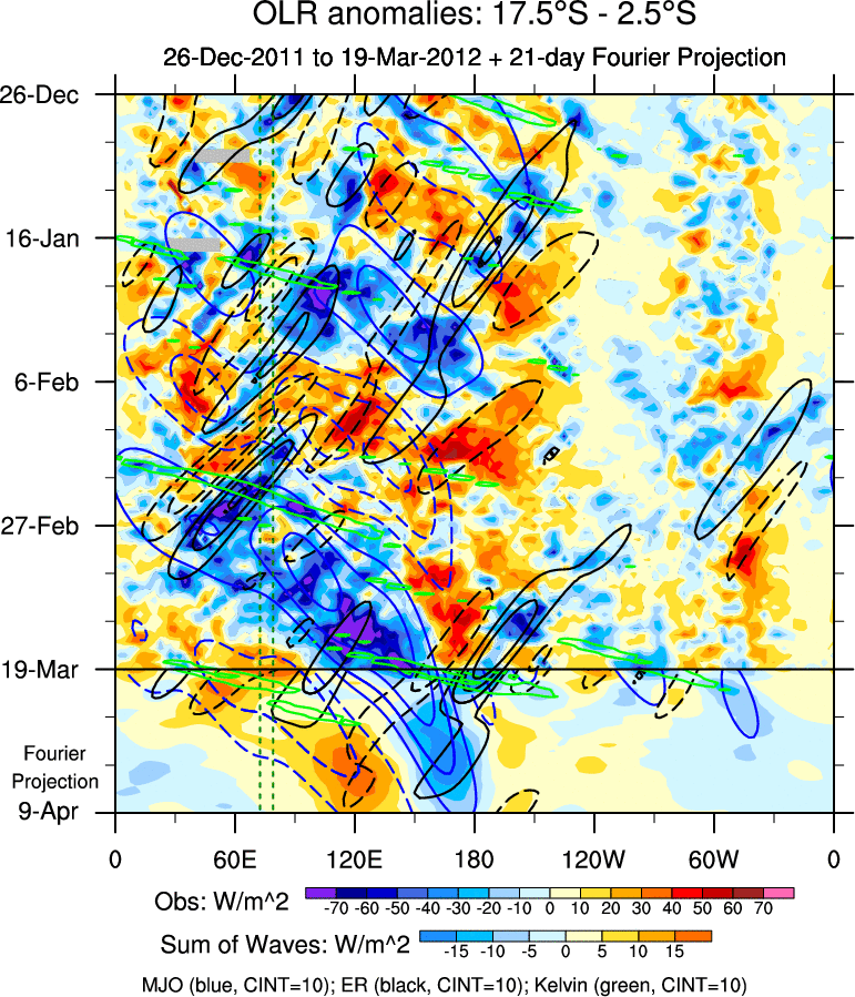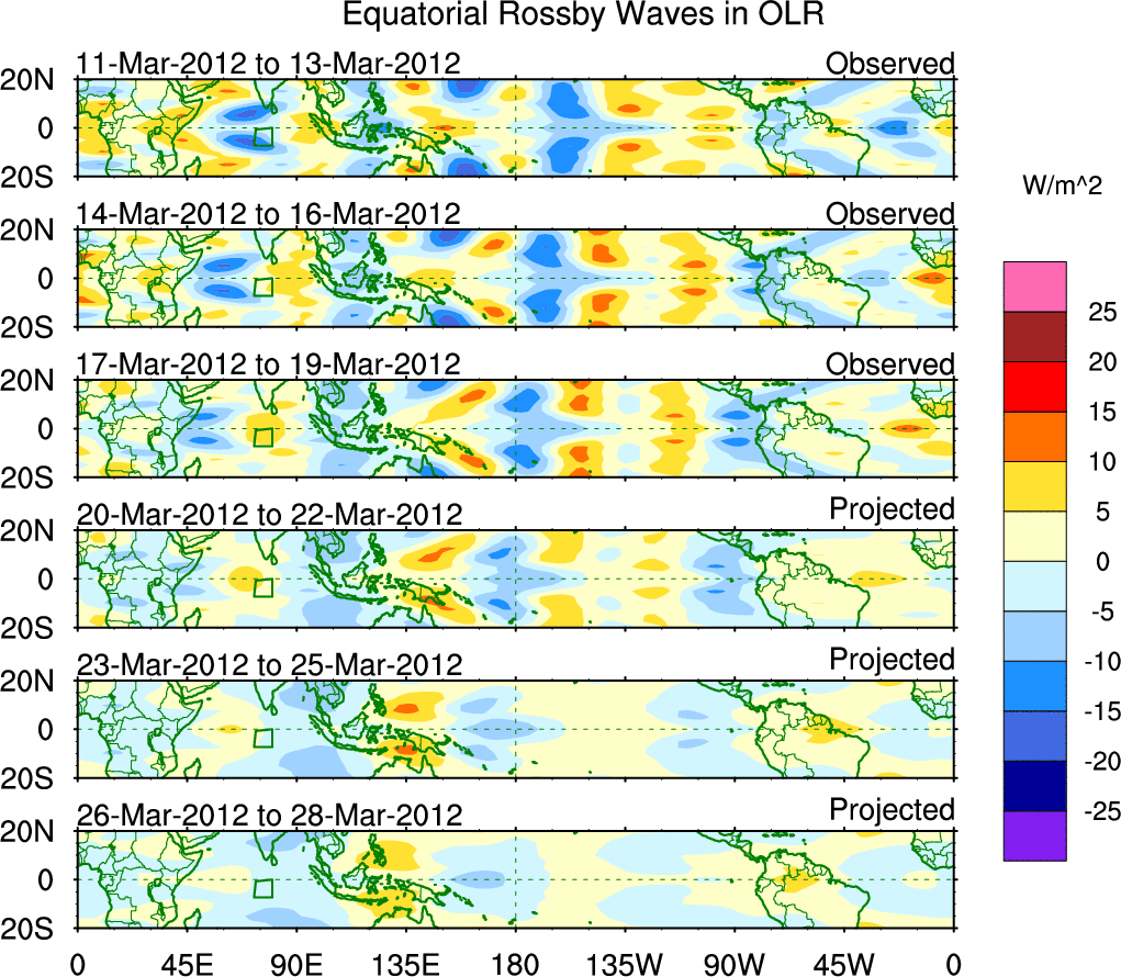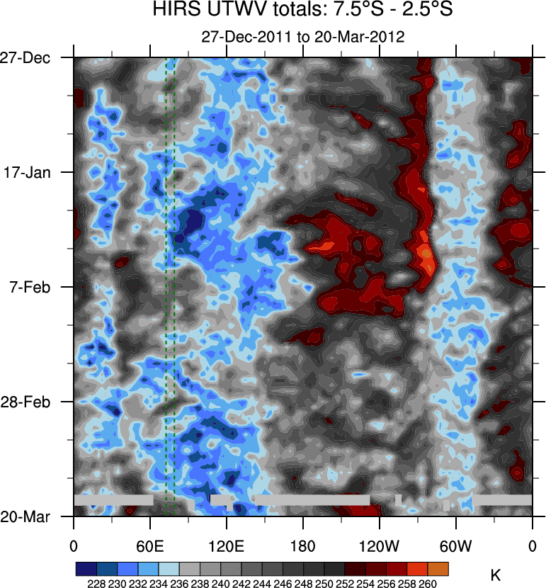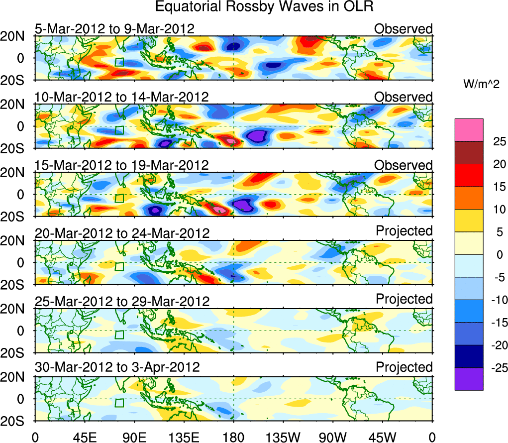 To identify tropical waves in near real-time, the OLR and UTWV data are filtered following Wheeler & Weickmann (2001 MWR). The daily anomalies are calculated using the first 3 harmonics of the seasonal cycle for 1979–2009. Missing values are then filled using linear interpolation in space and time. The most recent 365 days of anomalies are padded with 659 days of zeroes, and the result is filtered for each wave type.