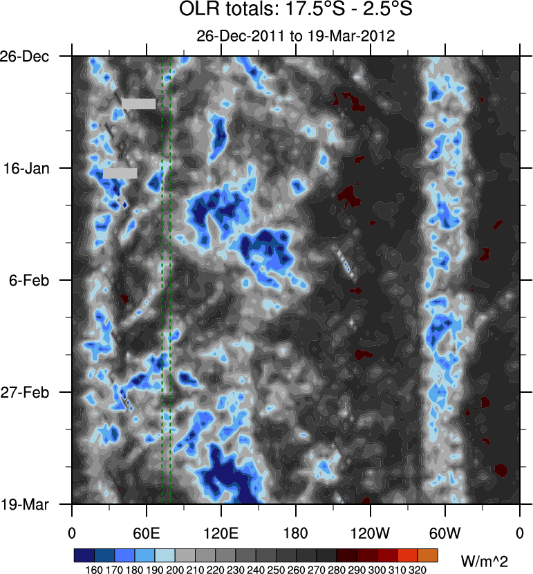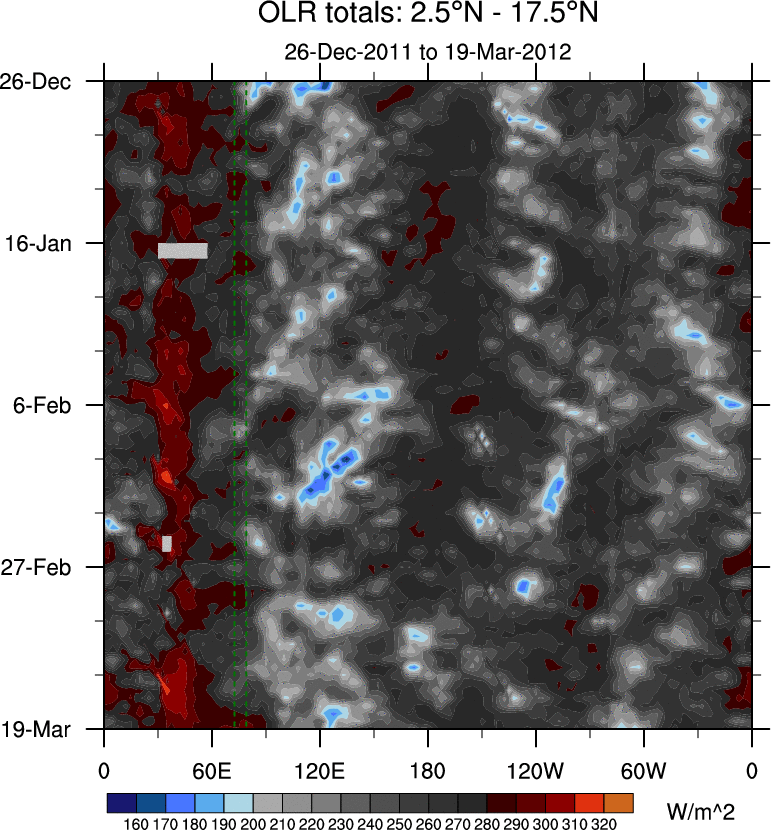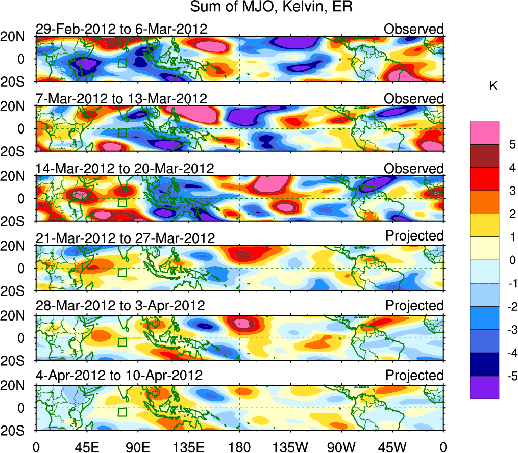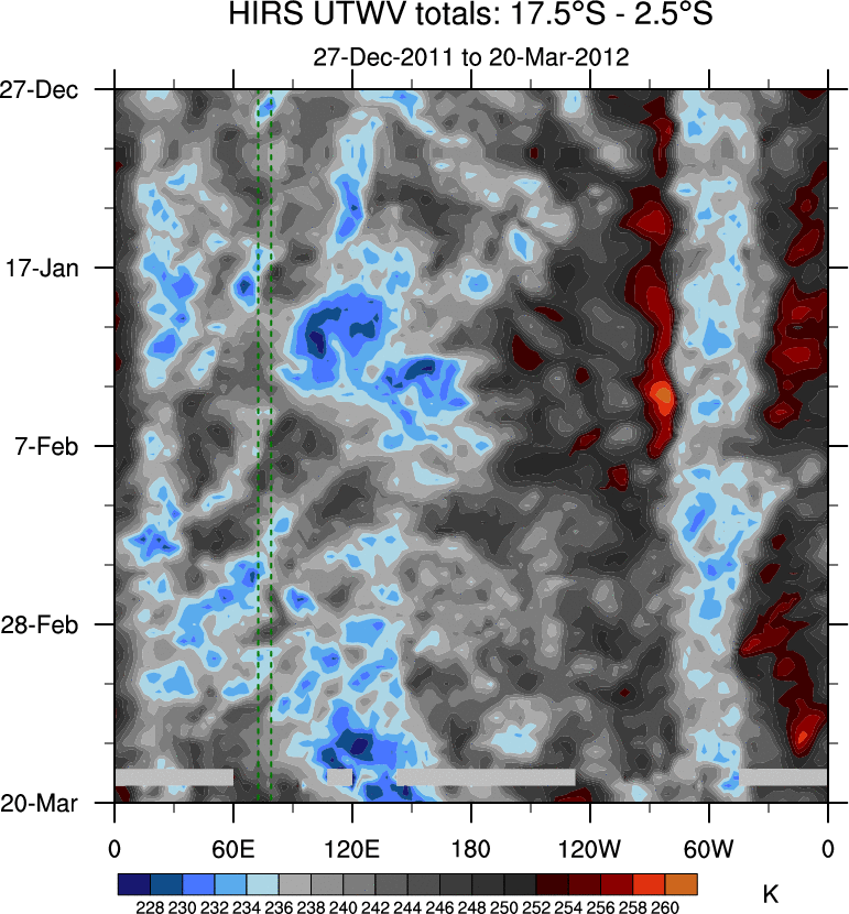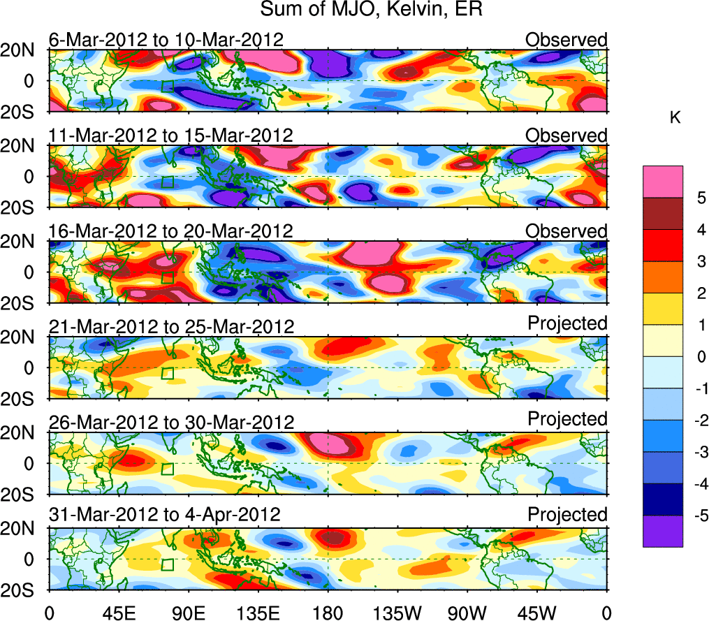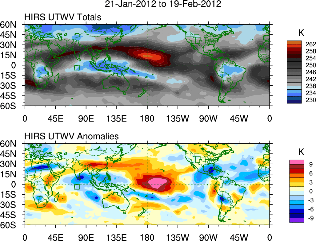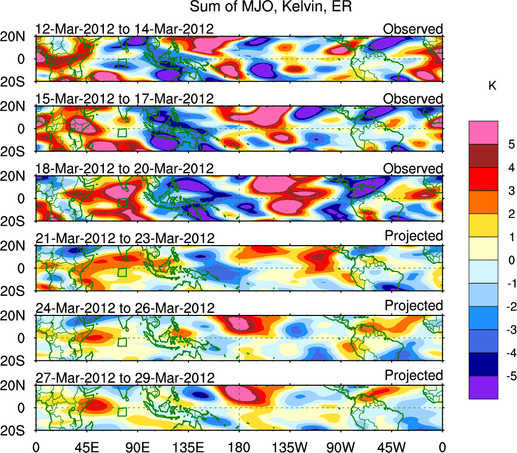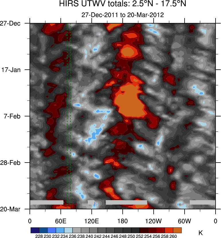 To identify tropical waves in near real-time, the OLR and UTWV data are filtered following Wheeler & Weickmann (2001 MWR). The daily anomalies are calculated using the first 3 harmonics of the seasonal cycle for 1979–2009. Missing values are then filled using linear interpolation in space and time. The most recent 365 days of anomalies are padded with 659 days of zeroes, and the result is filtered for each wave type.
