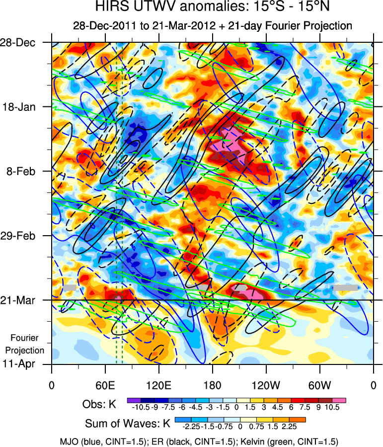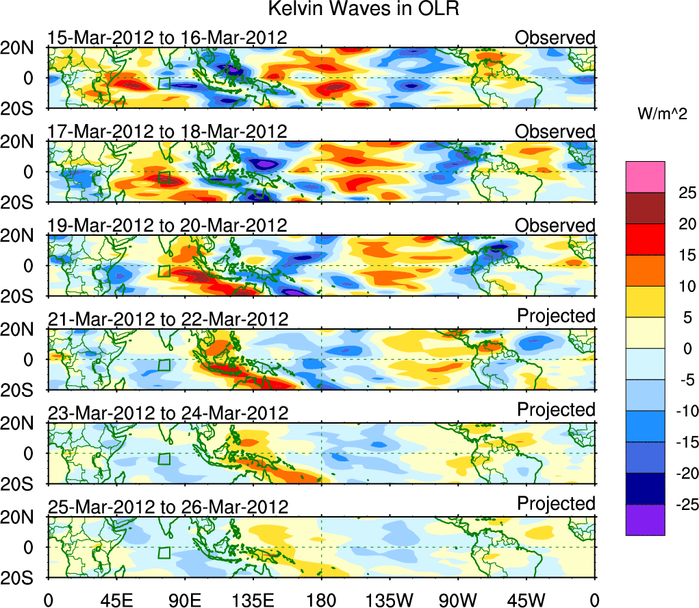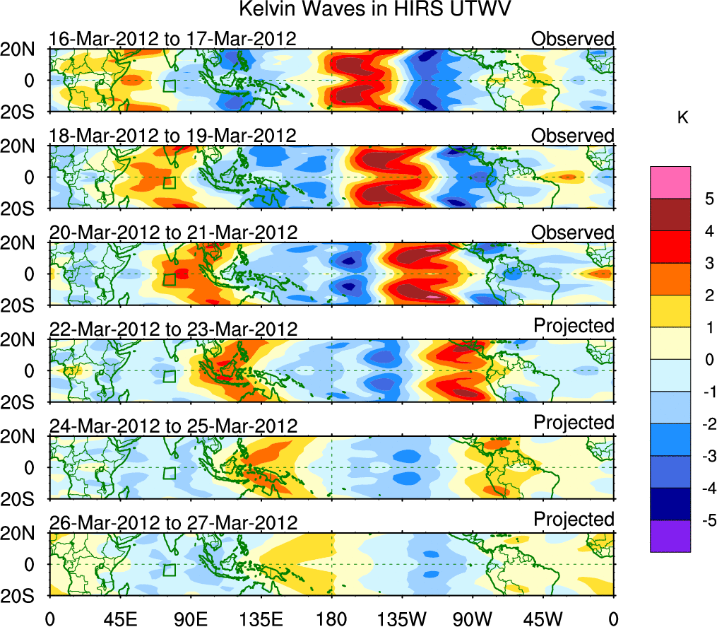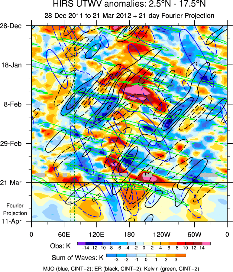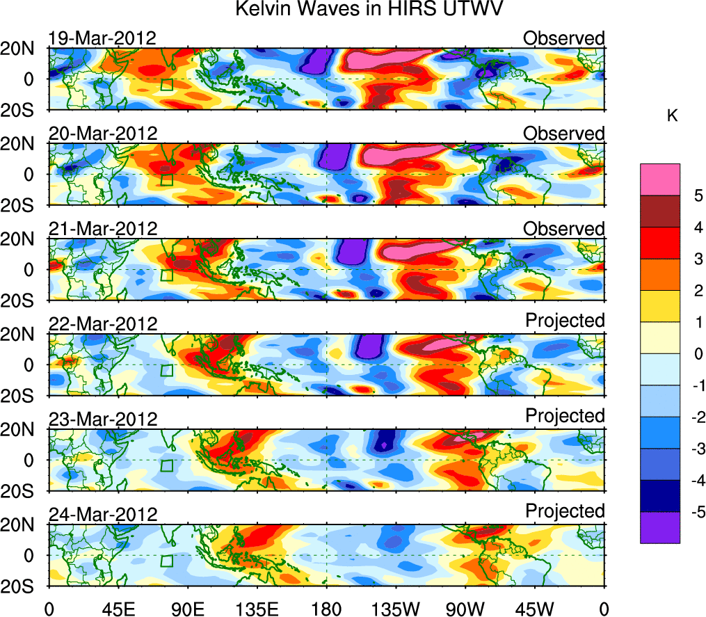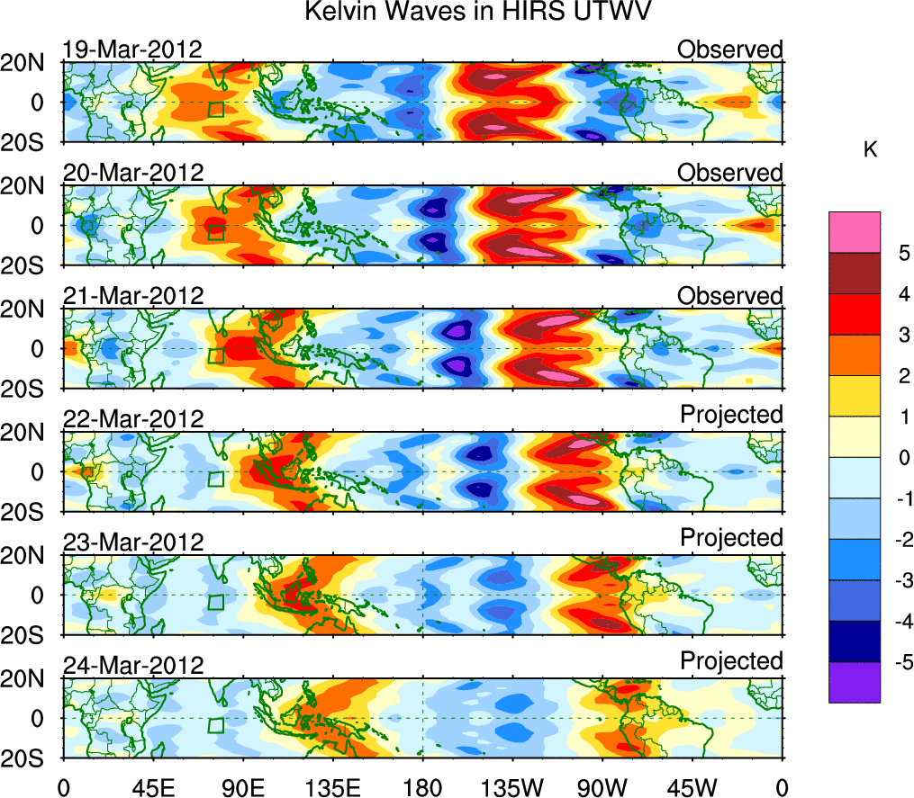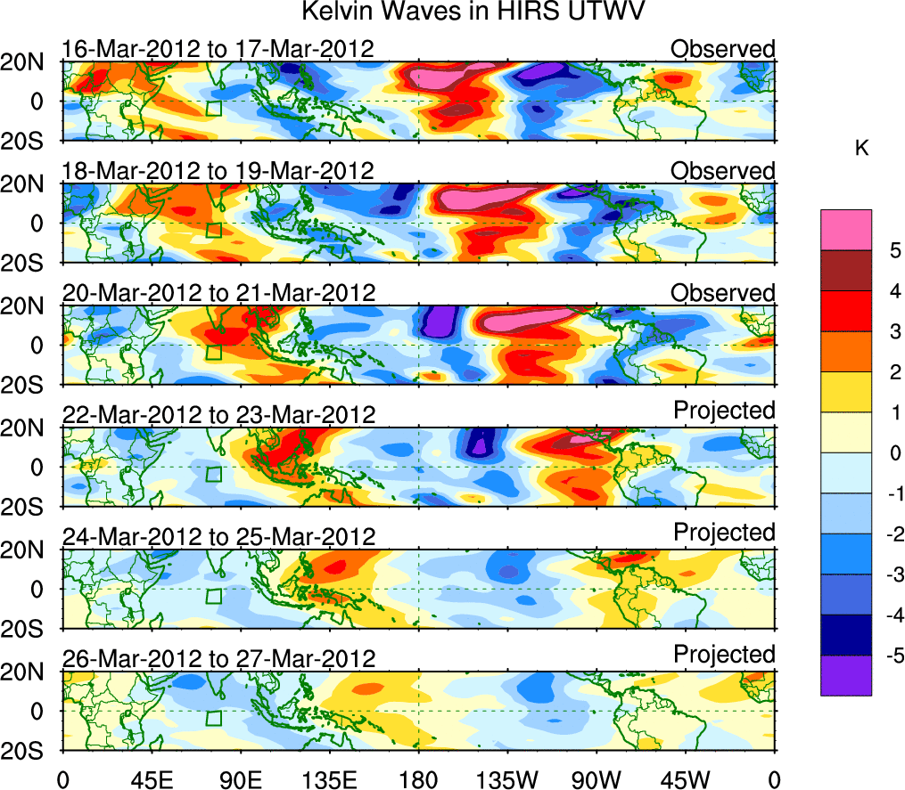 To identify tropical waves in near real-time, the OLR and UTWV data are filtered following Wheeler & Weickmann (2001 MWR). The daily anomalies are calculated using the first 3 harmonics of the seasonal cycle for 1979–2009. Missing values are then filled using linear interpolation in space and time. The most recent 365 days of anomalies are padded with 659 days of zeroes, and the result is filtered for each wave type.