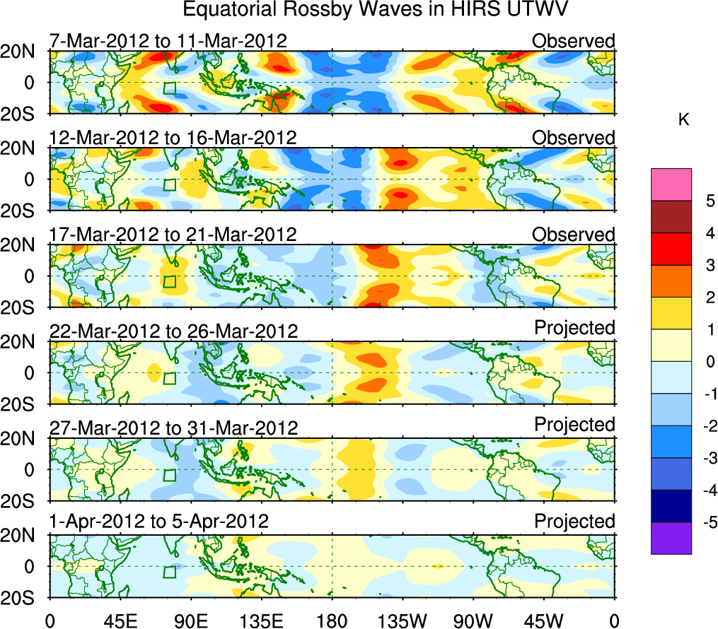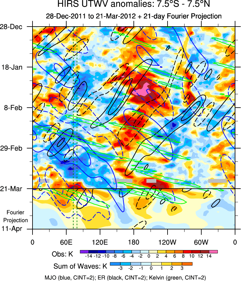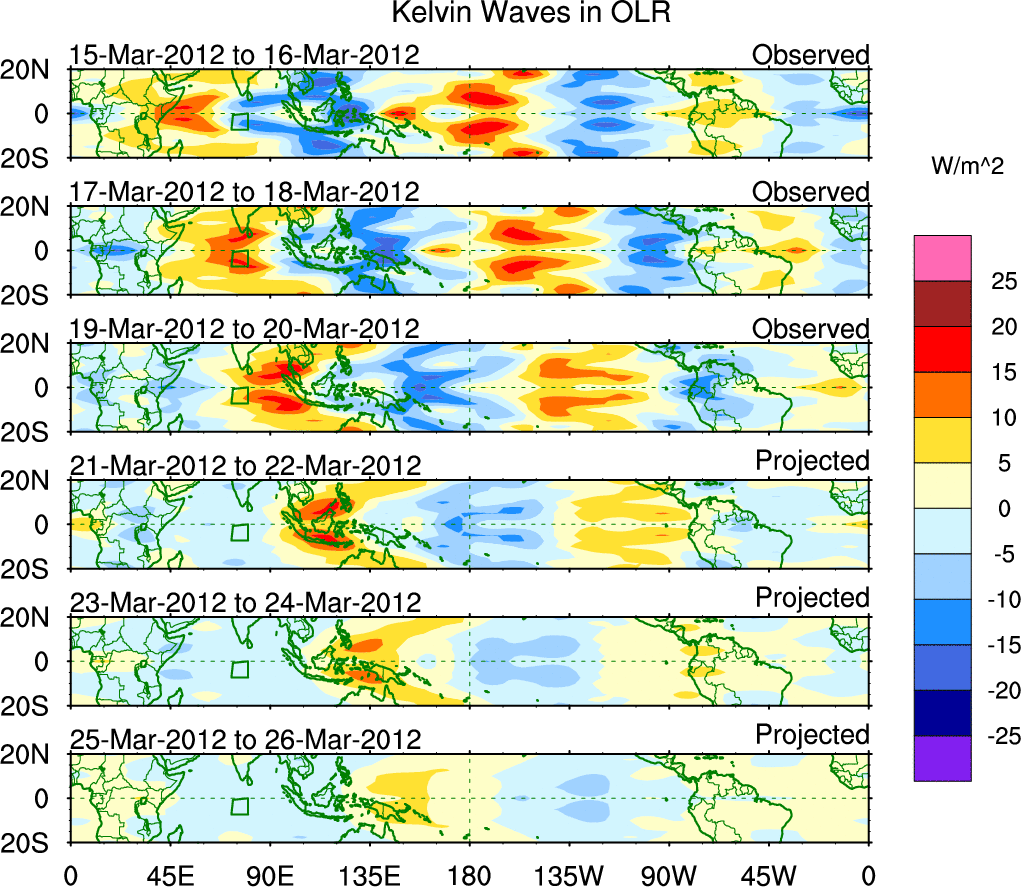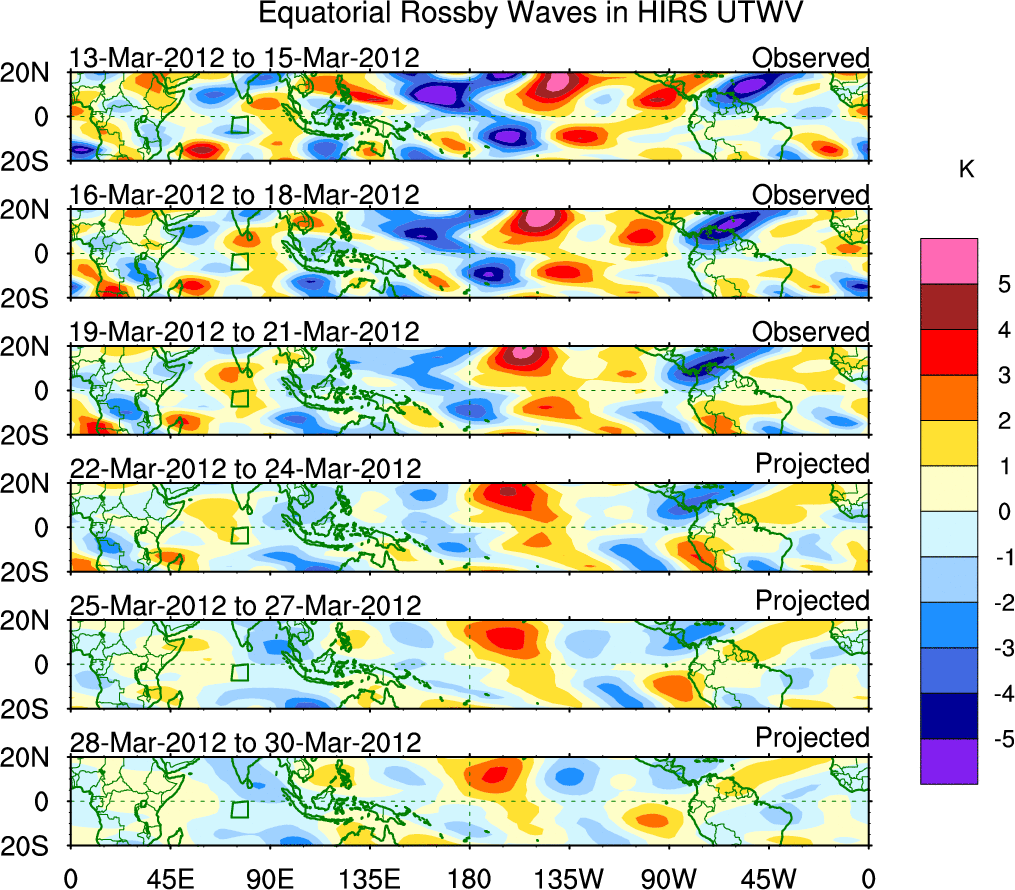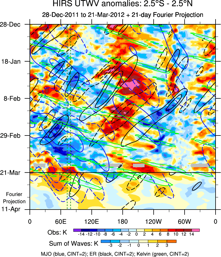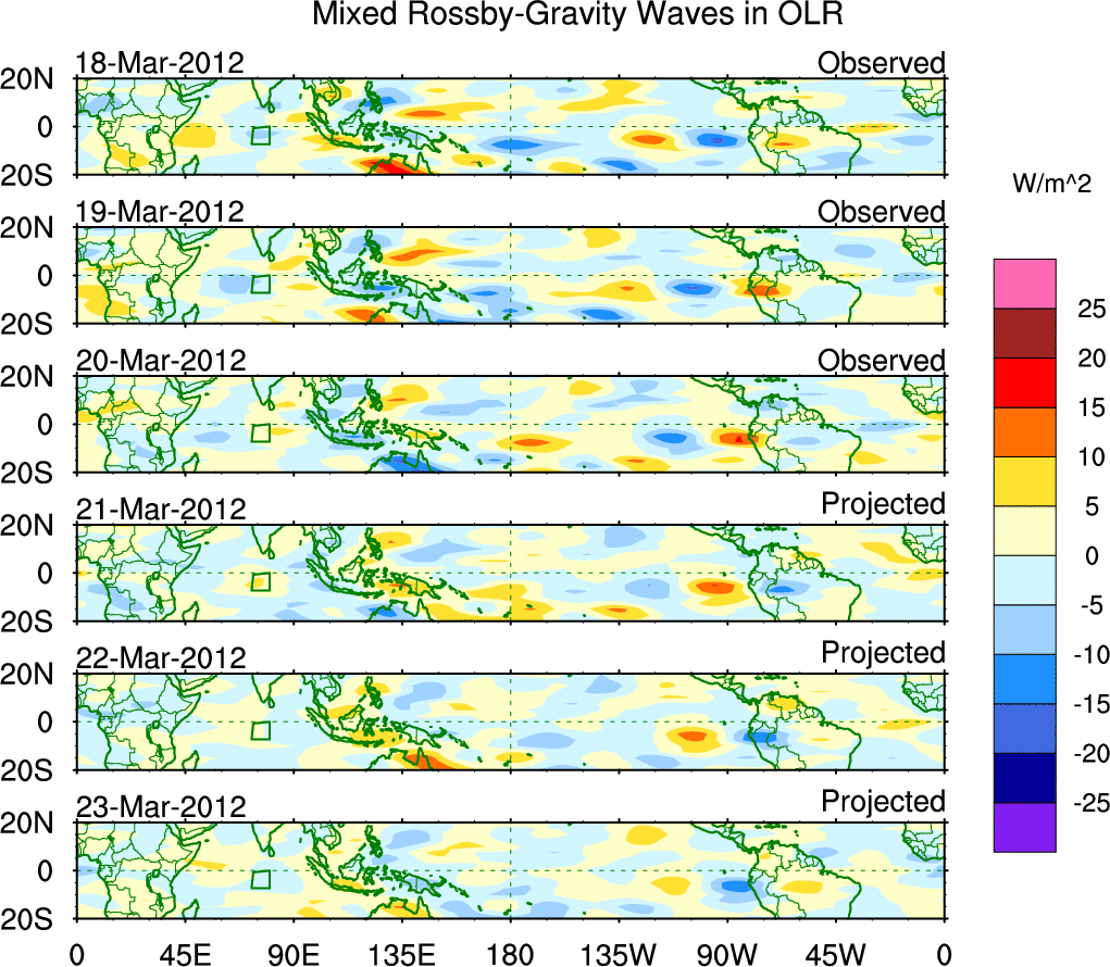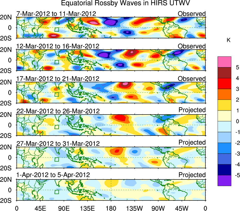 To identify tropical waves in near real-time, the OLR and UTWV data are filtered following Wheeler & Weickmann (2001 MWR). The daily anomalies are calculated using the first 3 harmonics of the seasonal cycle for 1979–2009. Missing values are then filled using linear interpolation in space and time. The most recent 365 days of anomalies are padded with 659 days of zeroes, and the result is filtered for each wave type.