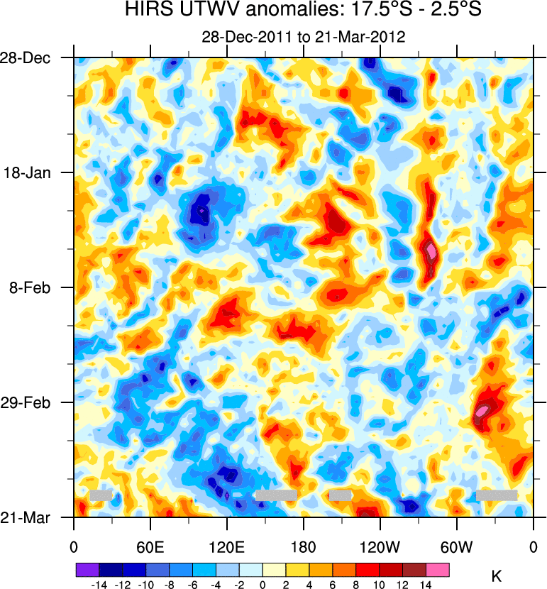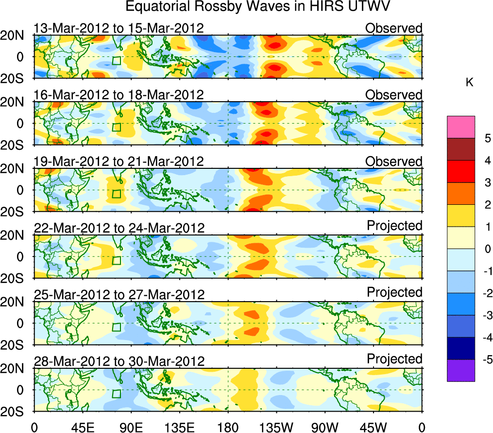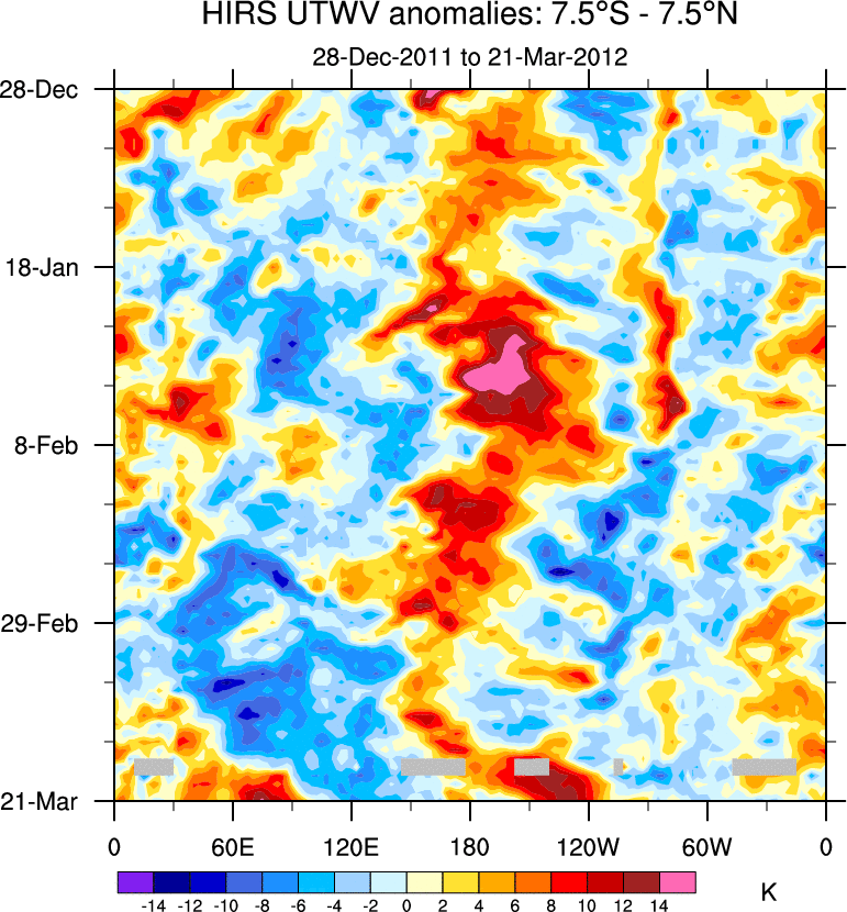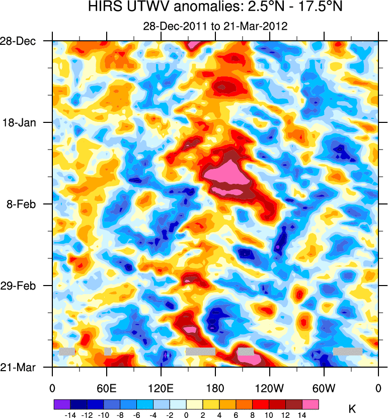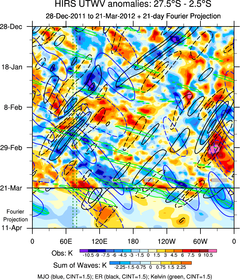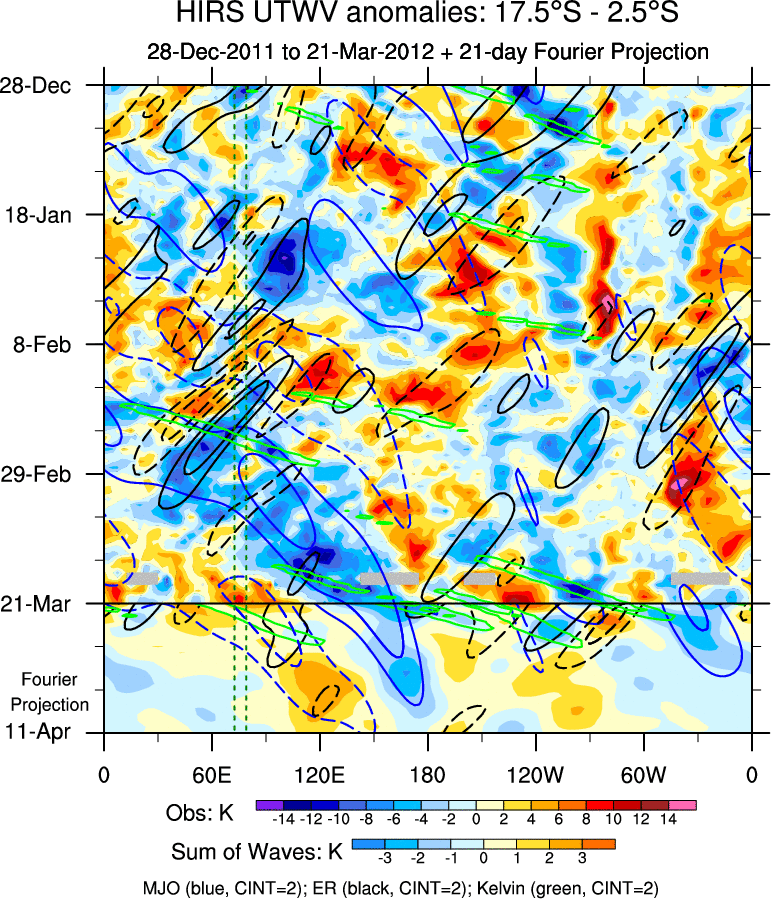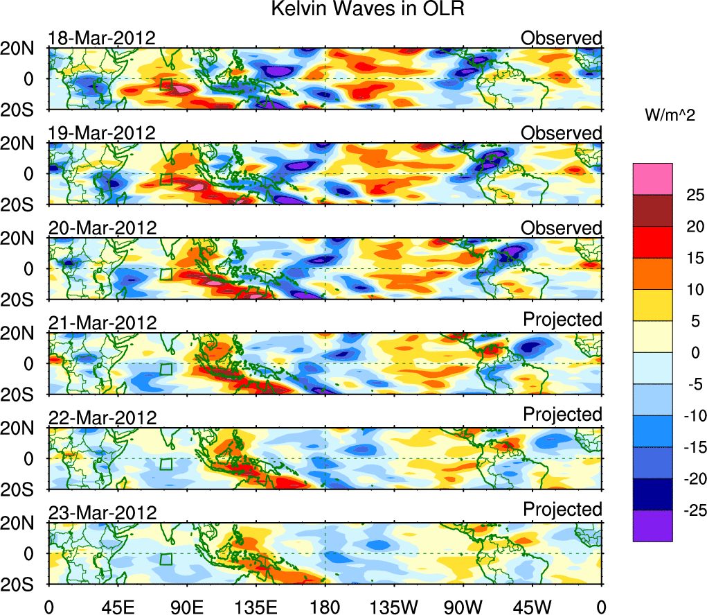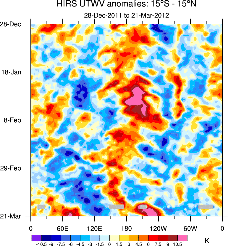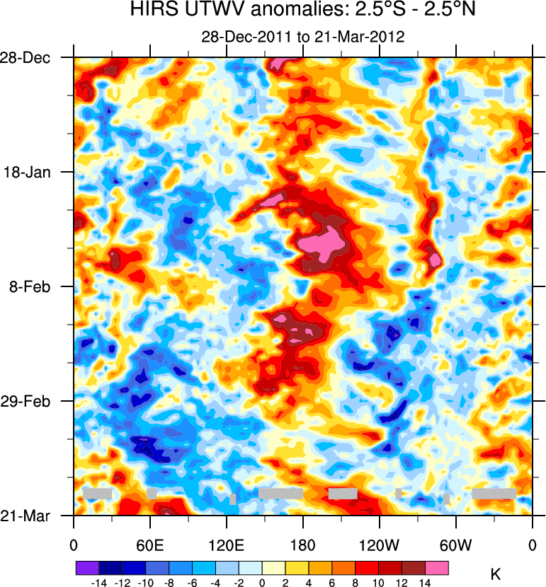 To identify tropical waves in near real-time, the OLR and UTWV data are filtered following Wheeler & Weickmann (2001 MWR). The daily anomalies are calculated using the first 3 harmonics of the seasonal cycle for 1979–2009. Missing values are then filled using linear interpolation in space and time. The most recent 365 days of anomalies are padded with 659 days of zeroes, and the result is filtered for each wave type.
