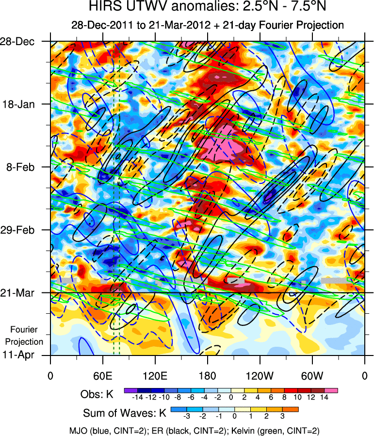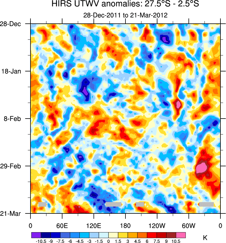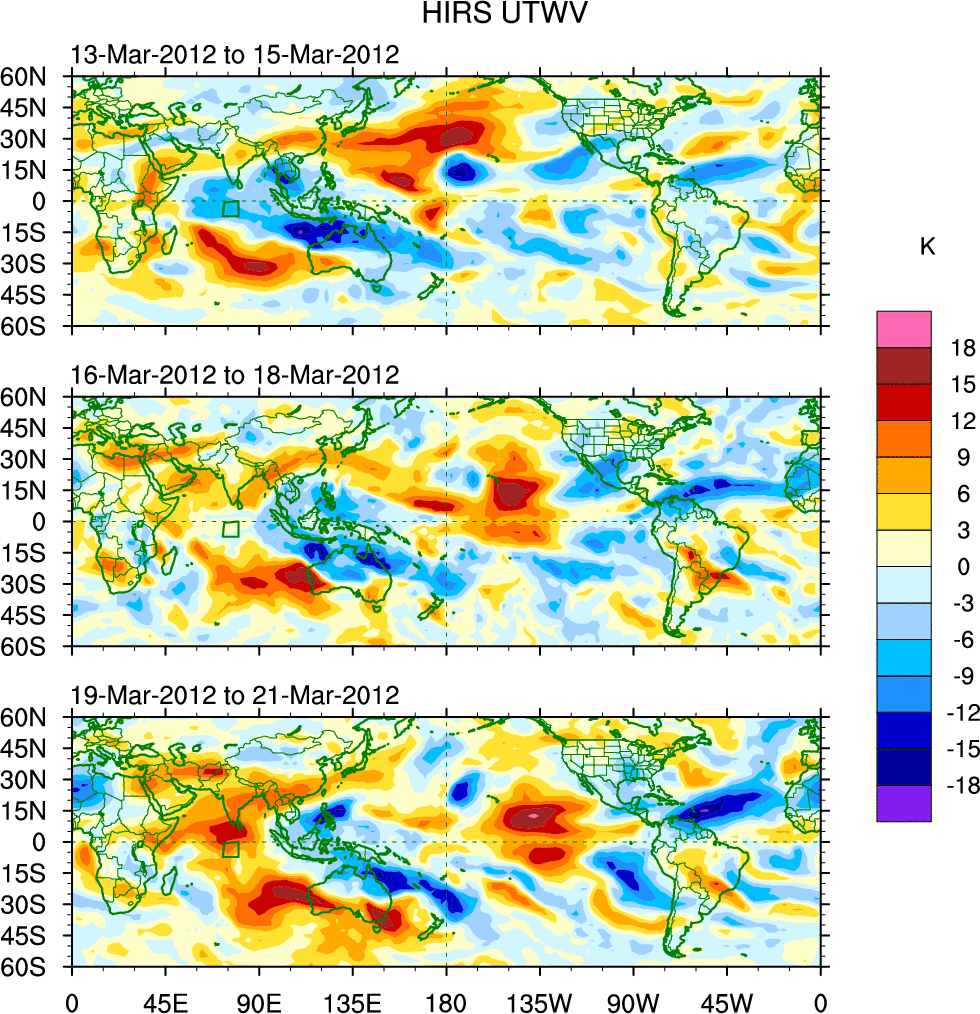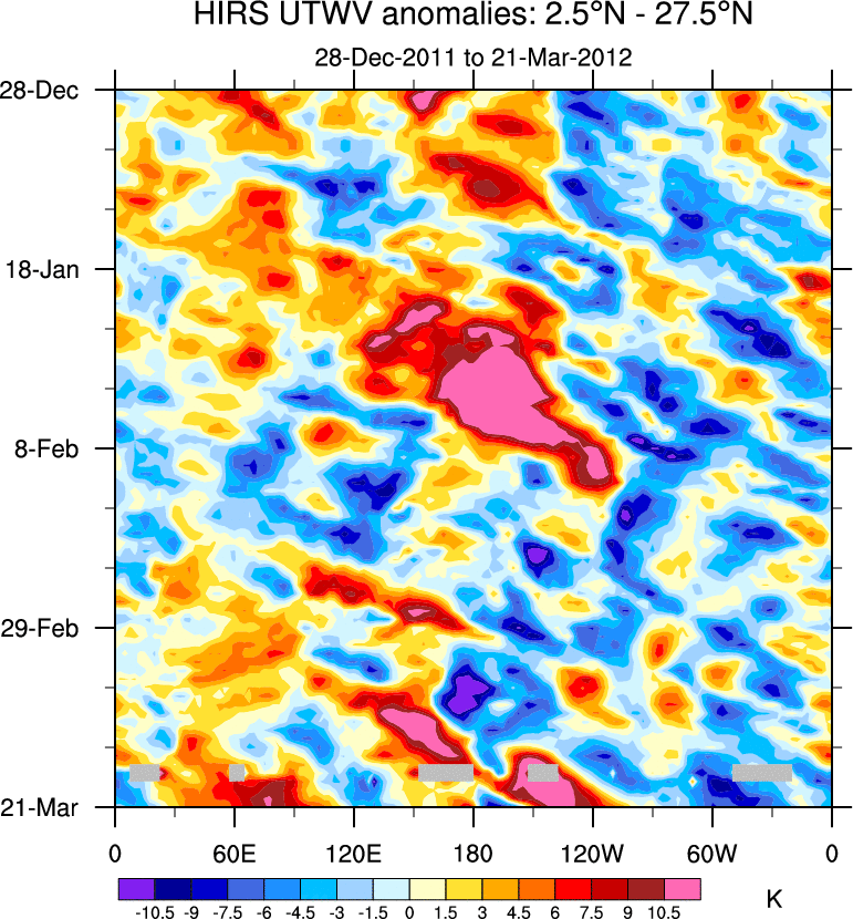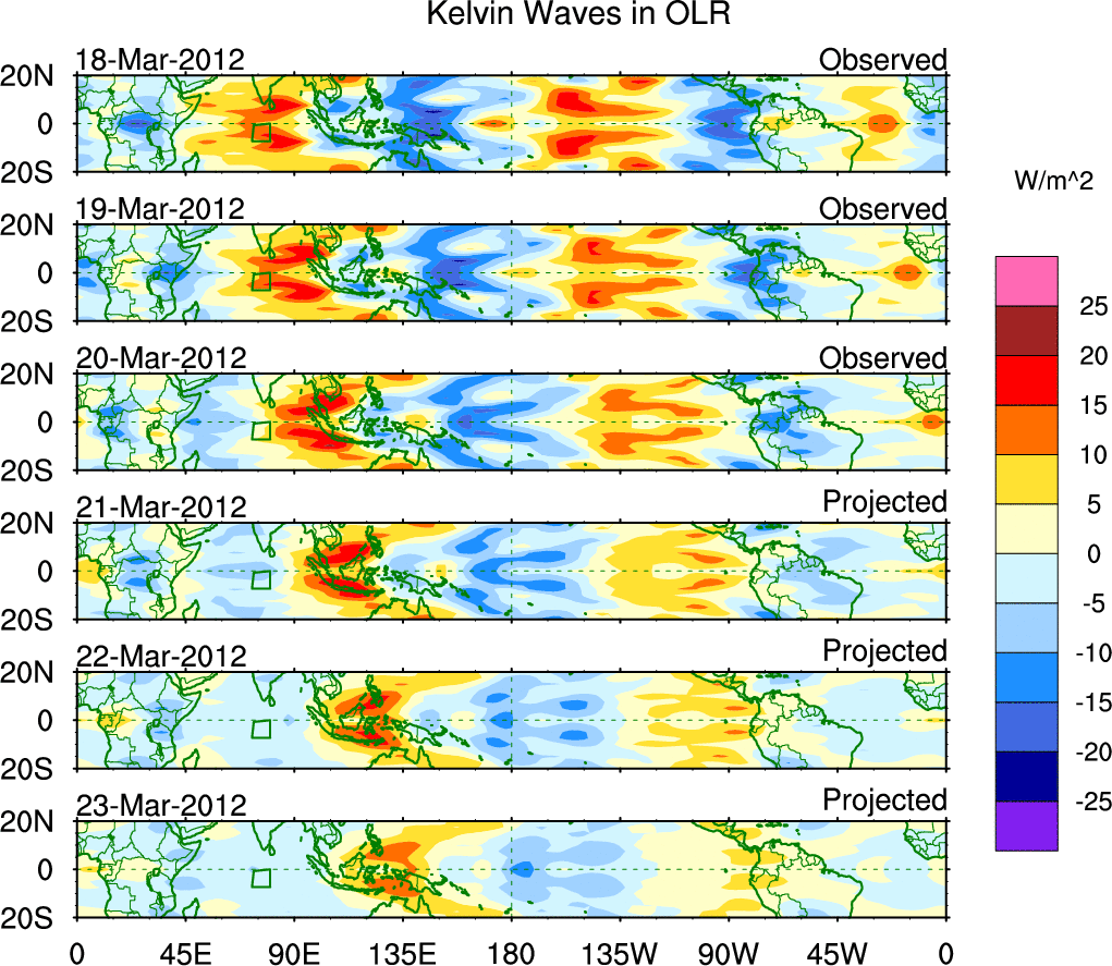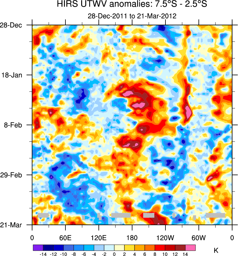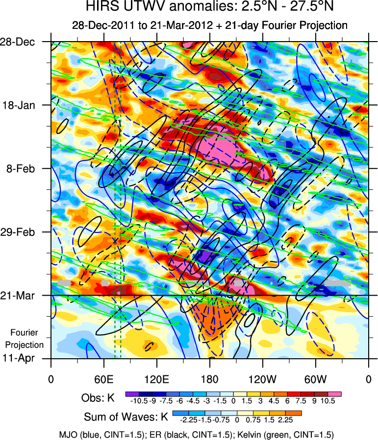To identify tropical waves in near real-time, the OLR and UTWV data are filtered following Wheeler & Weickmann (2001 MWR). The daily anomalies are calculated using the first 3 harmonics of the seasonal cycle for 1979–2009. Missing values are then filled using linear interpolation in space and time. The most recent 365 days of anomalies are padded with 659 days of zeroes, and the result is filtered for each wave type.
