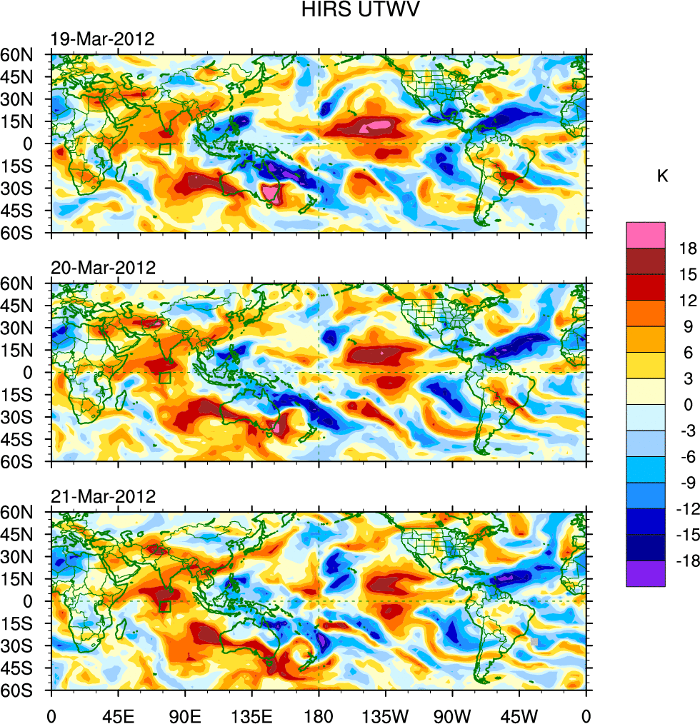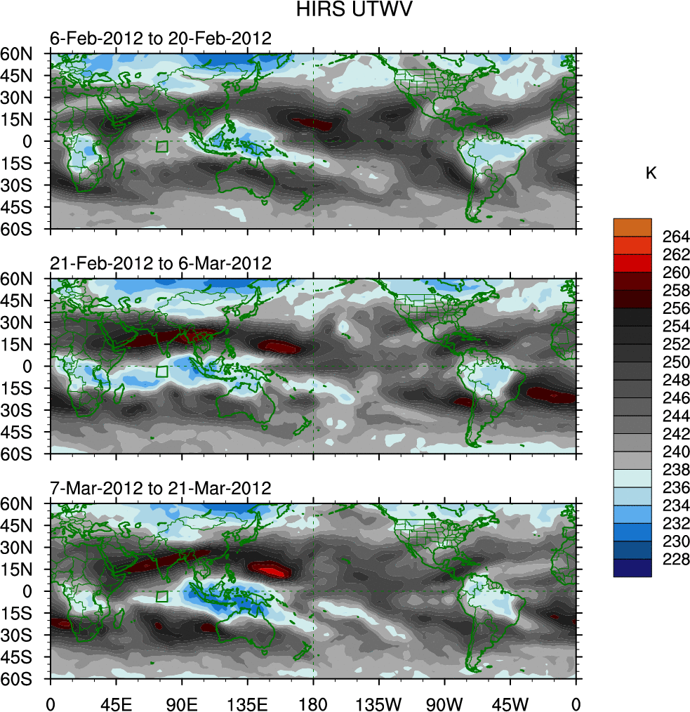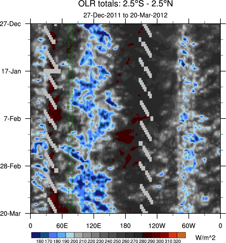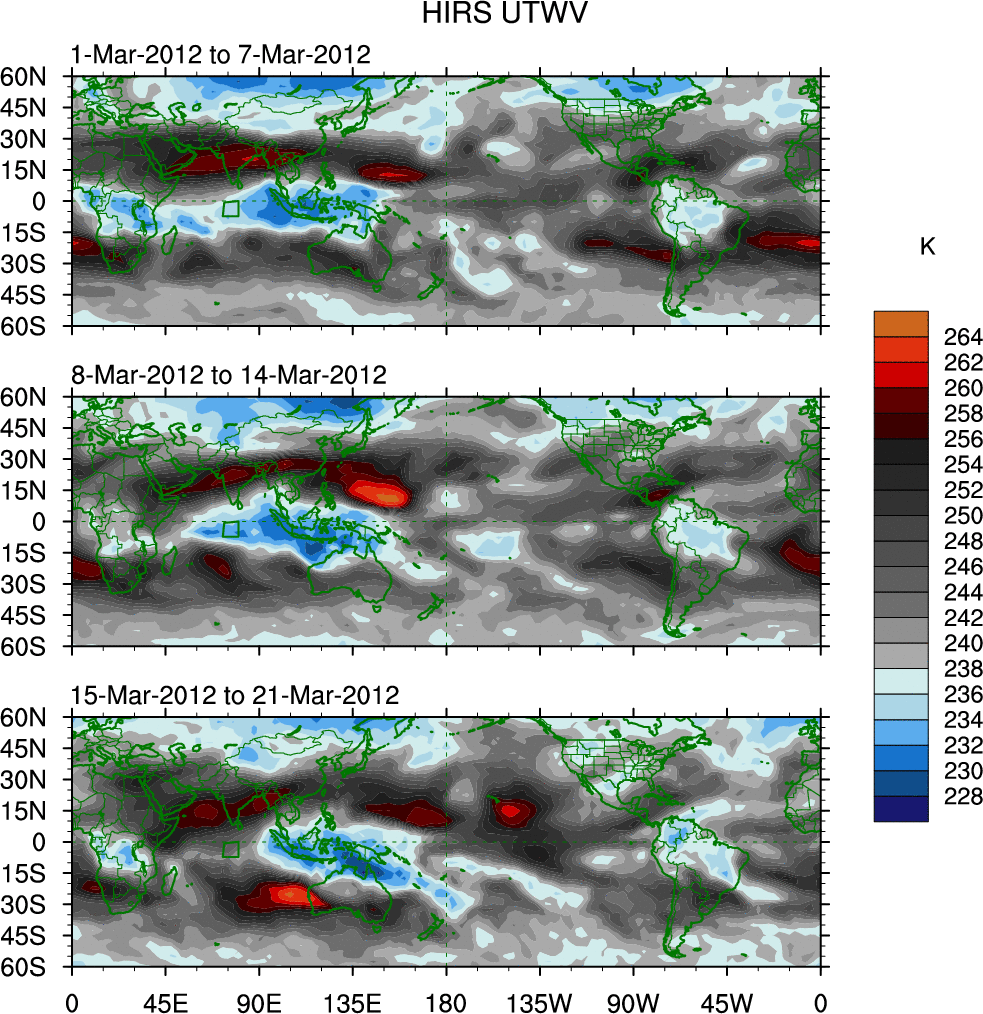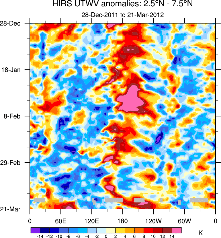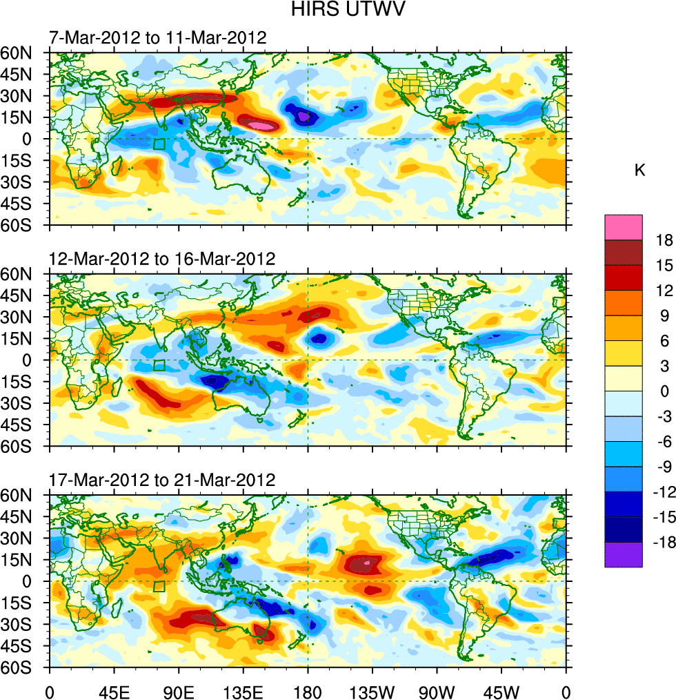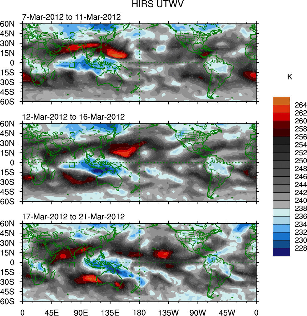 To identify tropical waves in near real-time, the OLR and UTWV data are filtered following Wheeler & Weickmann (2001 MWR). The daily anomalies are calculated using the first 3 harmonics of the seasonal cycle for 1979–2009. Missing values are then filled using linear interpolation in space and time. The most recent 365 days of anomalies are padded with 659 days of zeroes, and the result is filtered for each wave type.