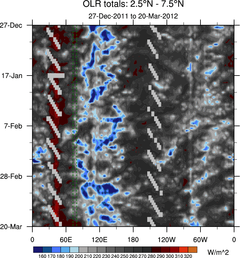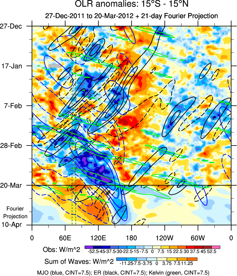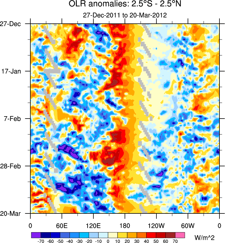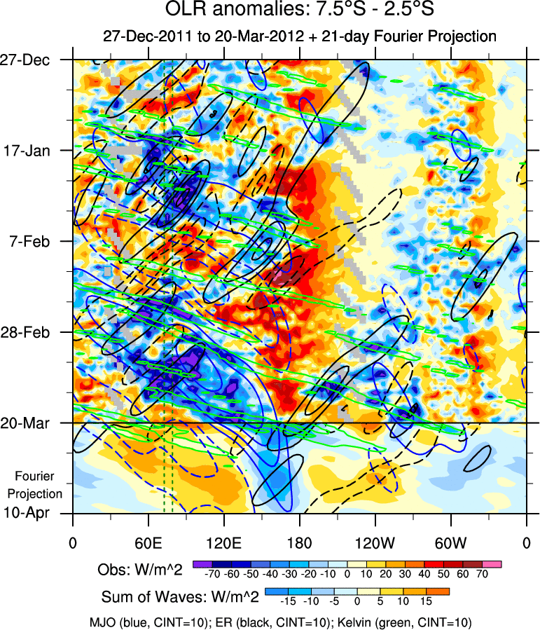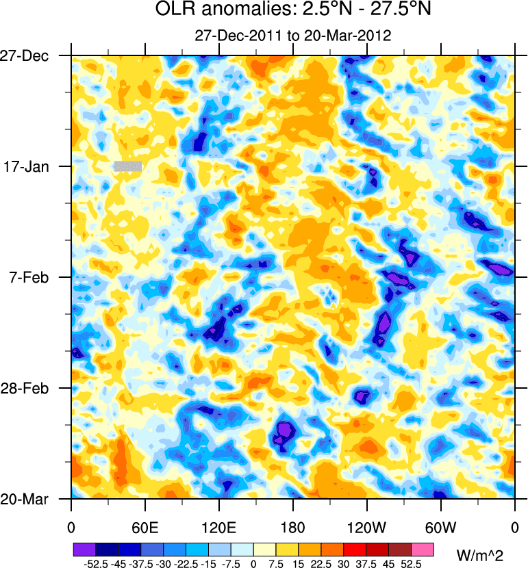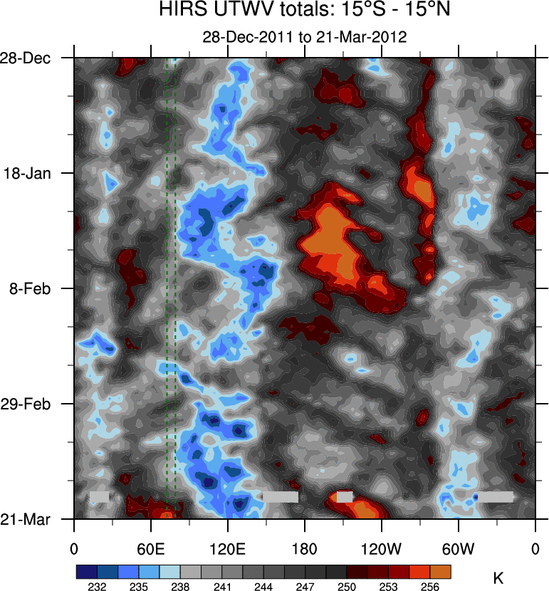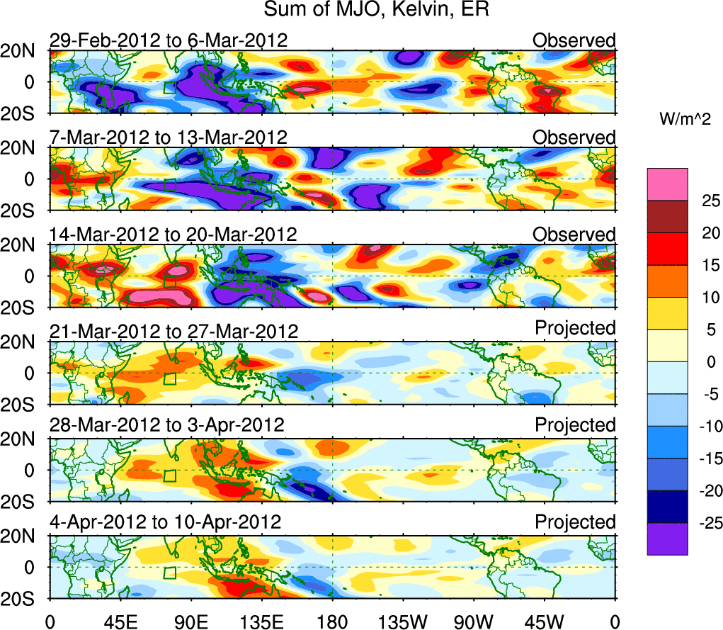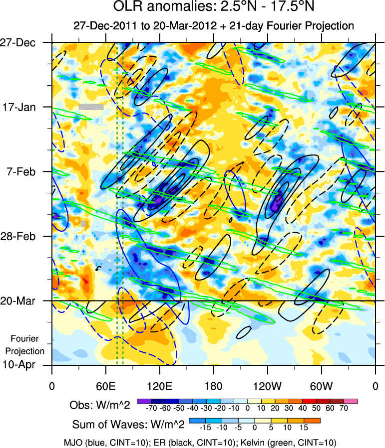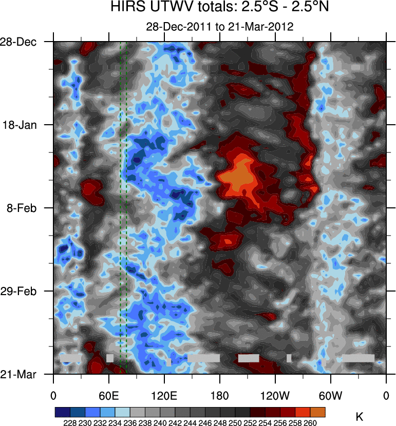 To identify tropical waves in near real-time, the OLR and UTWV data are filtered following Wheeler & Weickmann (2001 MWR). The daily anomalies are calculated using the first 3 harmonics of the seasonal cycle for 1979–2009. Missing values are then filled using linear interpolation in space and time. The most recent 365 days of anomalies are padded with 659 days of zeroes, and the result is filtered for each wave type.