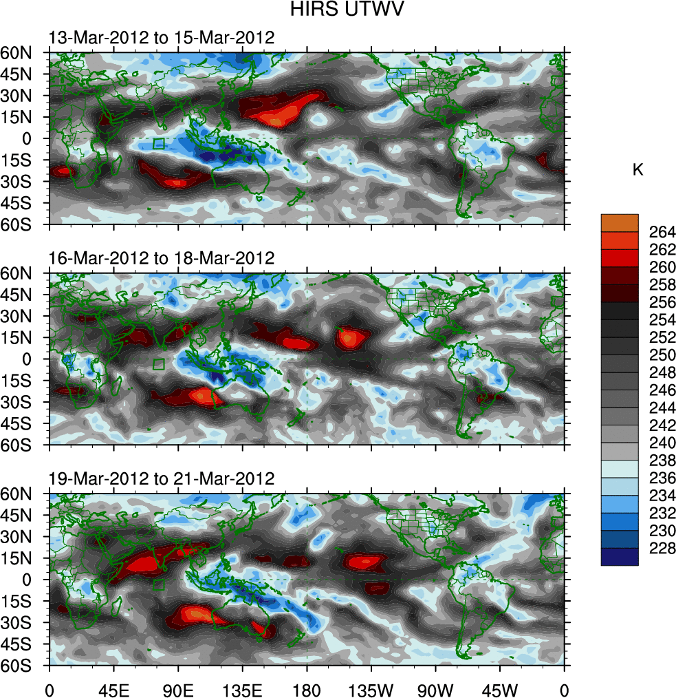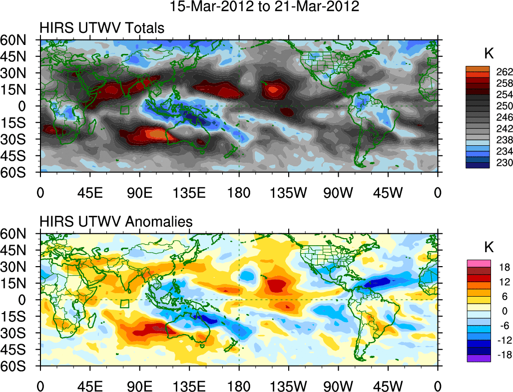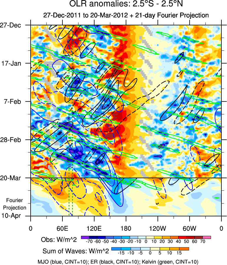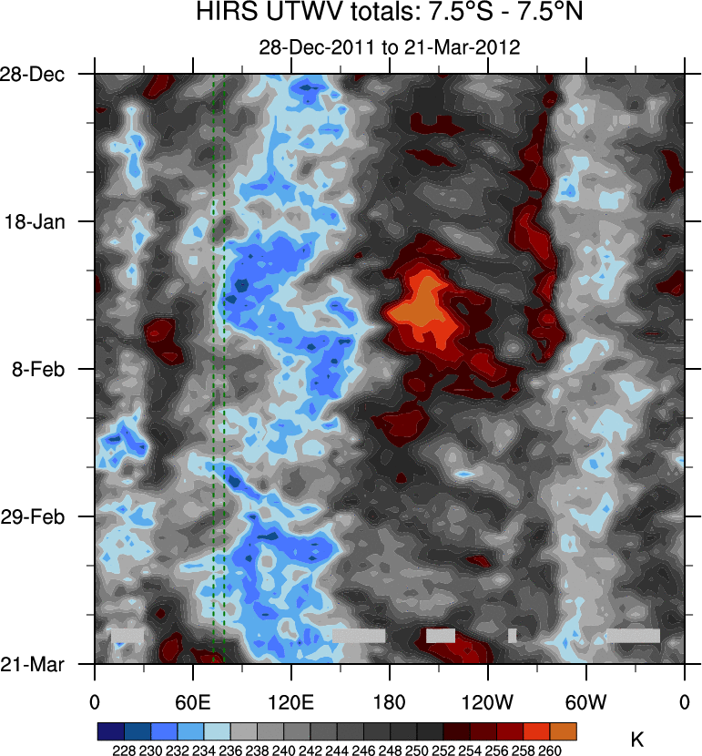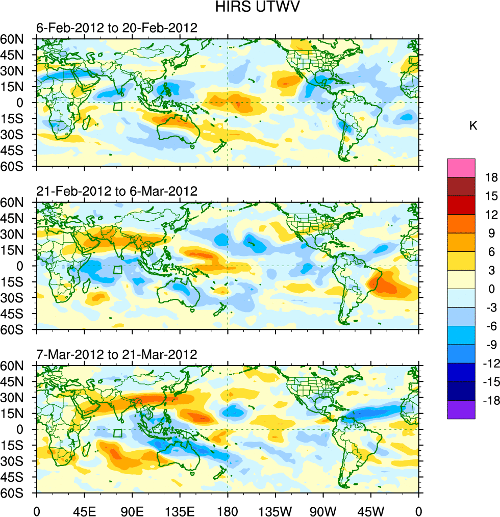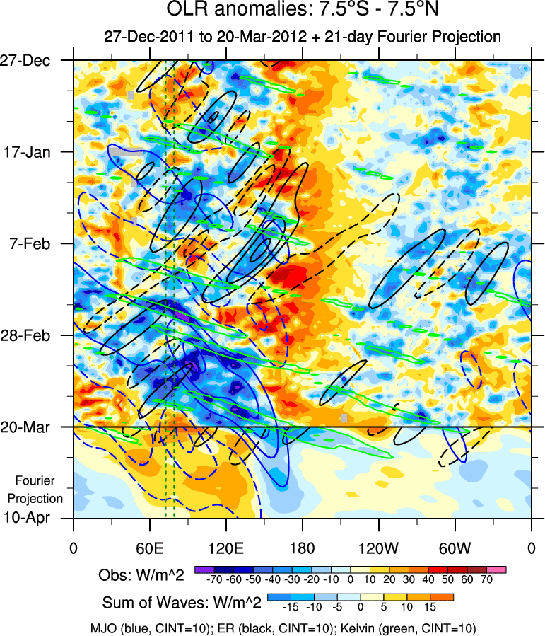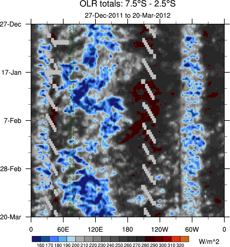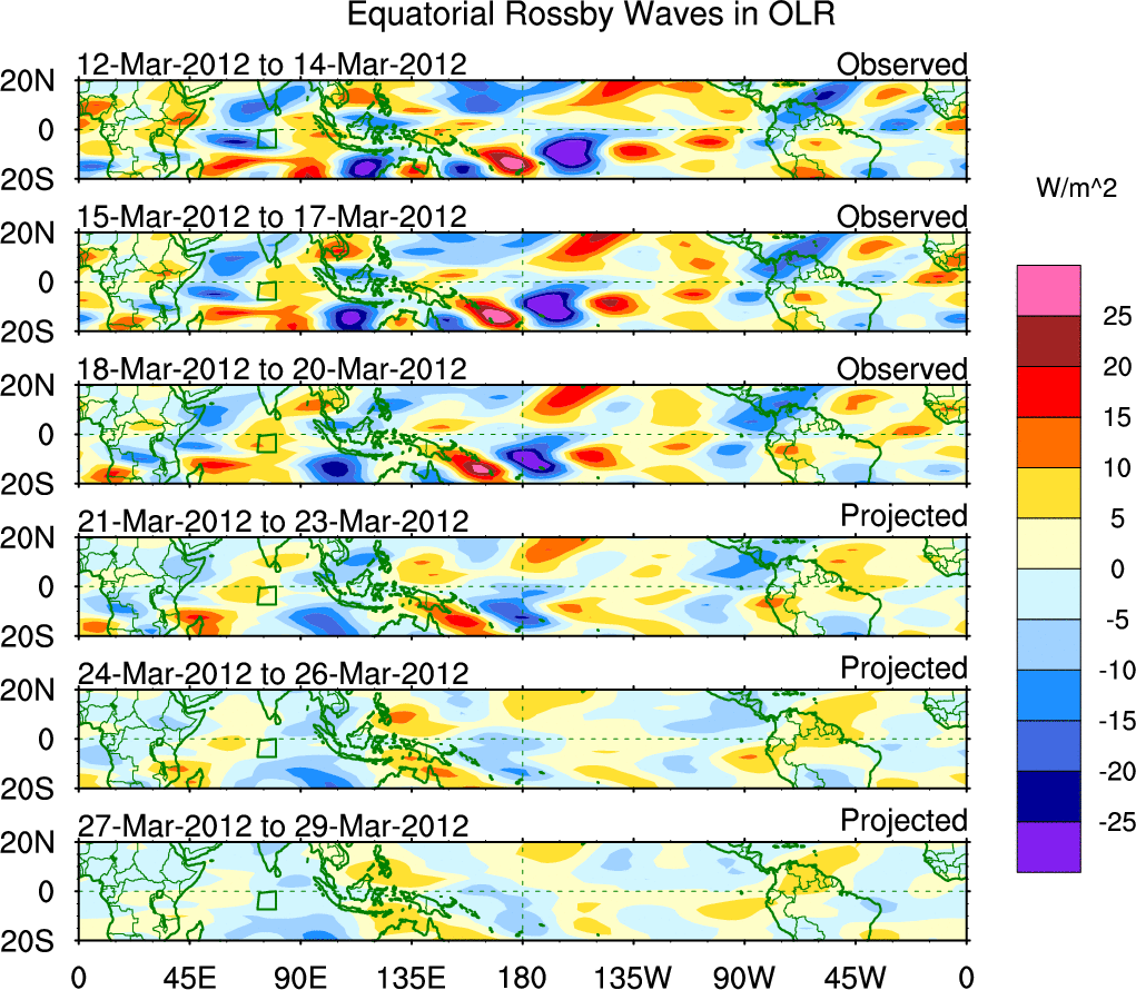 To identify tropical waves in near real-time, the OLR and UTWV data are filtered following Wheeler & Weickmann (2001 MWR). The daily anomalies are calculated using the first 3 harmonics of the seasonal cycle for 1979–2009. Missing values are then filled using linear interpolation in space and time. The most recent 365 days of anomalies are padded with 659 days of zeroes, and the result is filtered for each wave type.