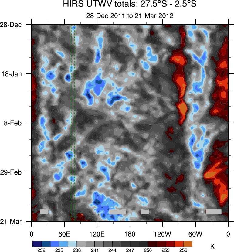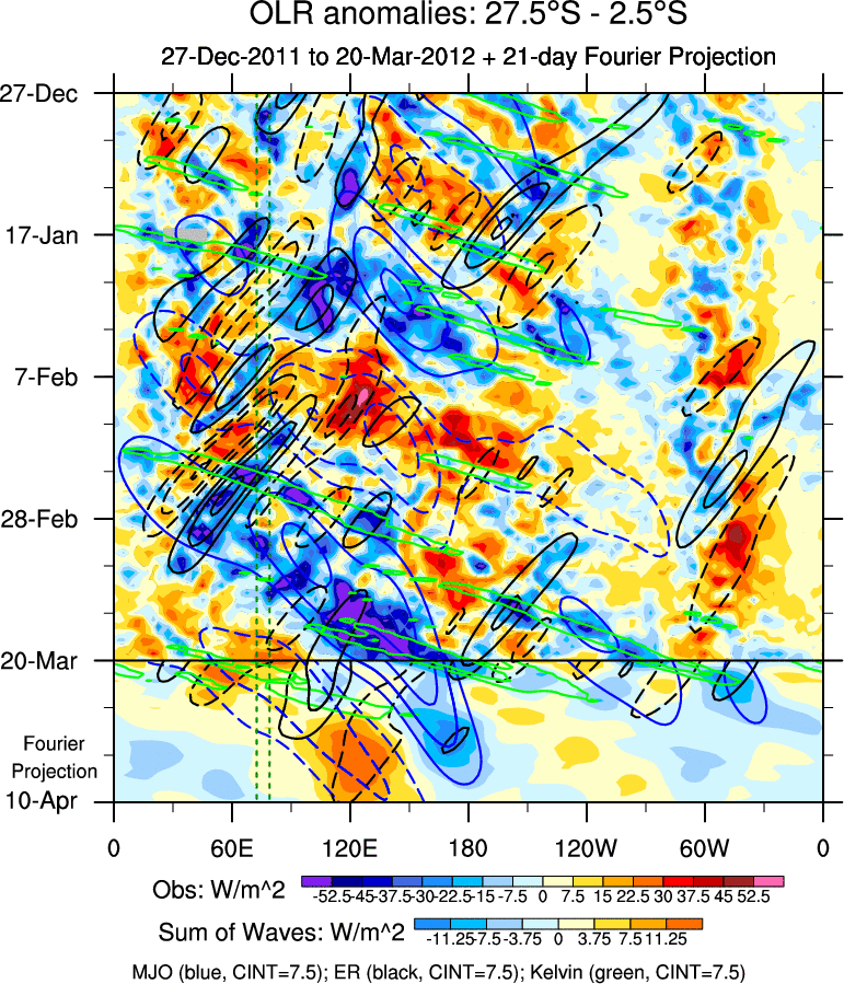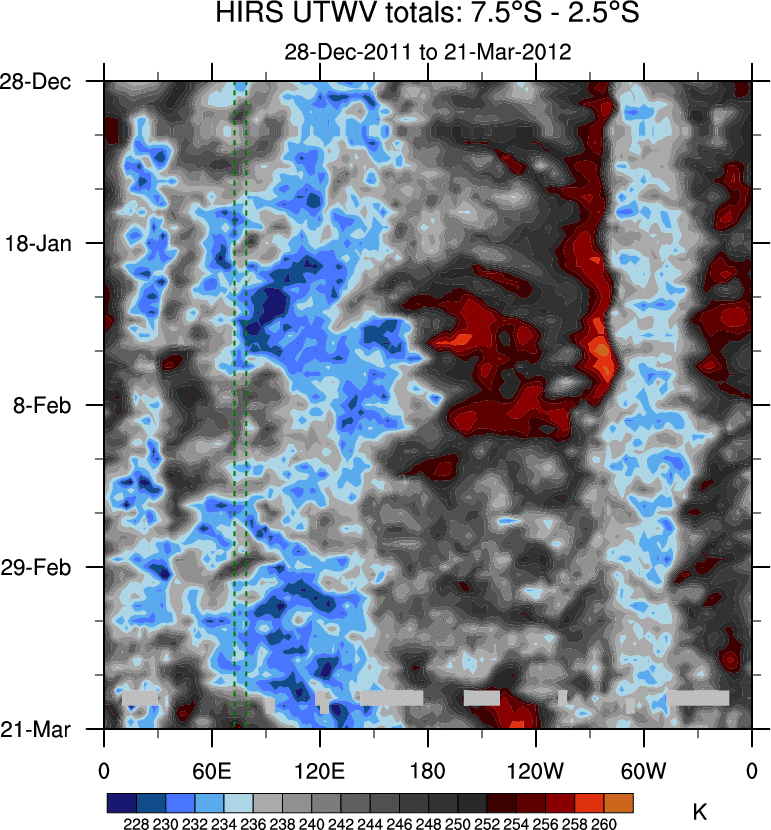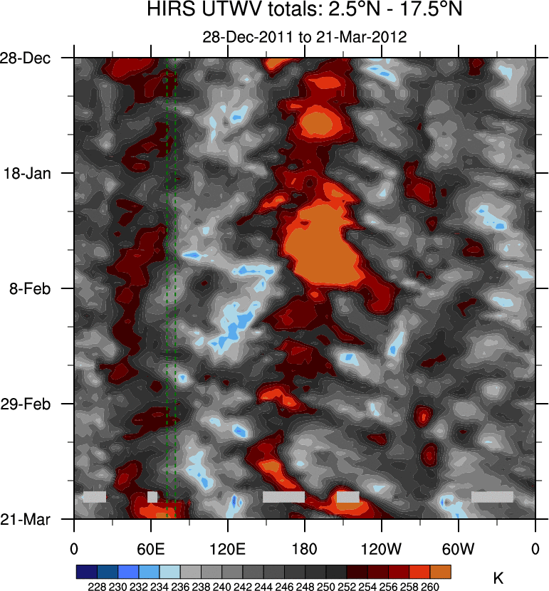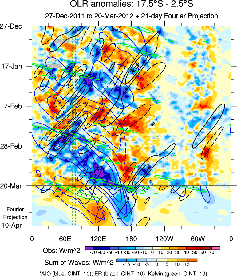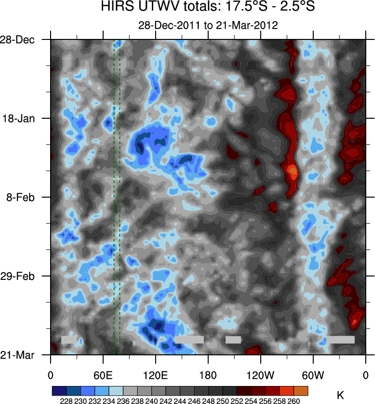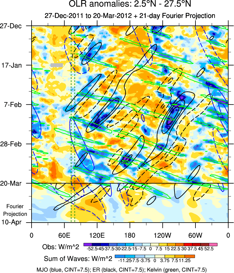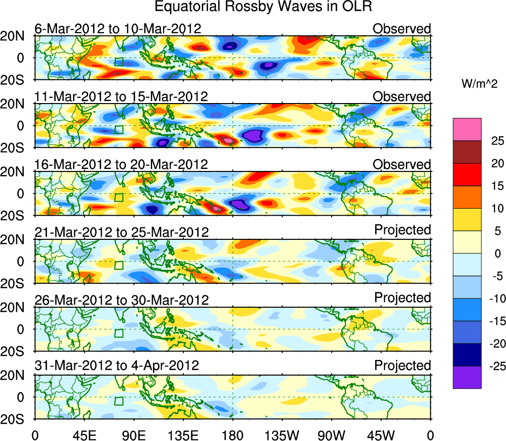 To identify tropical waves in near real-time, the OLR and UTWV data are filtered following Wheeler & Weickmann (2001 MWR). The daily anomalies are calculated using the first 3 harmonics of the seasonal cycle for 1979–2009. Missing values are then filled using linear interpolation in space and time. The most recent 365 days of anomalies are padded with 659 days of zeroes, and the result is filtered for each wave type.