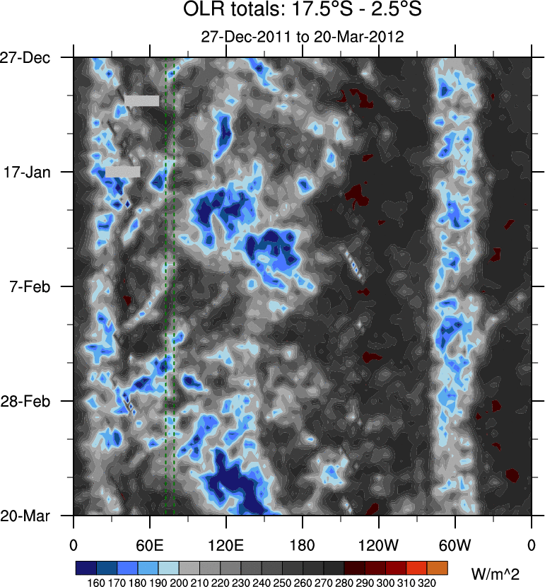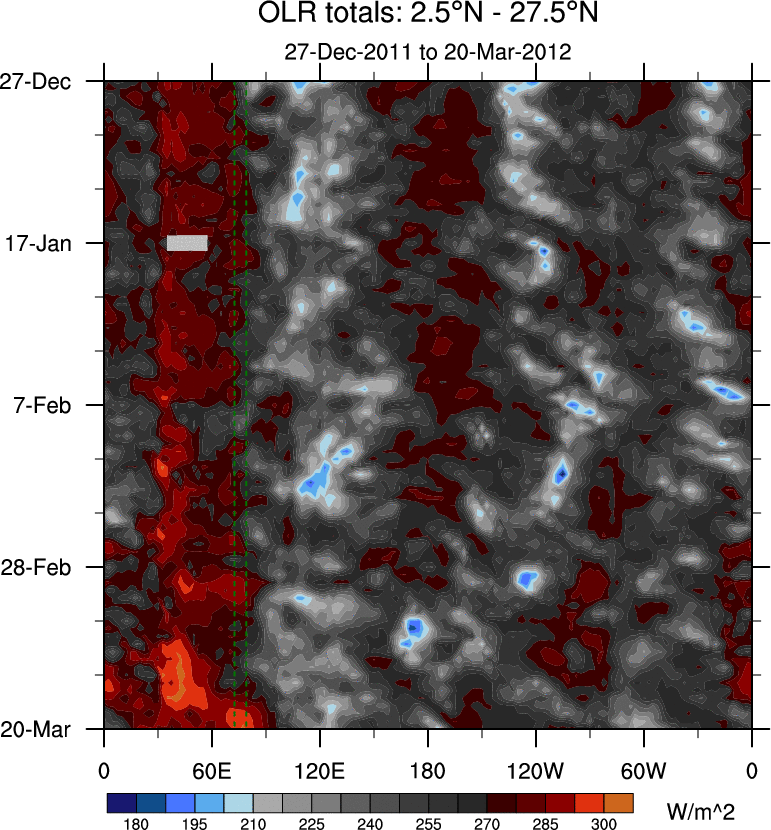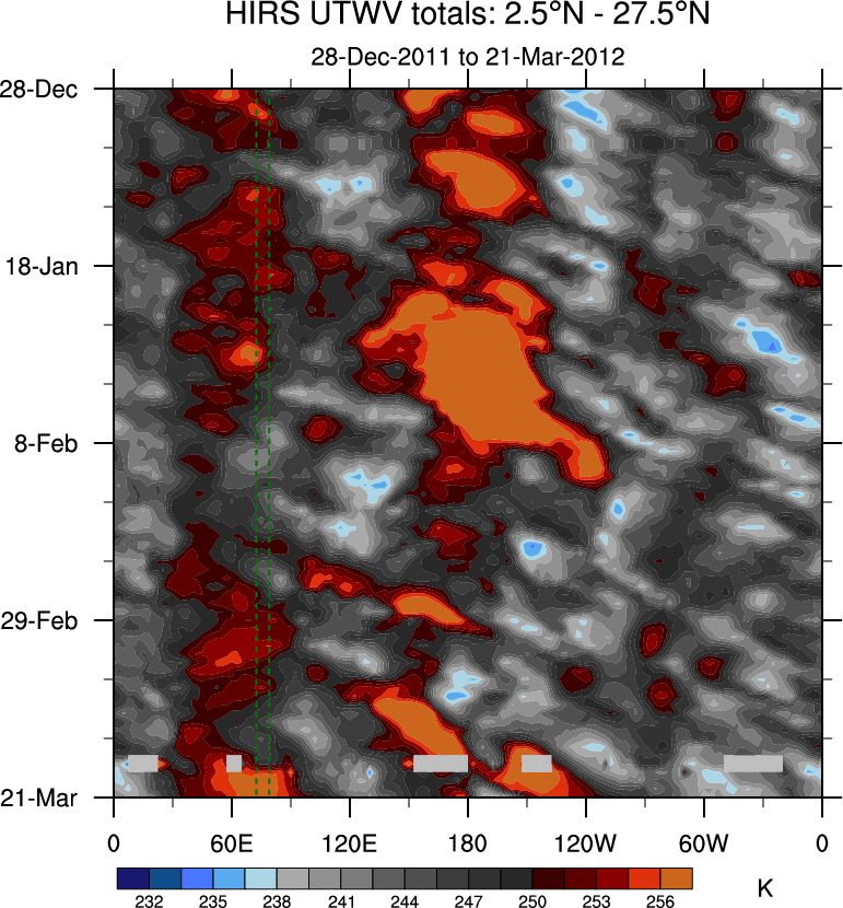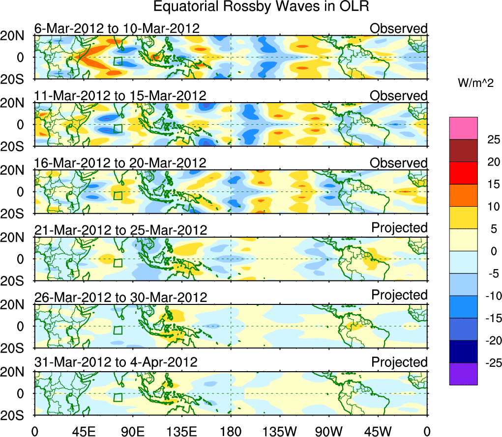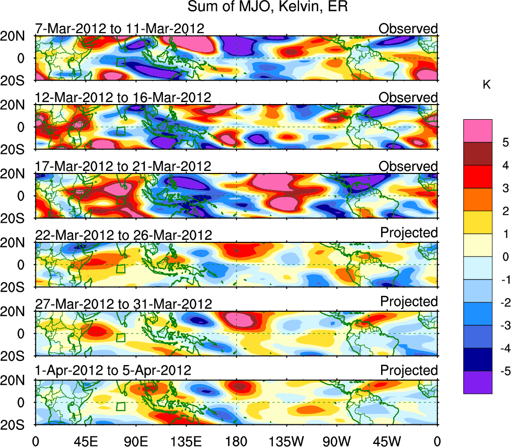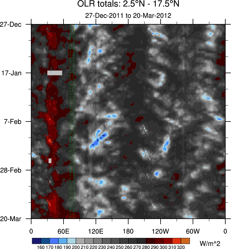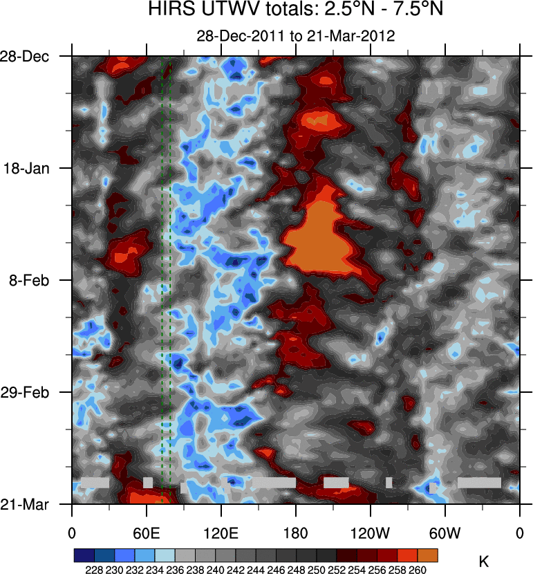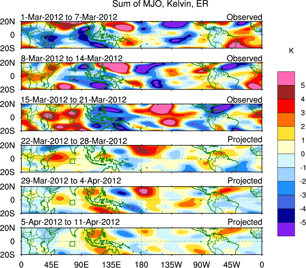 To identify tropical waves in near real-time, the OLR and UTWV data are filtered following Wheeler & Weickmann (2001 MWR). The daily anomalies are calculated using the first 3 harmonics of the seasonal cycle for 1979–2009. Missing values are then filled using linear interpolation in space and time. The most recent 365 days of anomalies are padded with 659 days of zeroes, and the result is filtered for each wave type.