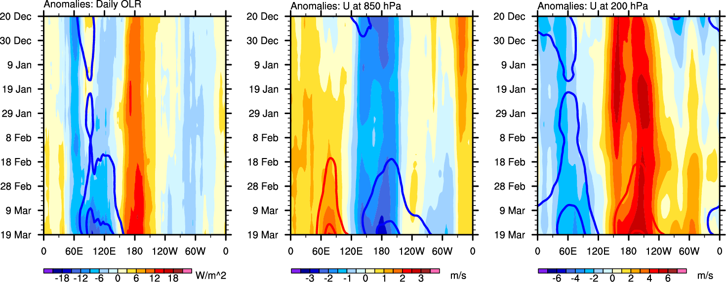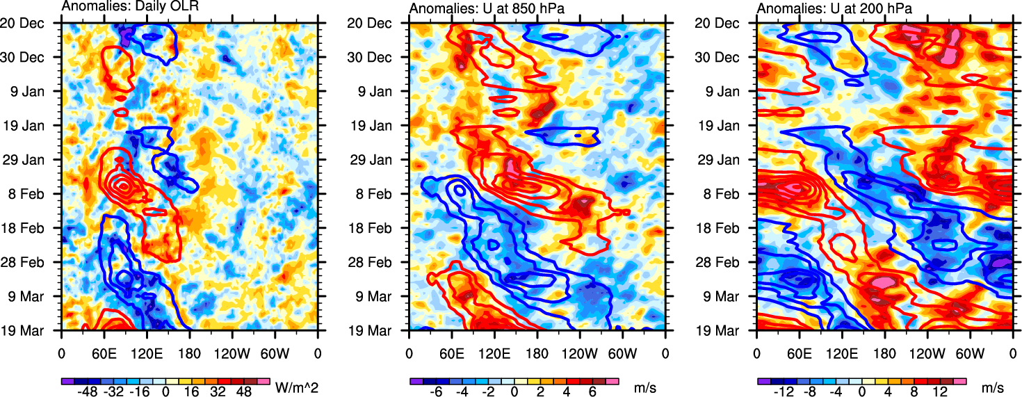 The Hovmollers show longitude-time plots for OLR, U-850, and U-200. The shading indicates the observed anomalies, while the contours are the projection of those anomalies onto the RMM EOFs.