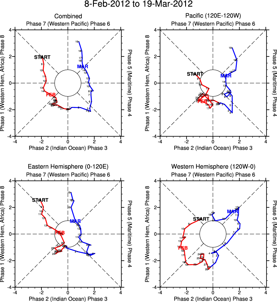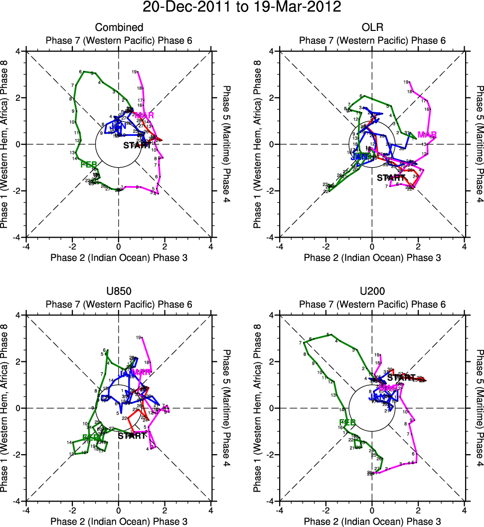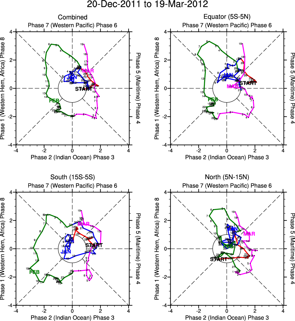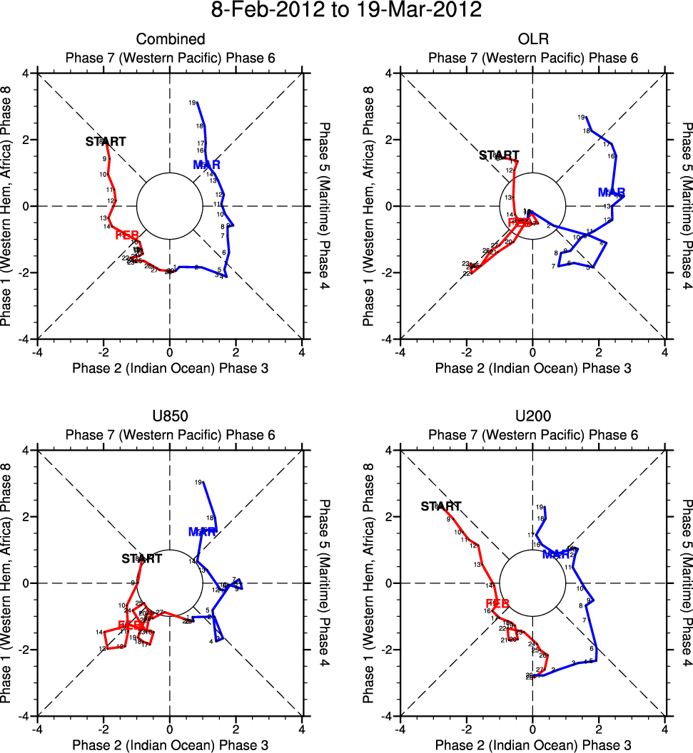 Wheeler and Hendon (2004) constructed the RMM index for monitoring the MJO. This index consists of the first two principal components (PCs) of OLR, 850-hPa zonal wind, and 200-hPa zonal wind averaged 15S-15N.