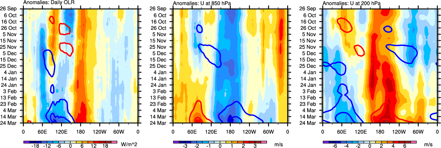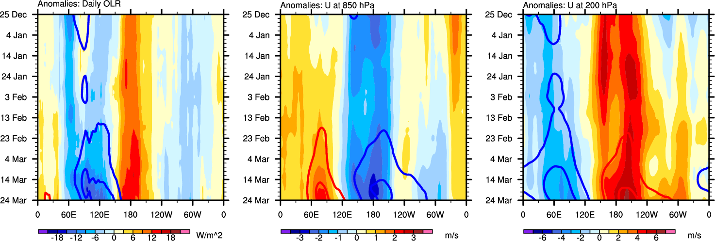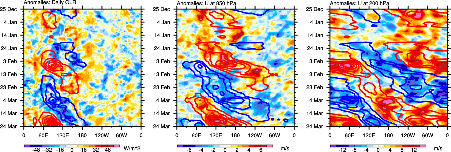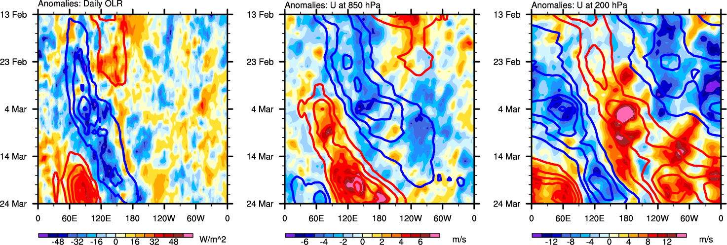 The Hovmollers show longitude-time plots for OLR, U-850, and U-200. The shading indicates the observed anomalies, while the contours are the projection of those anomalies onto the RMM EOFs.
