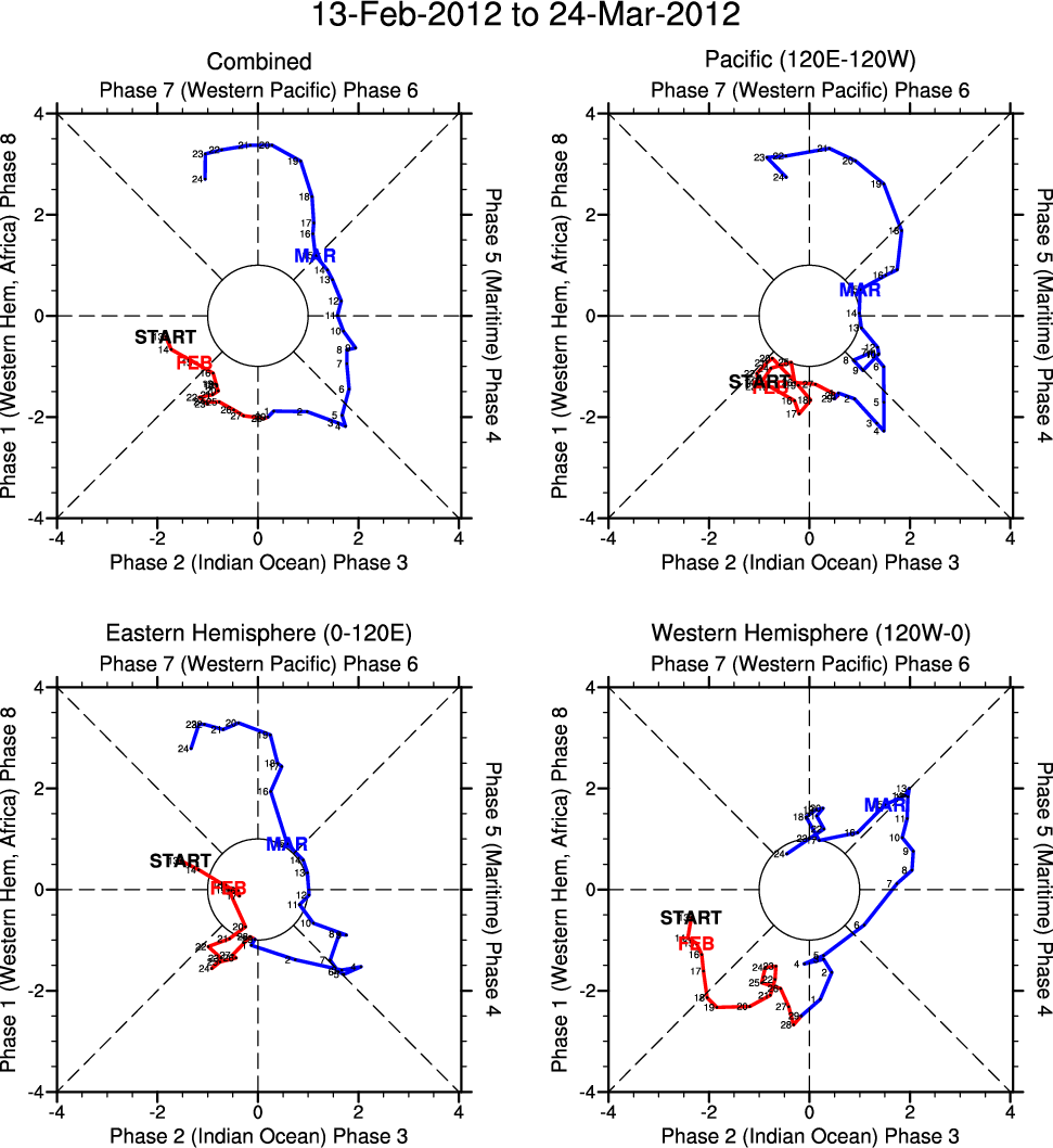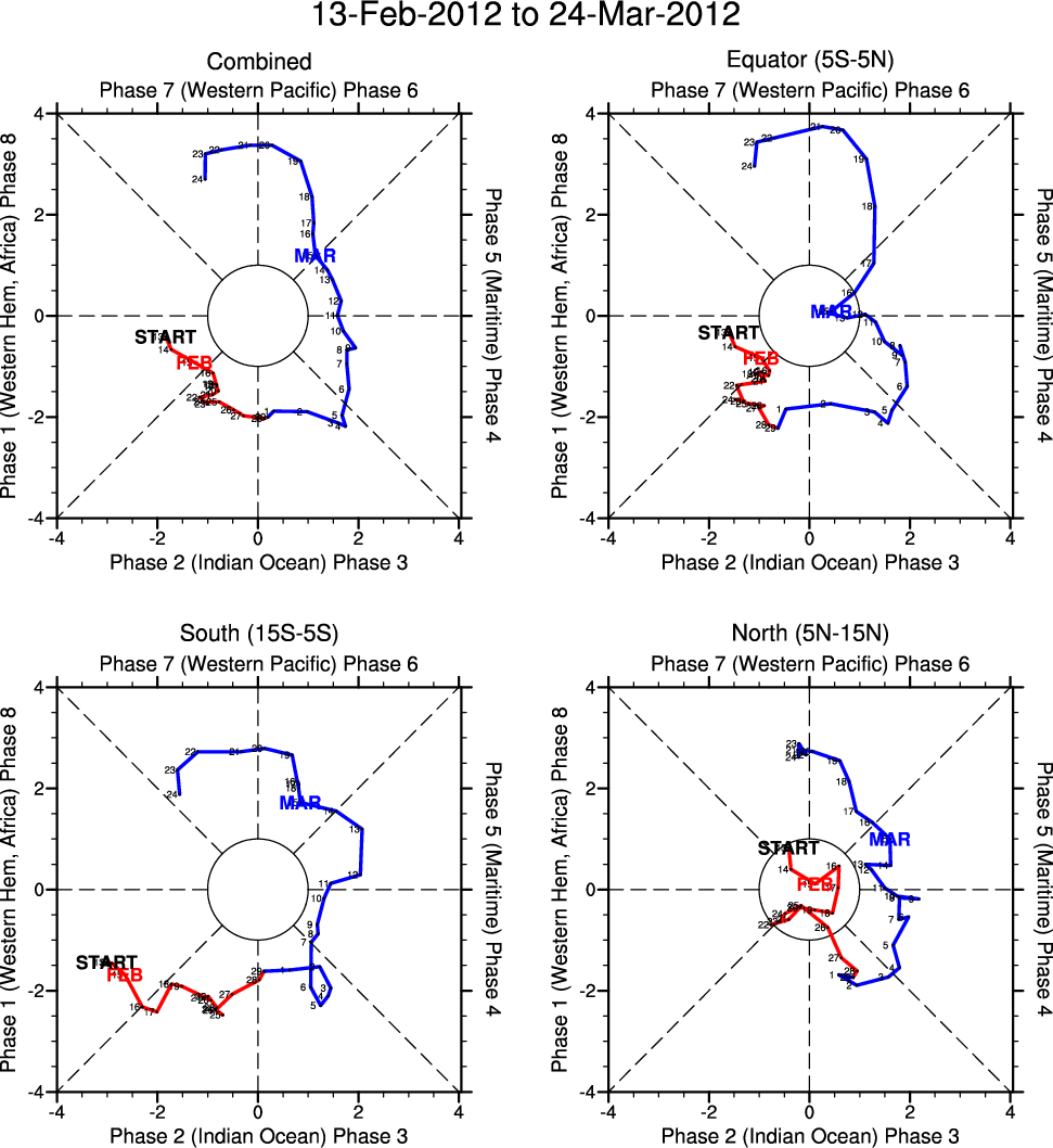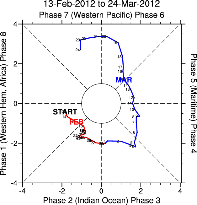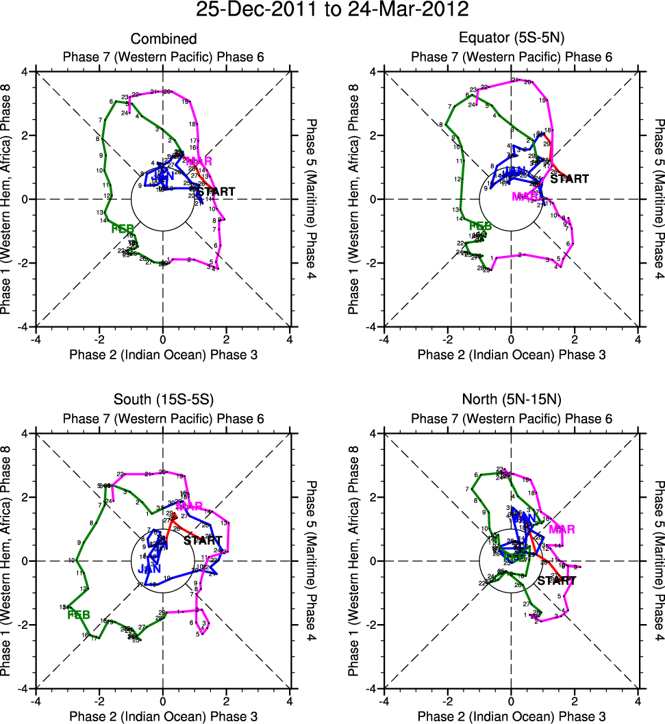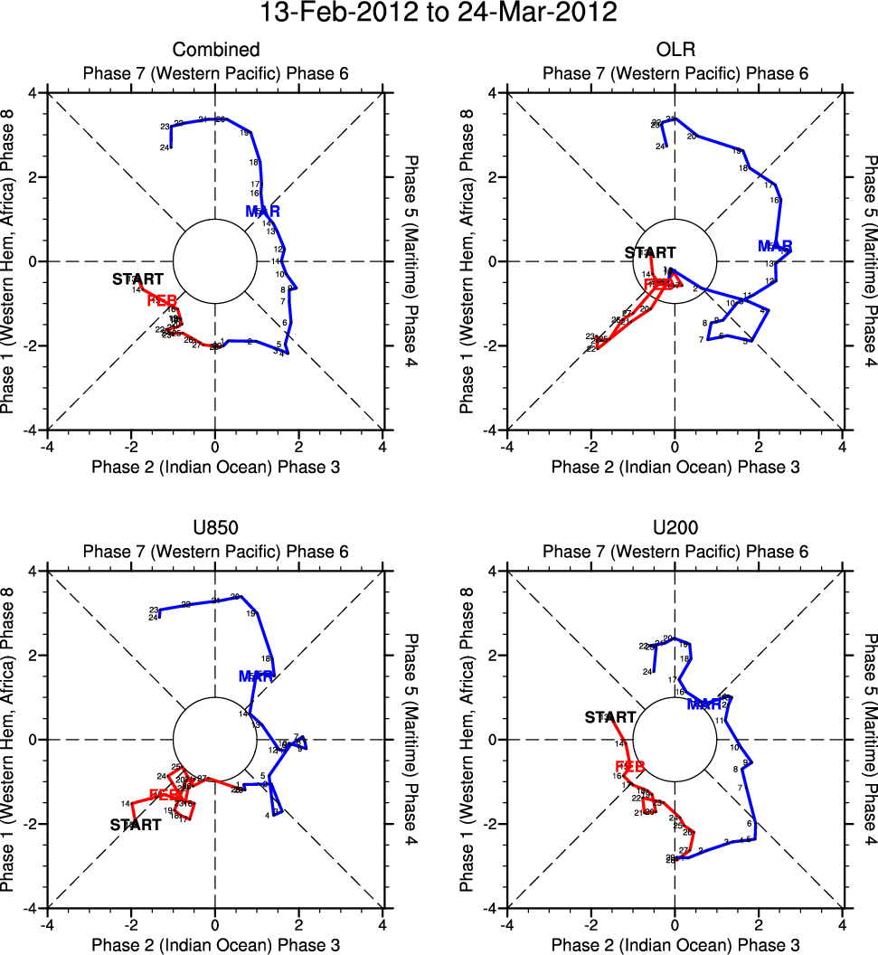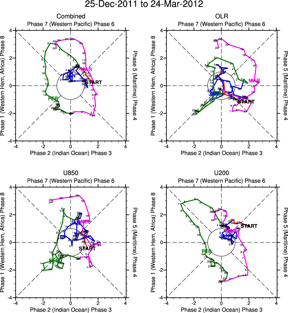 Wheeler and Hendon (2004) constructed the RMM index for monitoring the MJO. This index consists of the first two principal components (PCs) of OLR, 850-hPa zonal wind, and 200-hPa zonal wind averaged 15S-15N.