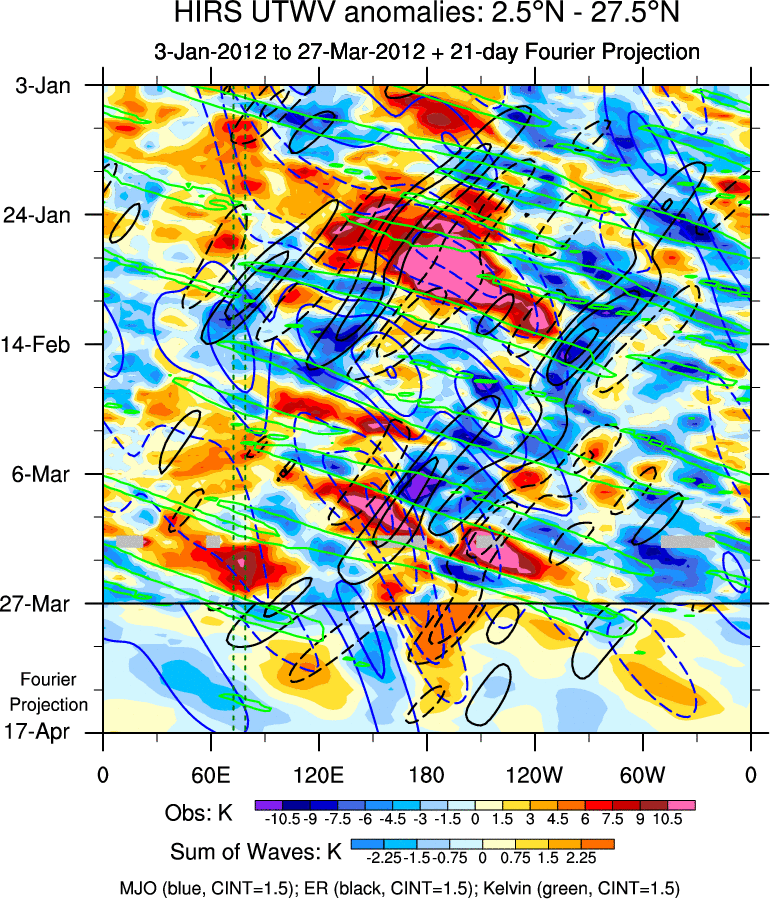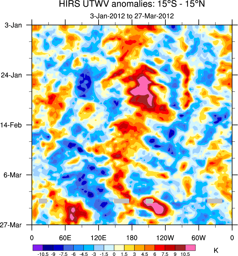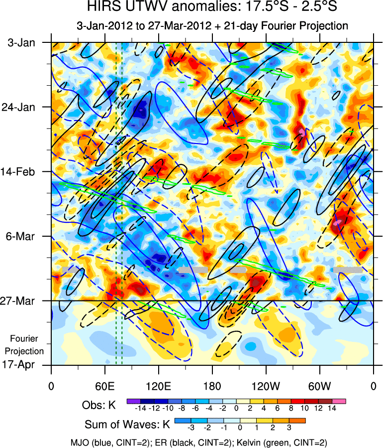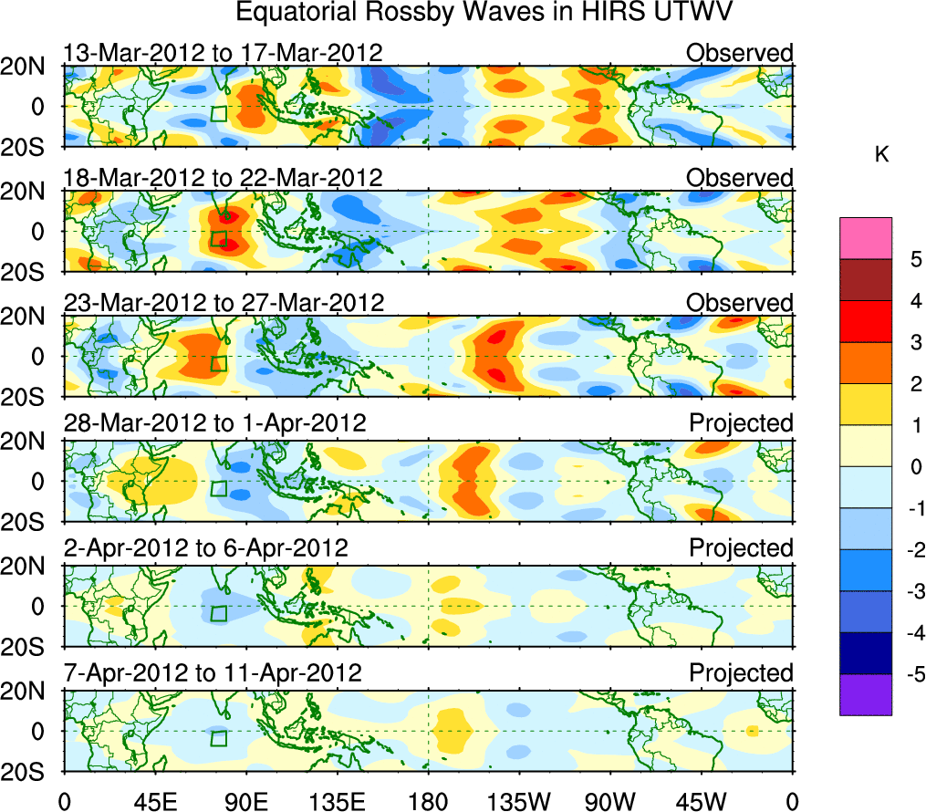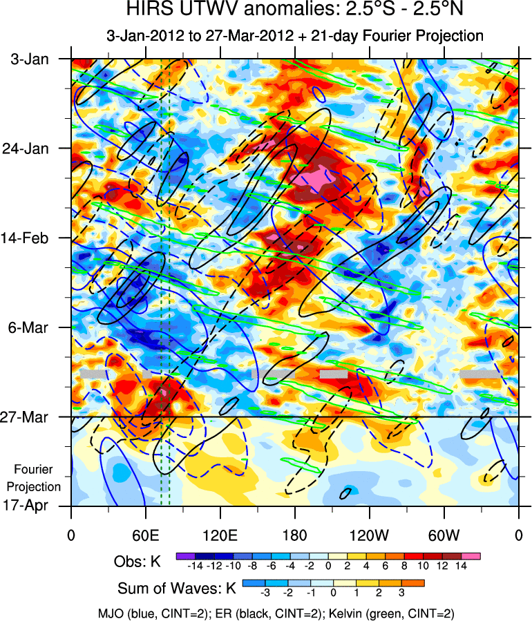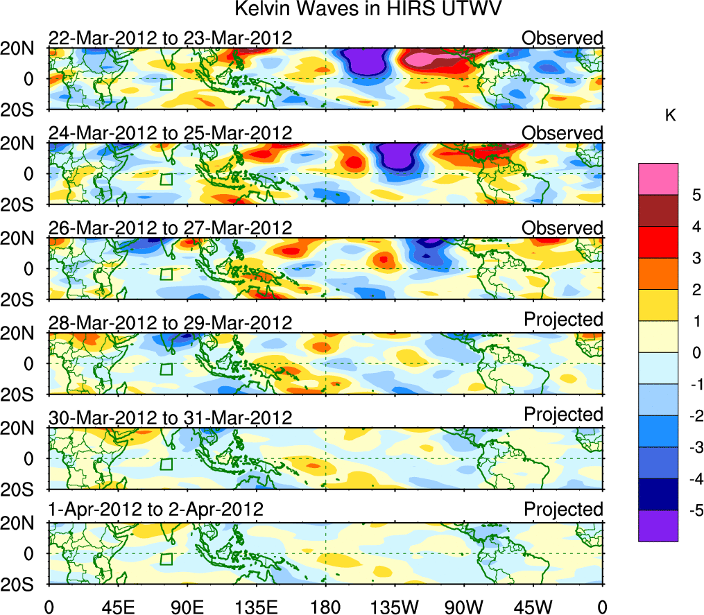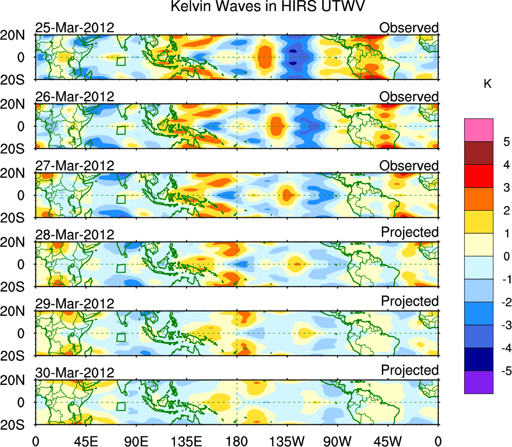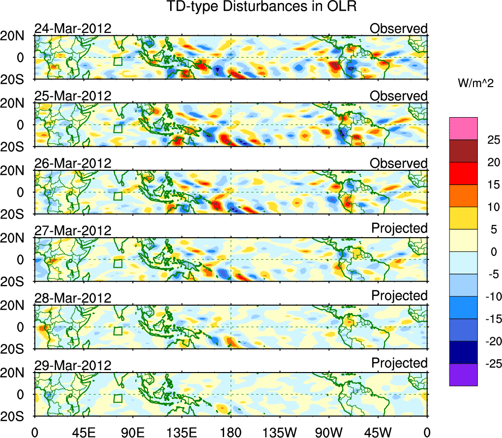 To identify tropical waves in near real-time, the OLR and UTWV data are filtered following Wheeler & Weickmann (2001 MWR). The daily anomalies are calculated using the first 3 harmonics of the seasonal cycle for 1979–2009. Missing values are then filled using linear interpolation in space and time. The most recent 365 days of anomalies are padded with 659 days of zeroes, and the result is filtered for each wave type.