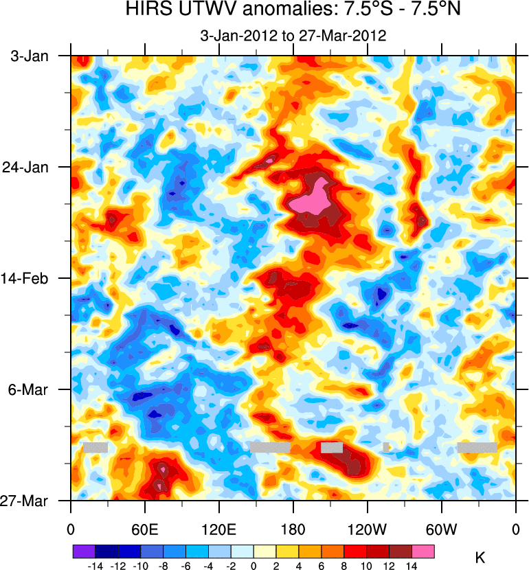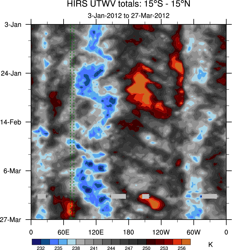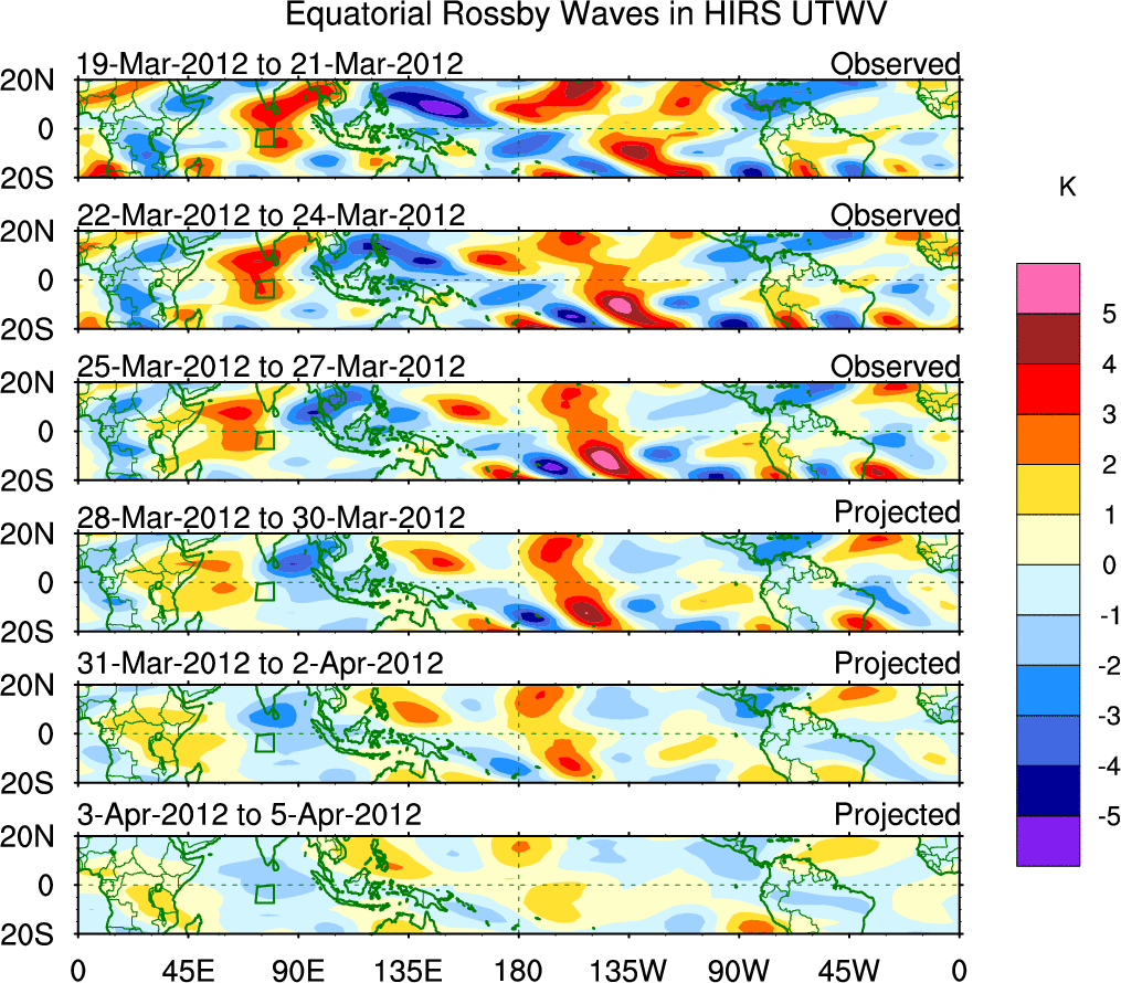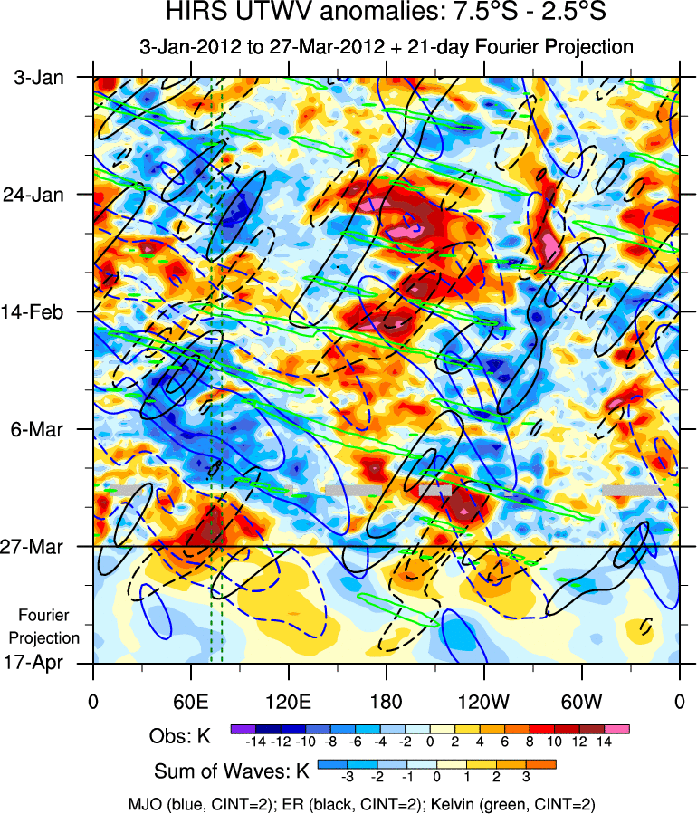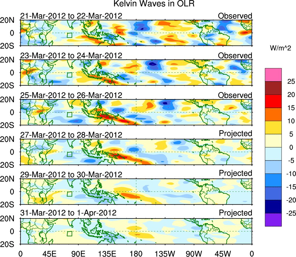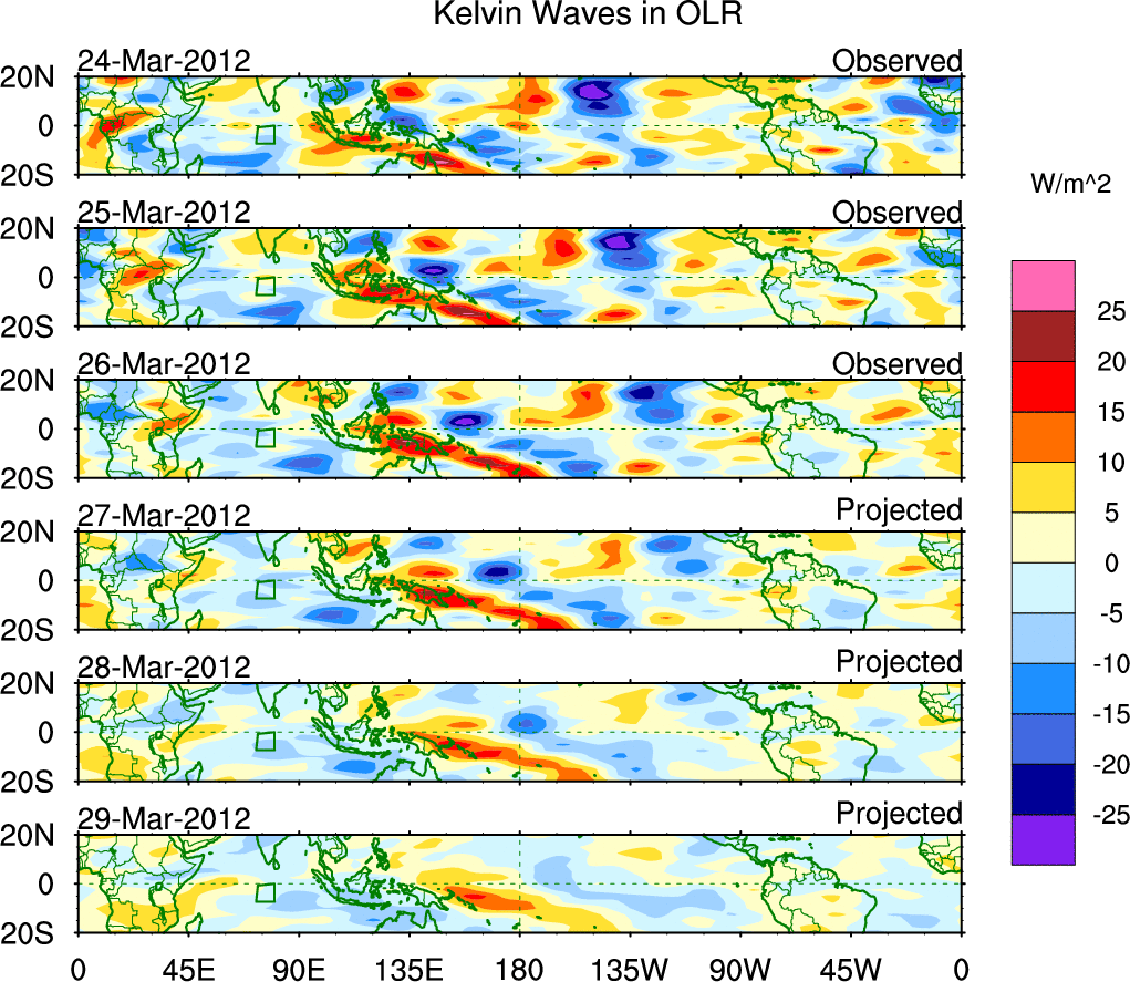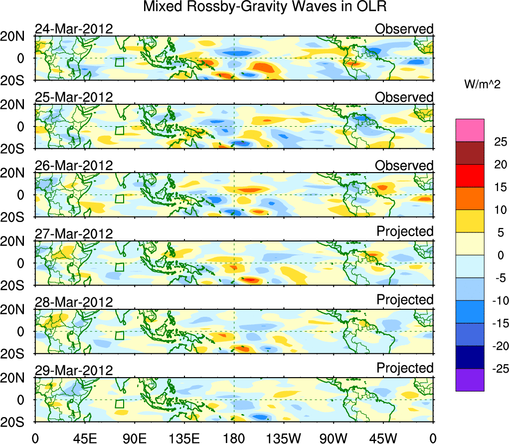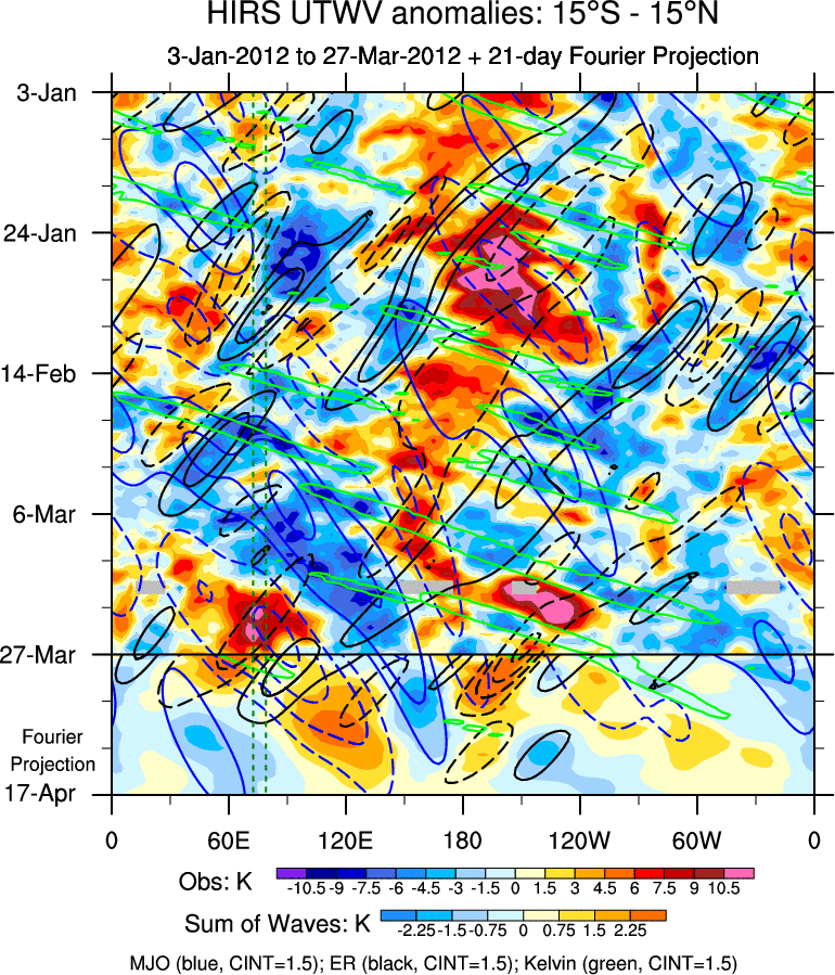 To identify tropical waves in near real-time, the OLR and UTWV data are filtered following Wheeler & Weickmann (2001 MWR). The daily anomalies are calculated using the first 3 harmonics of the seasonal cycle for 1979–2009. Missing values are then filled using linear interpolation in space and time. The most recent 365 days of anomalies are padded with 659 days of zeroes, and the result is filtered for each wave type.