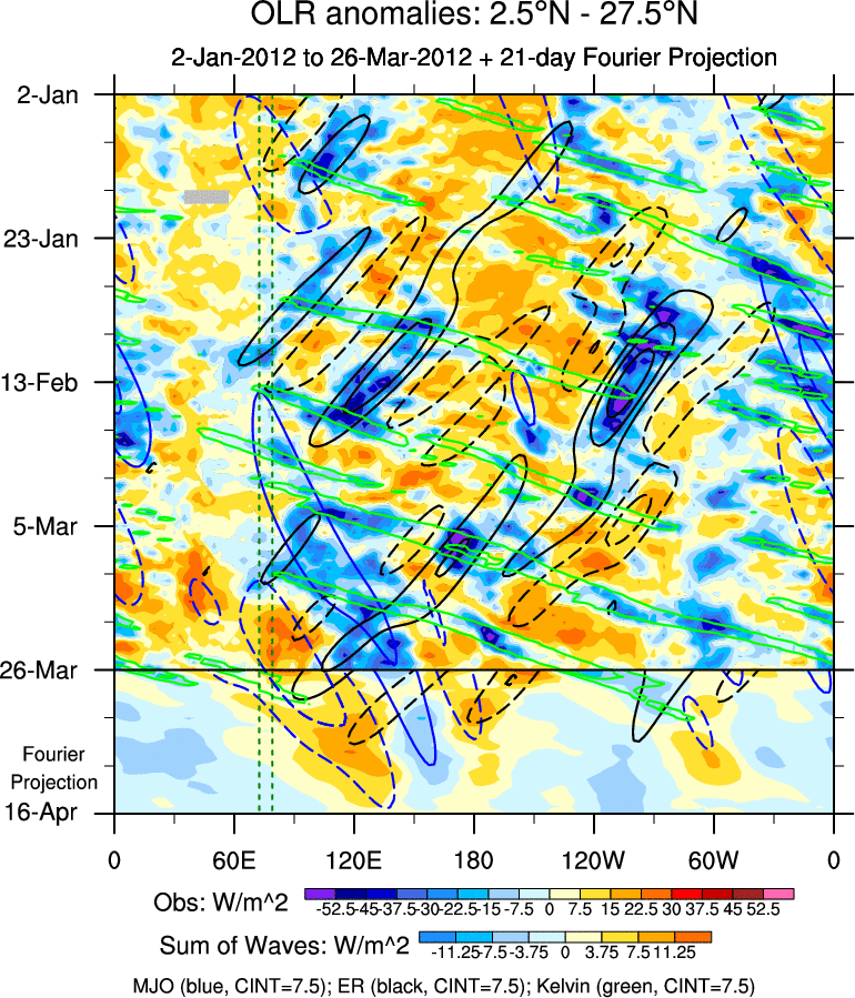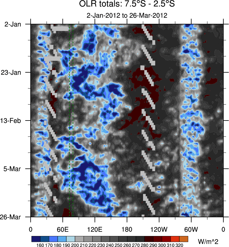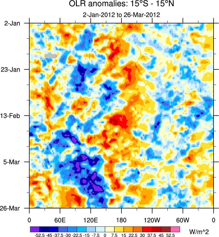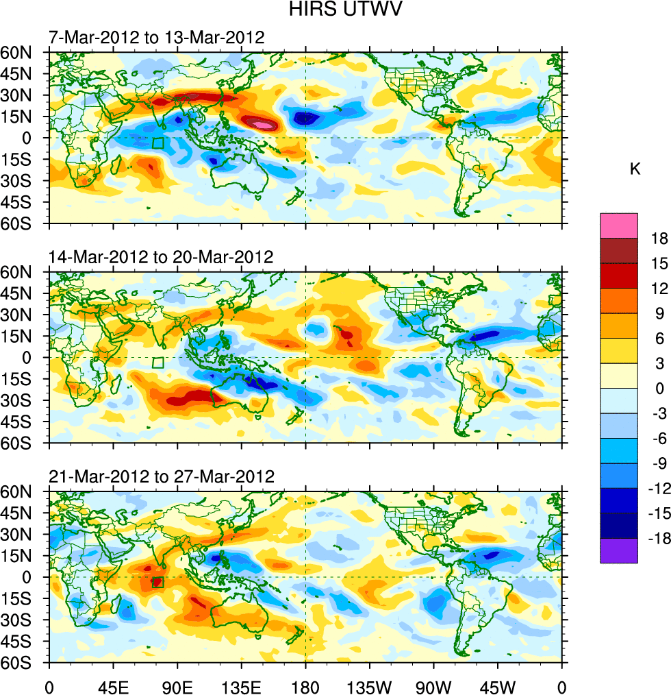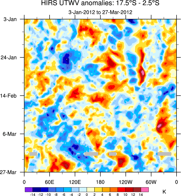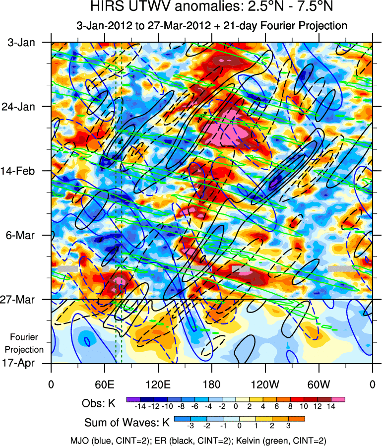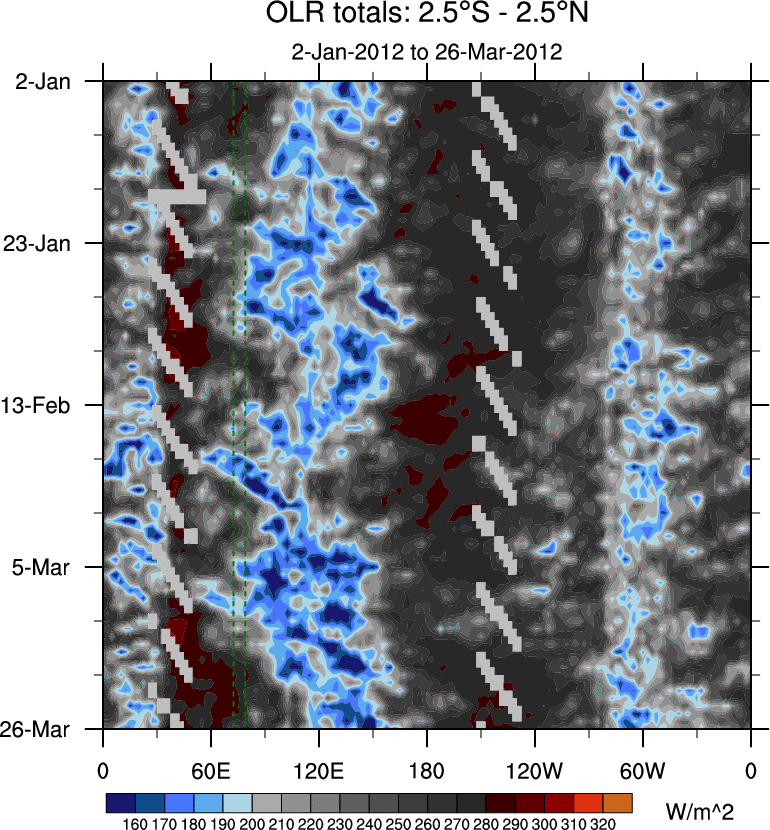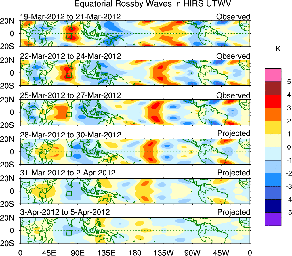 To identify tropical waves in near real-time, the OLR and UTWV data are filtered following Wheeler & Weickmann (2001 MWR). The daily anomalies are calculated using the first 3 harmonics of the seasonal cycle for 1979–2009. Missing values are then filled using linear interpolation in space and time. The most recent 365 days of anomalies are padded with 659 days of zeroes, and the result is filtered for each wave type.