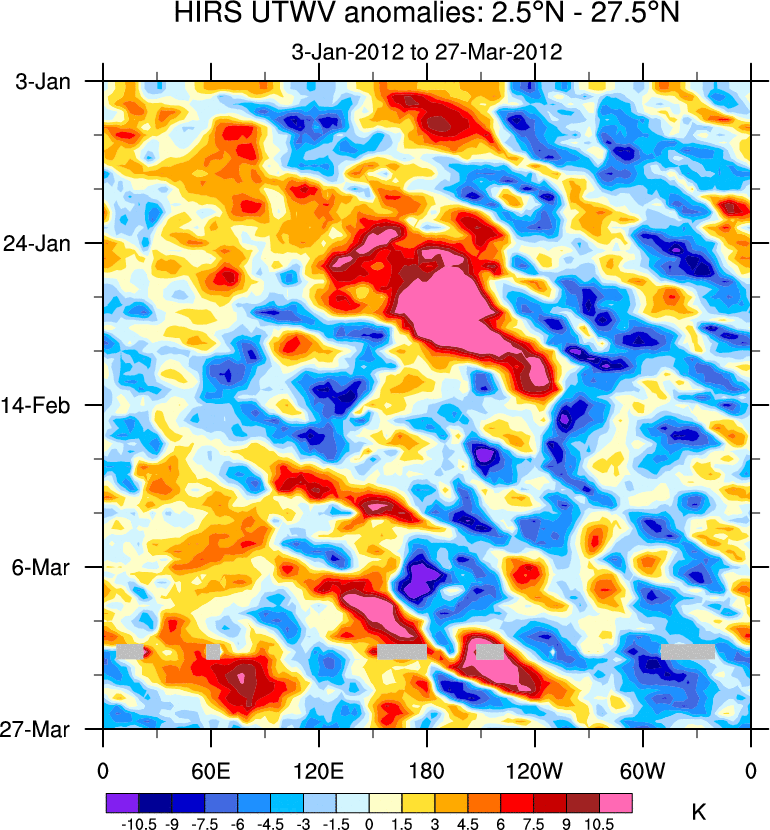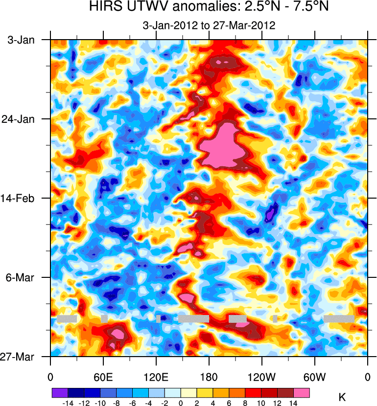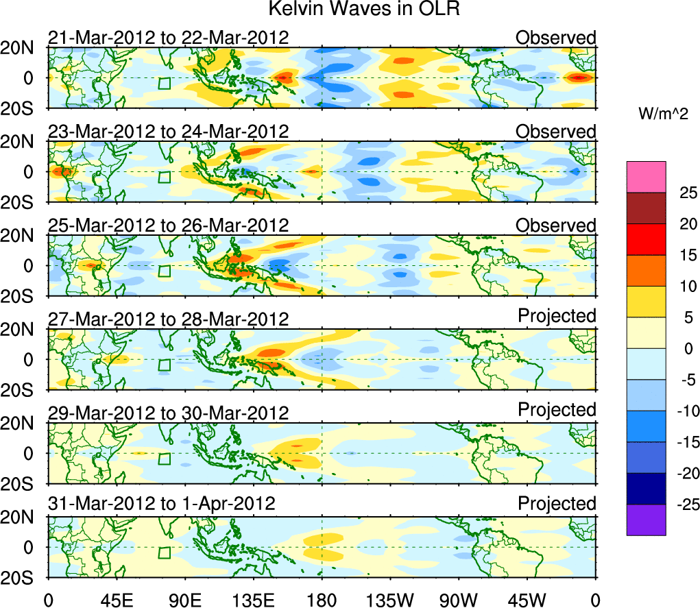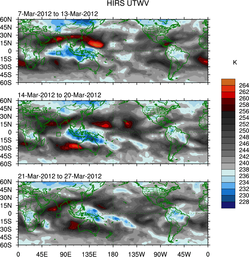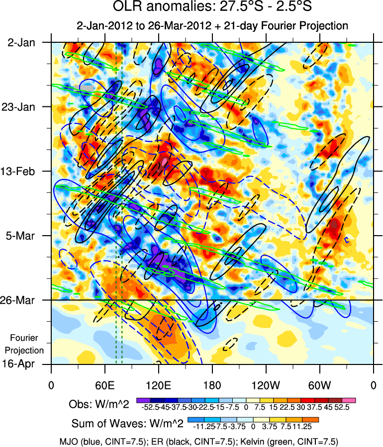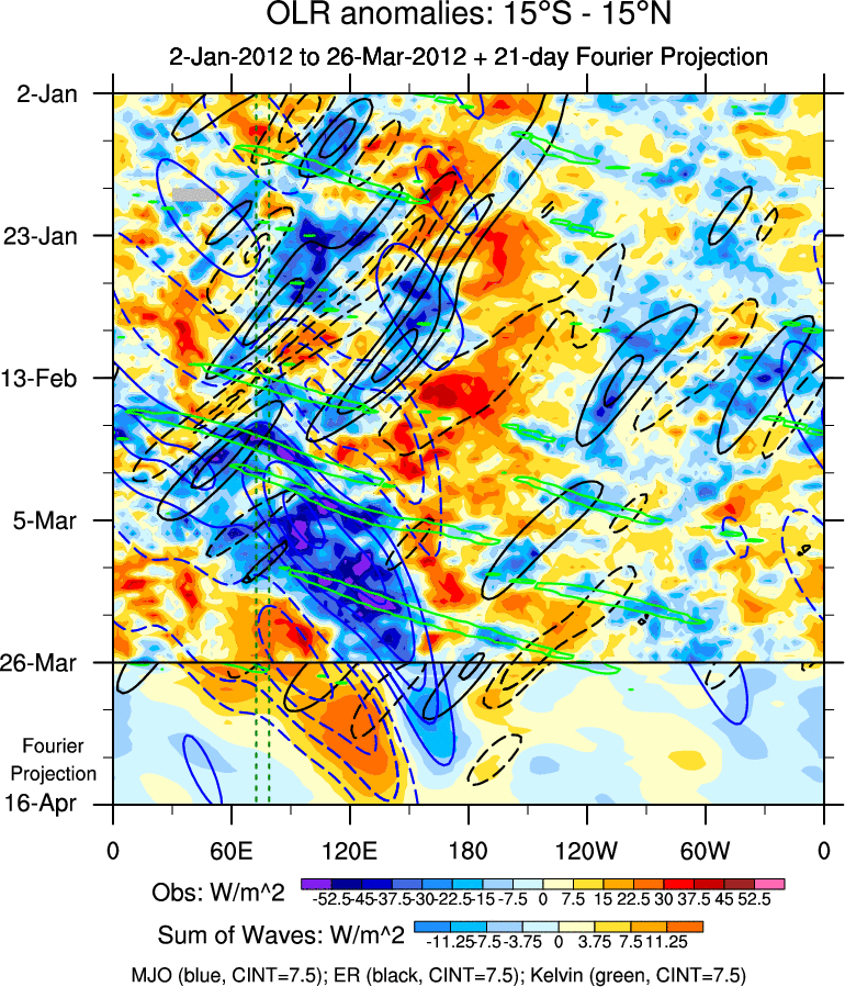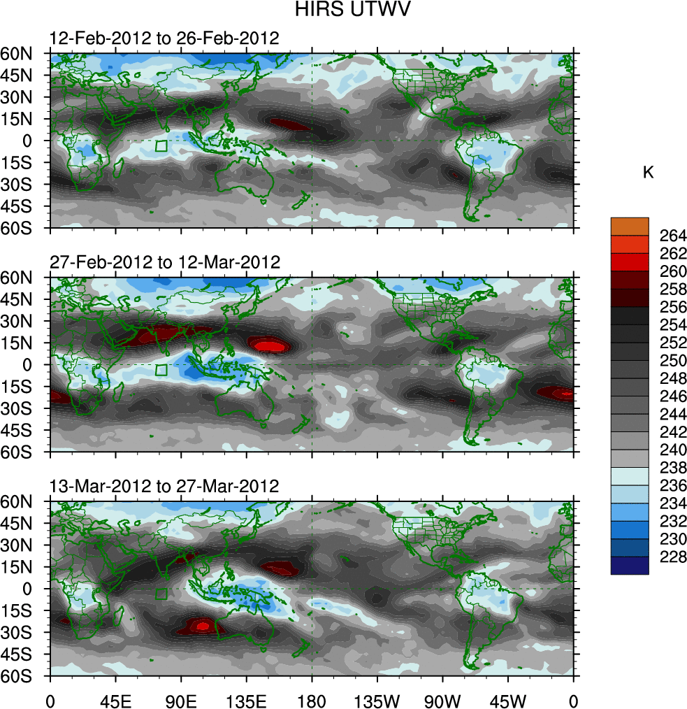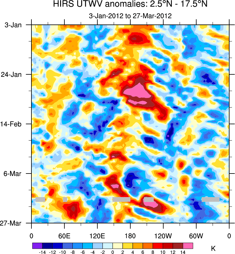 To identify tropical waves in near real-time, the OLR and UTWV data are filtered following Wheeler & Weickmann (2001 MWR). The daily anomalies are calculated using the first 3 harmonics of the seasonal cycle for 1979–2009. Missing values are then filled using linear interpolation in space and time. The most recent 365 days of anomalies are padded with 659 days of zeroes, and the result is filtered for each wave type.