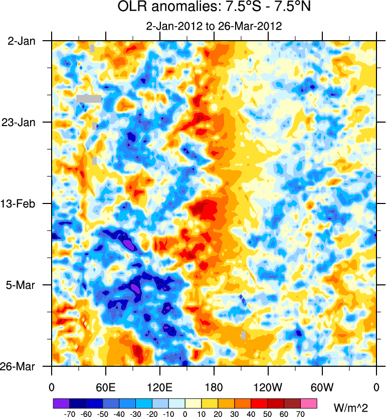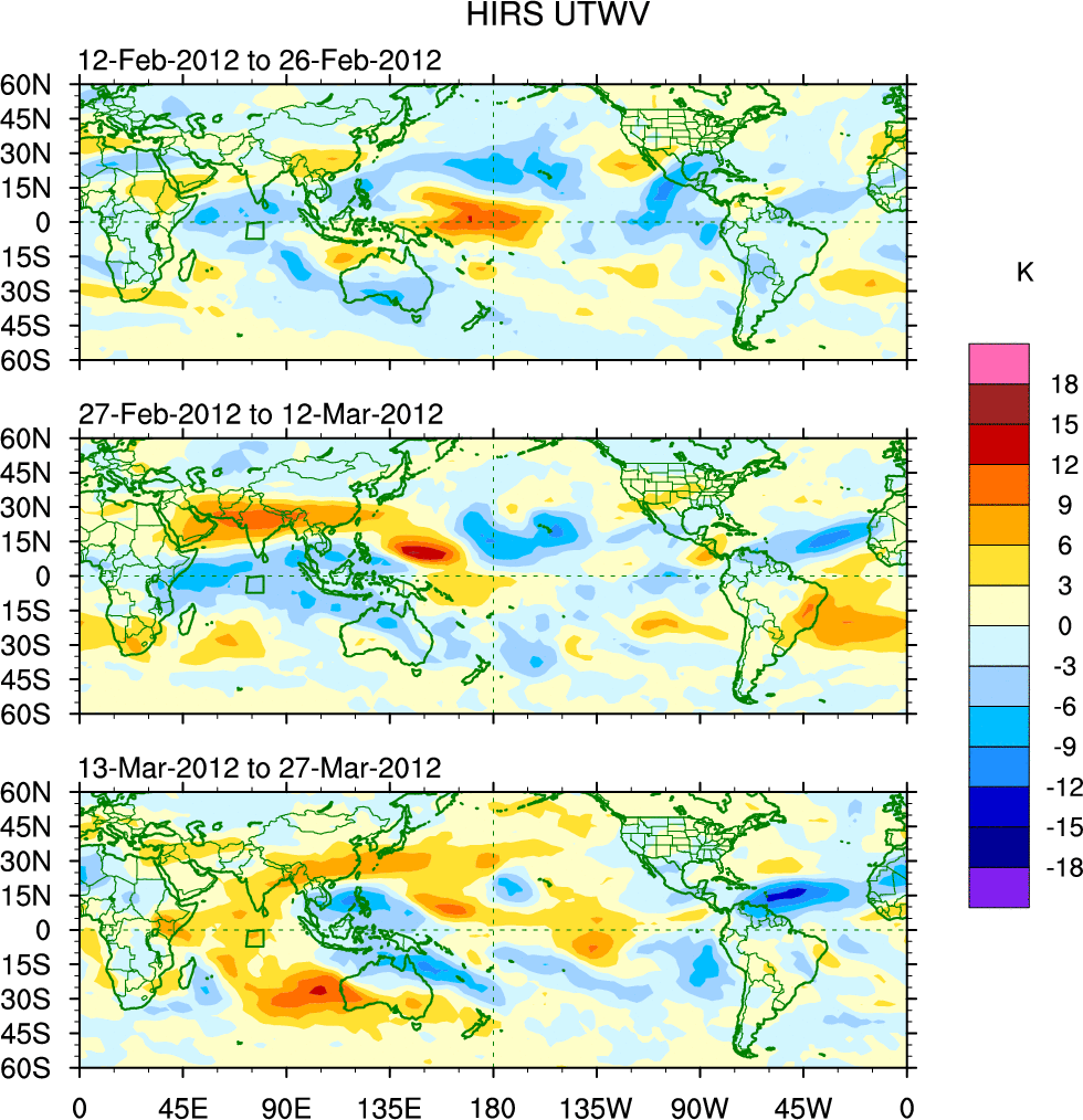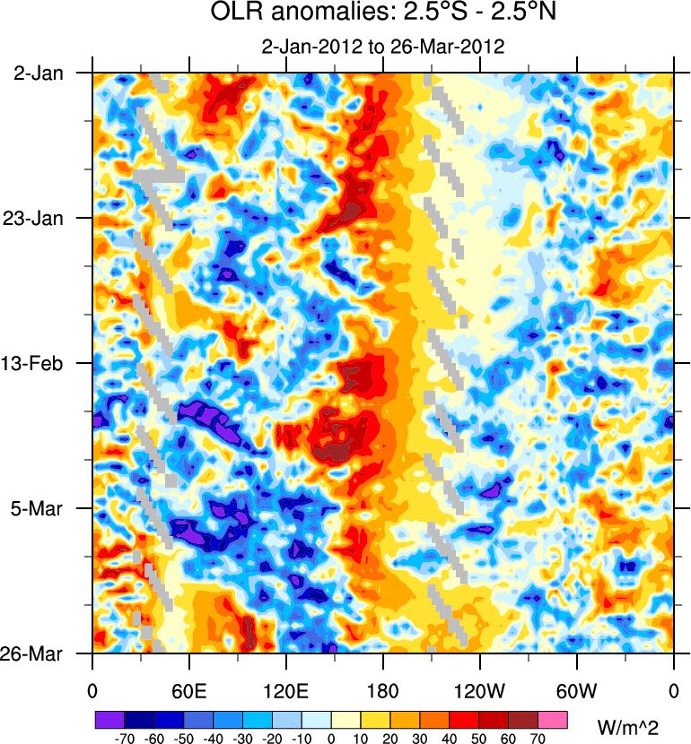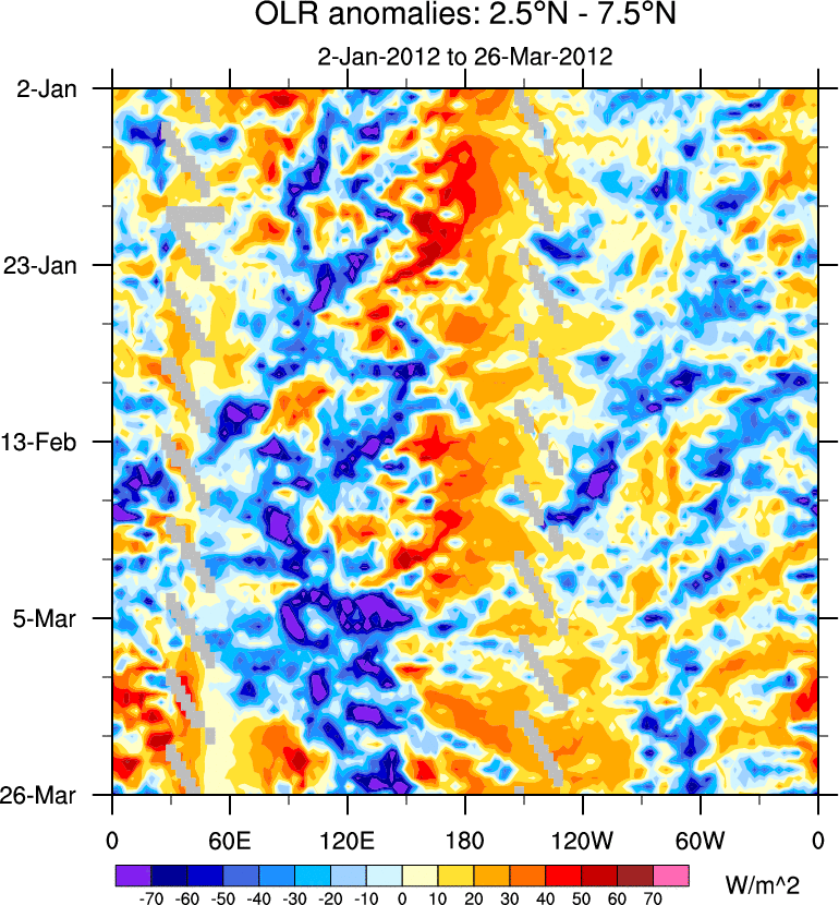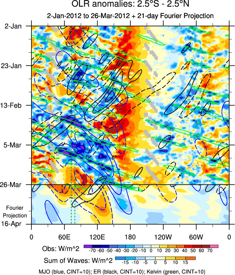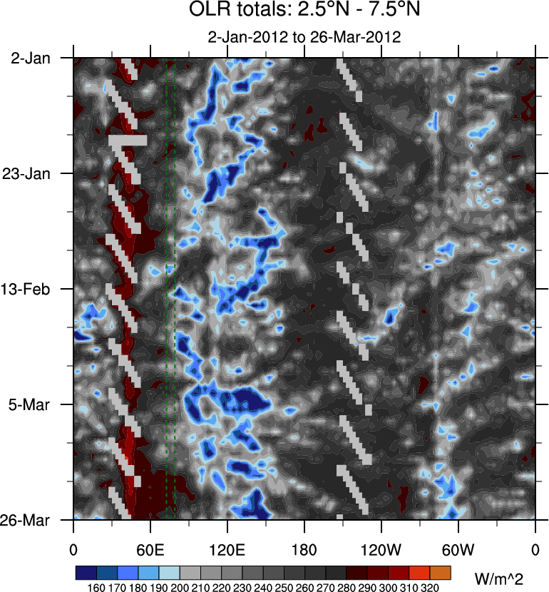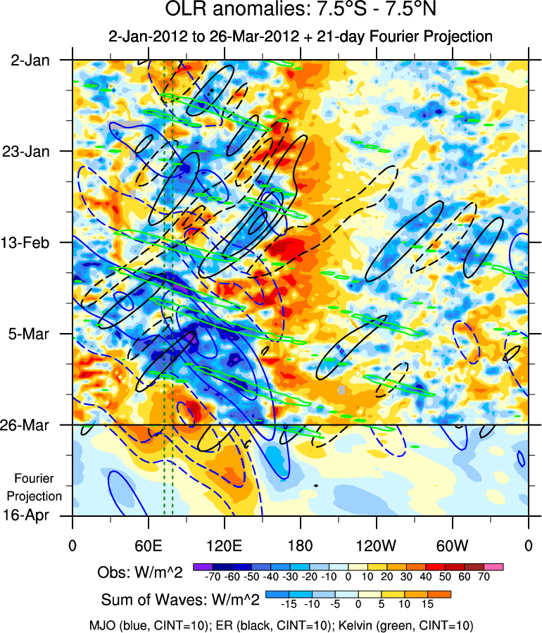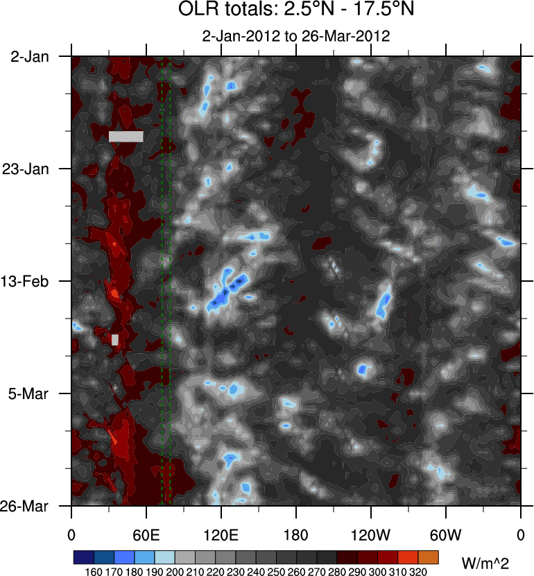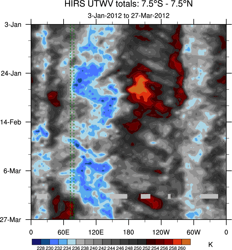 To identify tropical waves in near real-time, the OLR and UTWV data are filtered following Wheeler & Weickmann (2001 MWR). The daily anomalies are calculated using the first 3 harmonics of the seasonal cycle for 1979–2009. Missing values are then filled using linear interpolation in space and time. The most recent 365 days of anomalies are padded with 659 days of zeroes, and the result is filtered for each wave type.