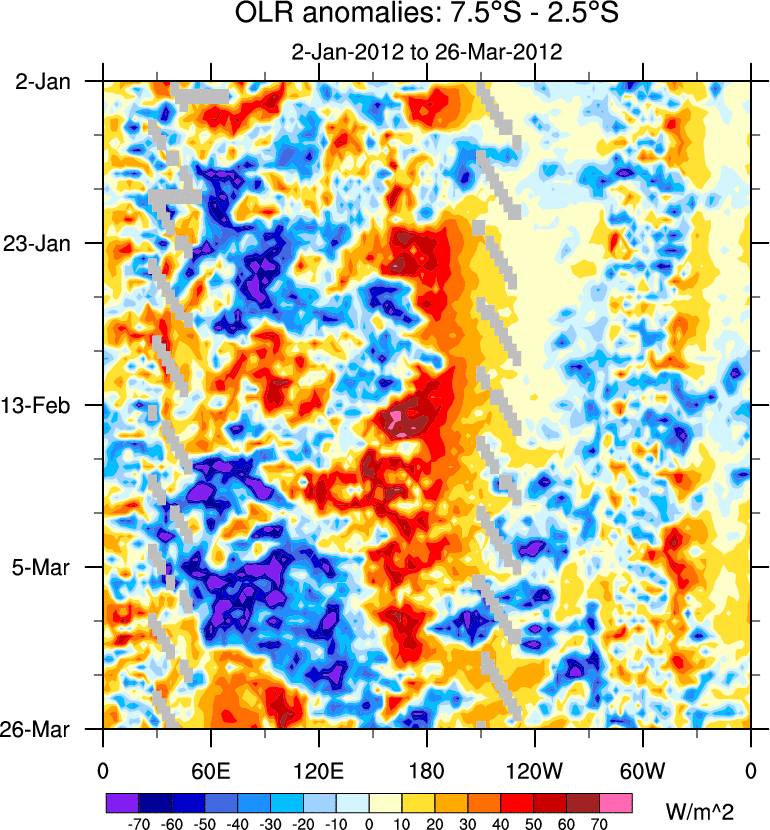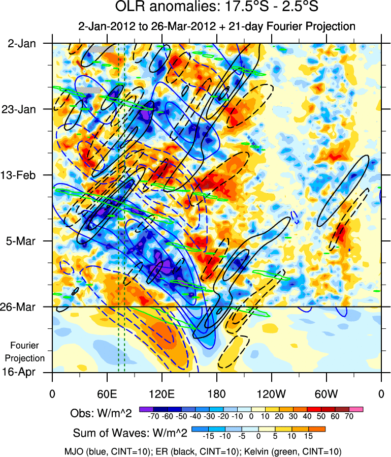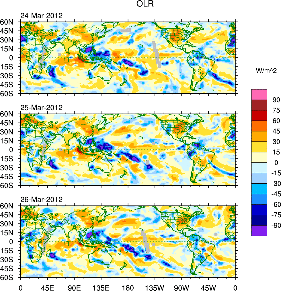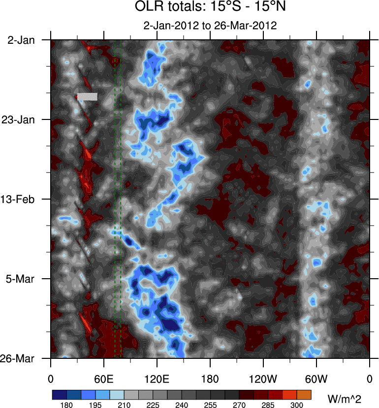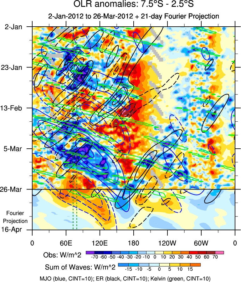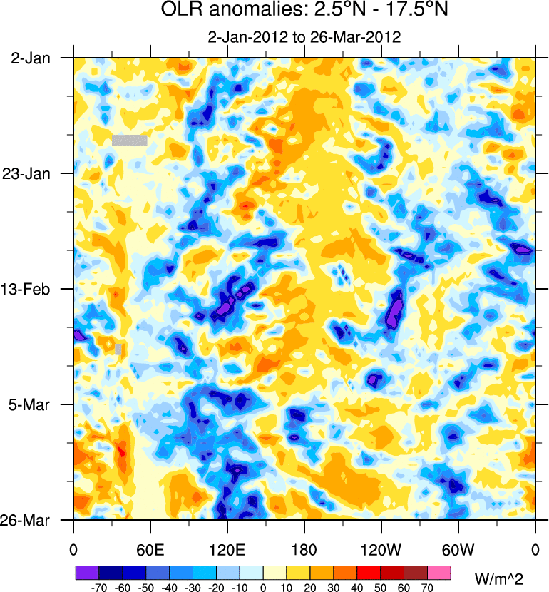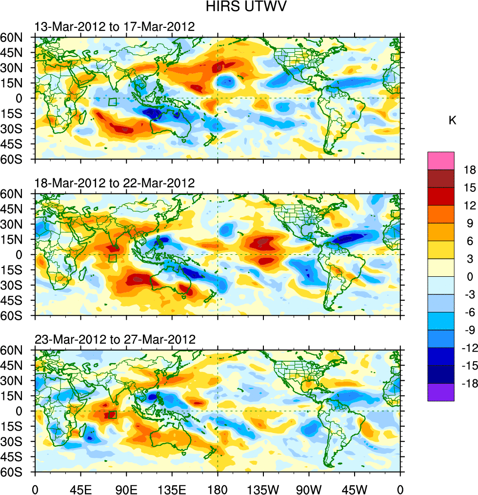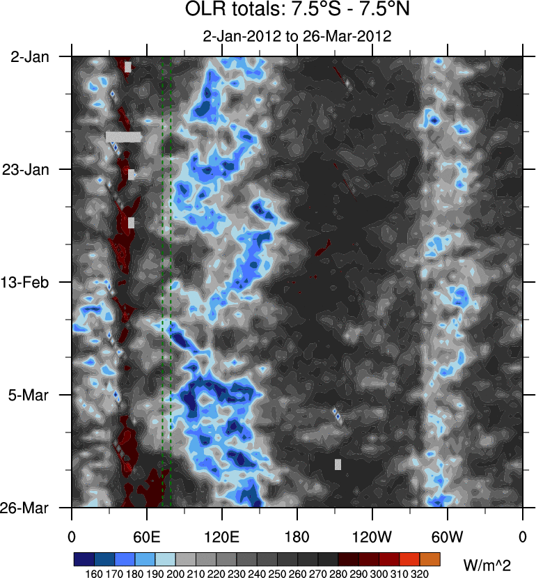 To identify tropical waves in near real-time, the OLR and UTWV data are filtered following Wheeler & Weickmann (2001 MWR). The daily anomalies are calculated using the first 3 harmonics of the seasonal cycle for 1979–2009. Missing values are then filled using linear interpolation in space and time. The most recent 365 days of anomalies are padded with 659 days of zeroes, and the result is filtered for each wave type.