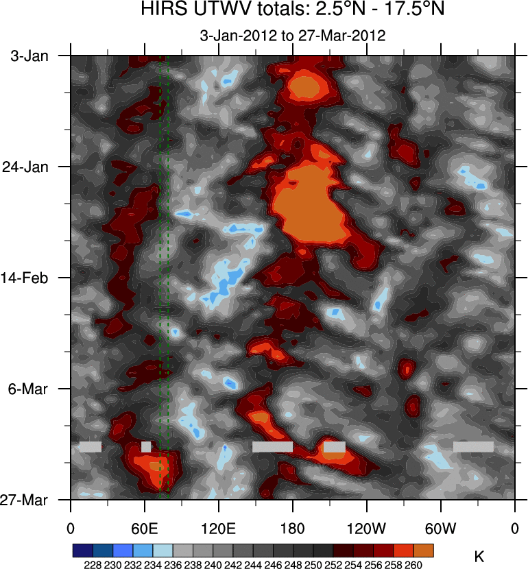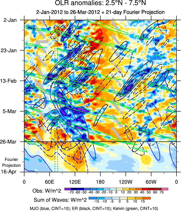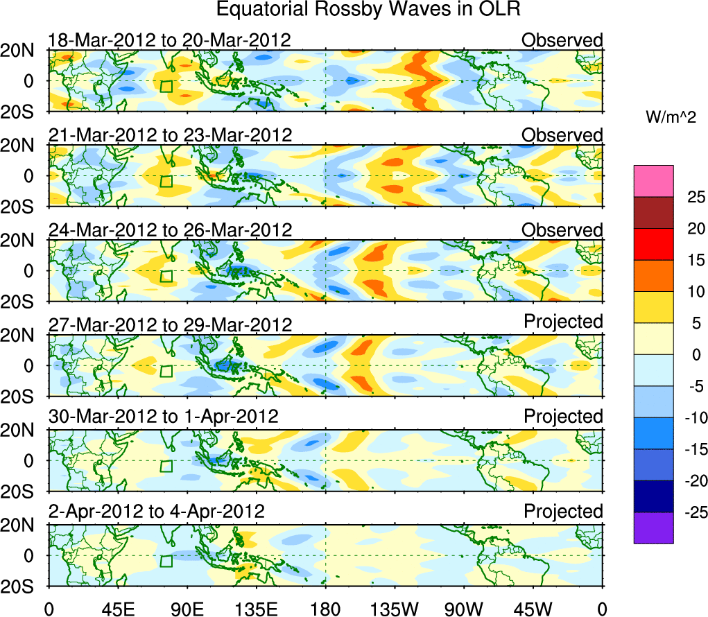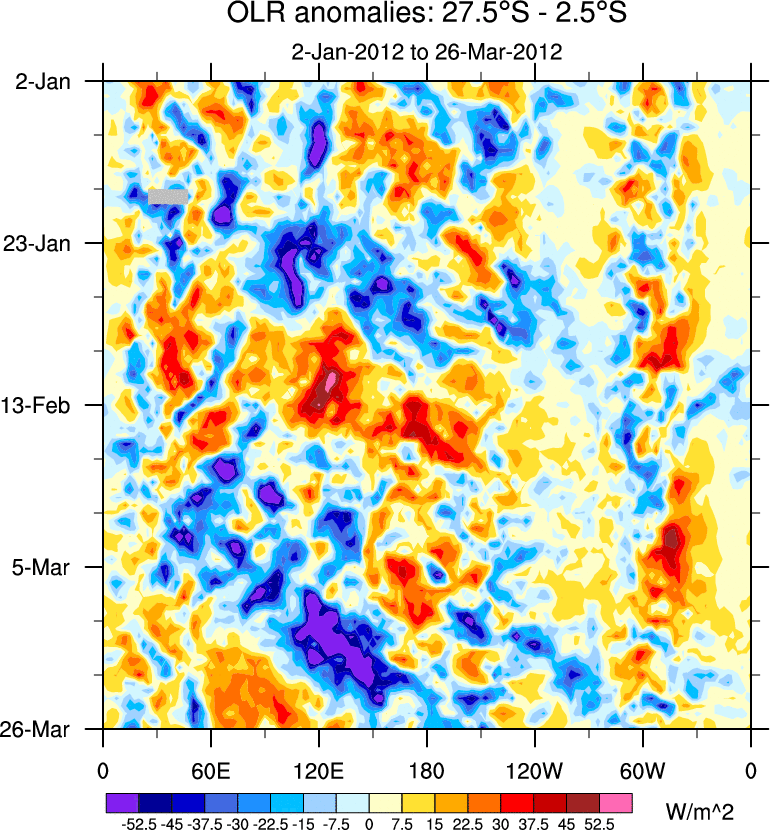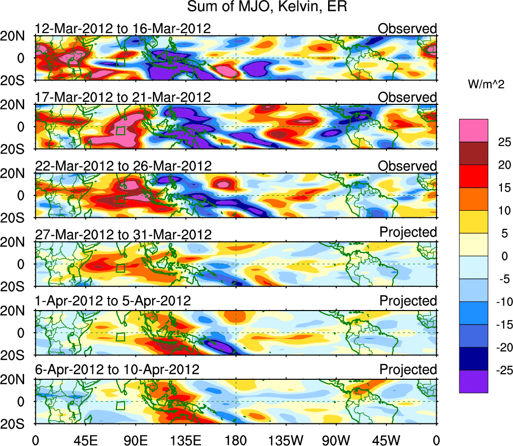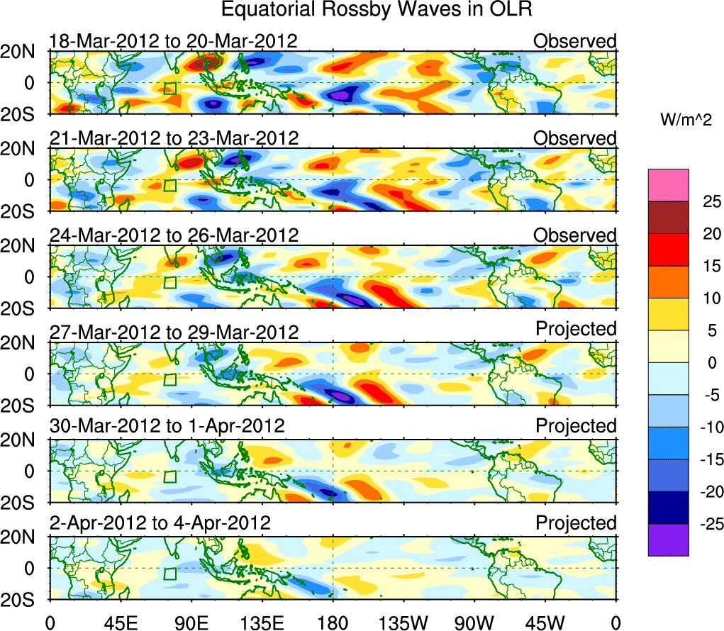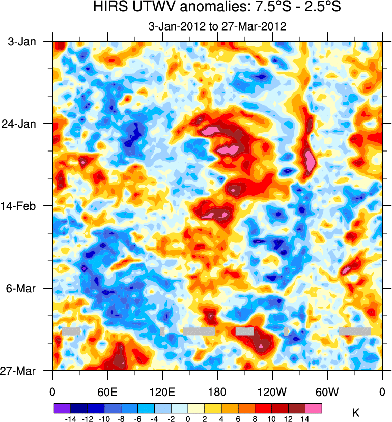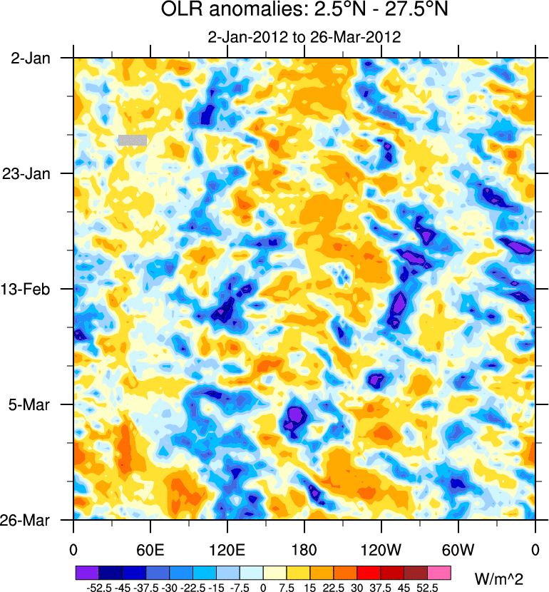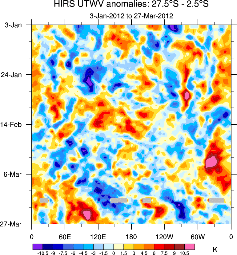 To identify tropical waves in near real-time, the OLR and UTWV data are filtered following Wheeler & Weickmann (2001 MWR). The daily anomalies are calculated using the first 3 harmonics of the seasonal cycle for 1979–2009. Missing values are then filled using linear interpolation in space and time. The most recent 365 days of anomalies are padded with 659 days of zeroes, and the result is filtered for each wave type.