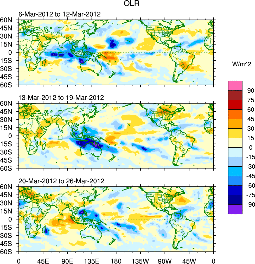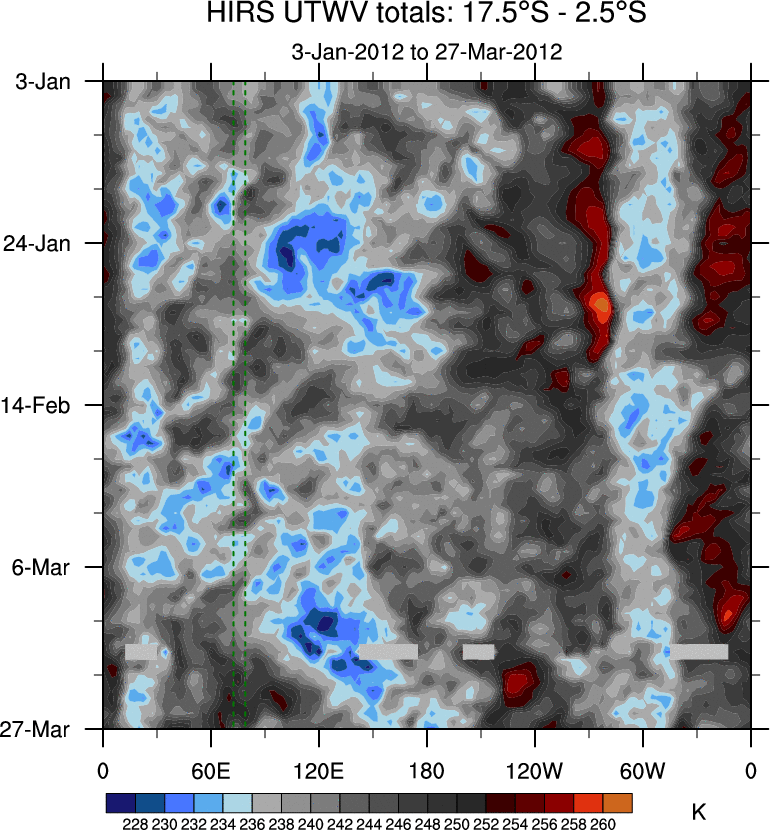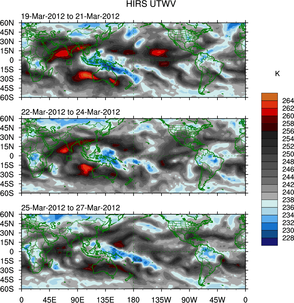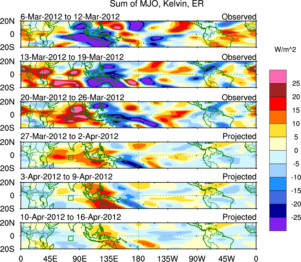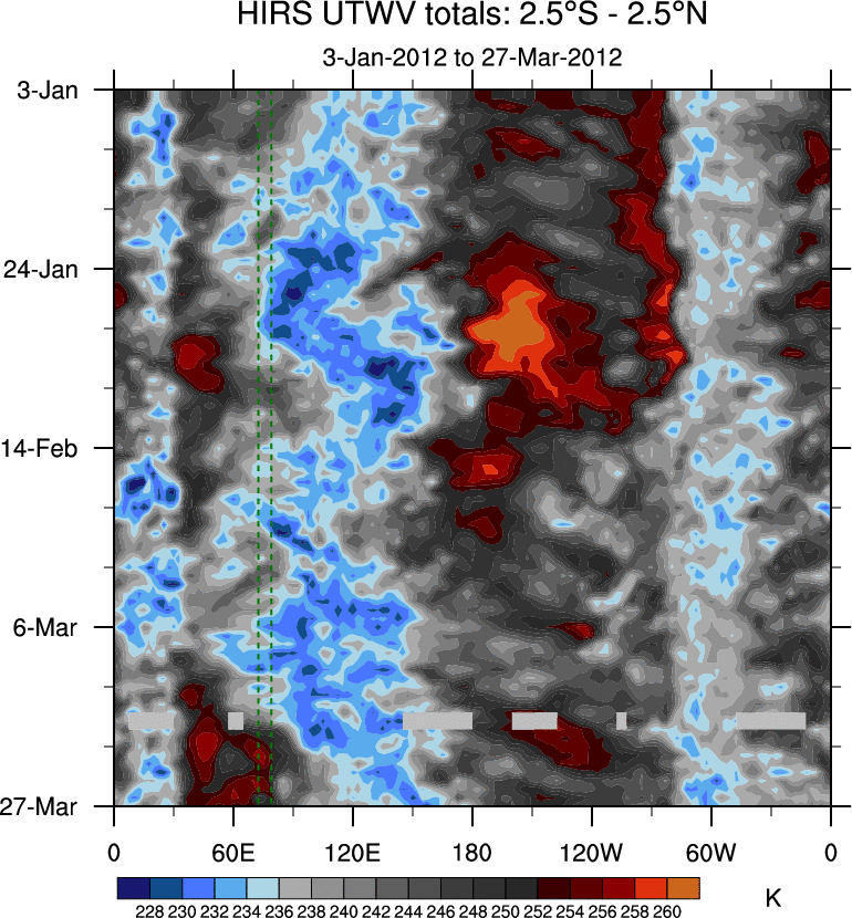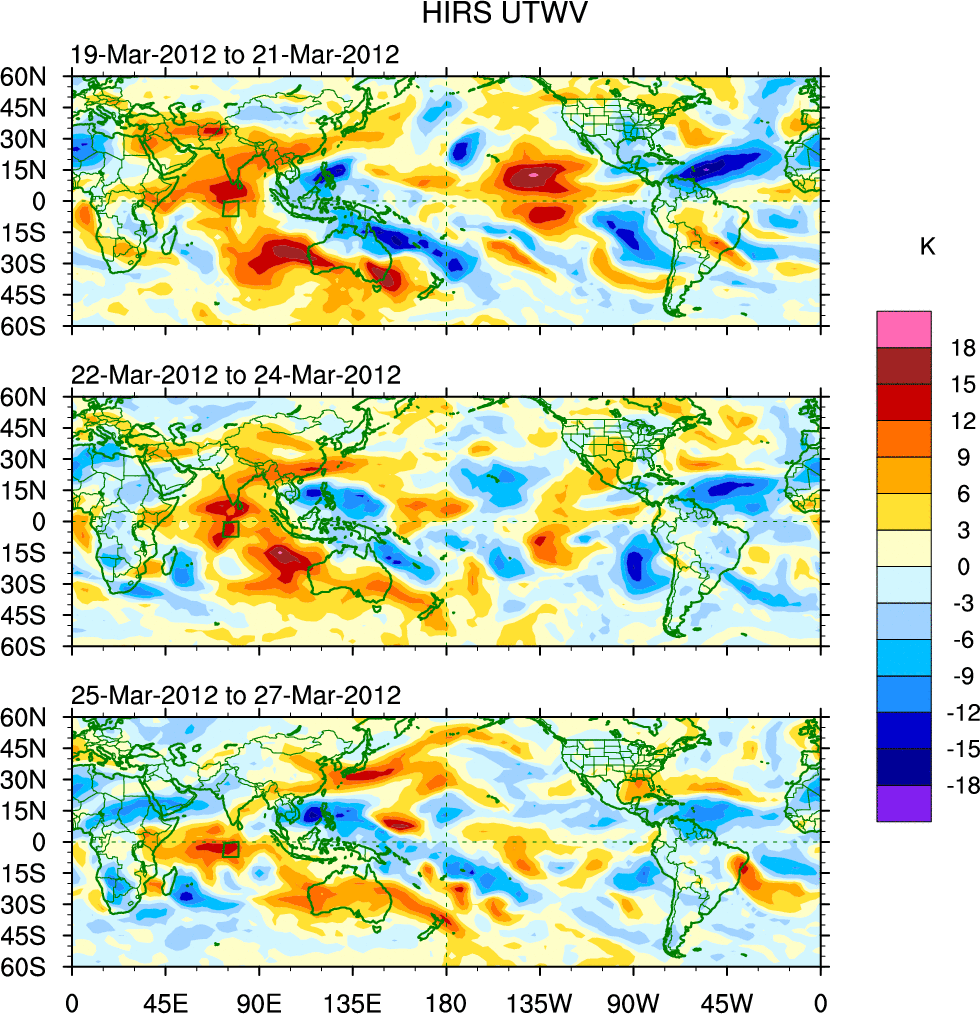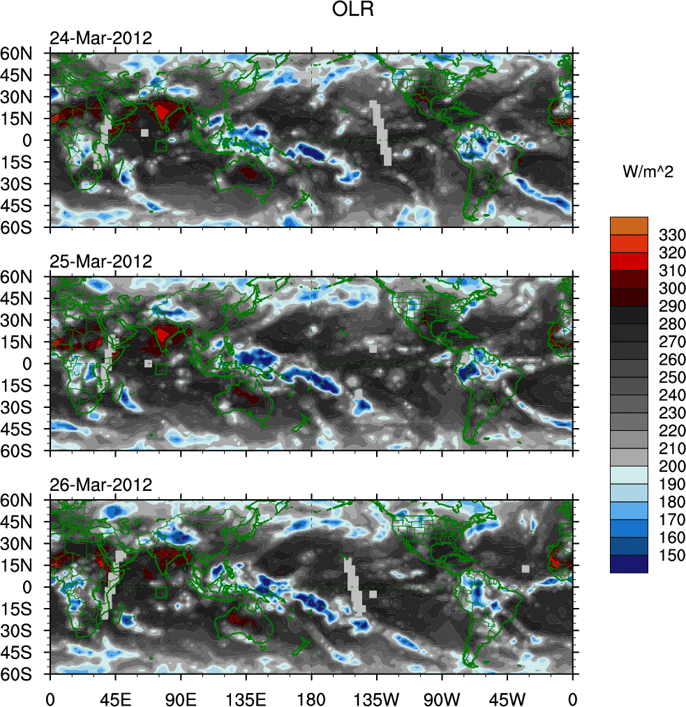 To identify tropical waves in near real-time, the OLR and UTWV data are filtered following Wheeler & Weickmann (2001 MWR). The daily anomalies are calculated using the first 3 harmonics of the seasonal cycle for 1979–2009. Missing values are then filled using linear interpolation in space and time. The most recent 365 days of anomalies are padded with 659 days of zeroes, and the result is filtered for each wave type.