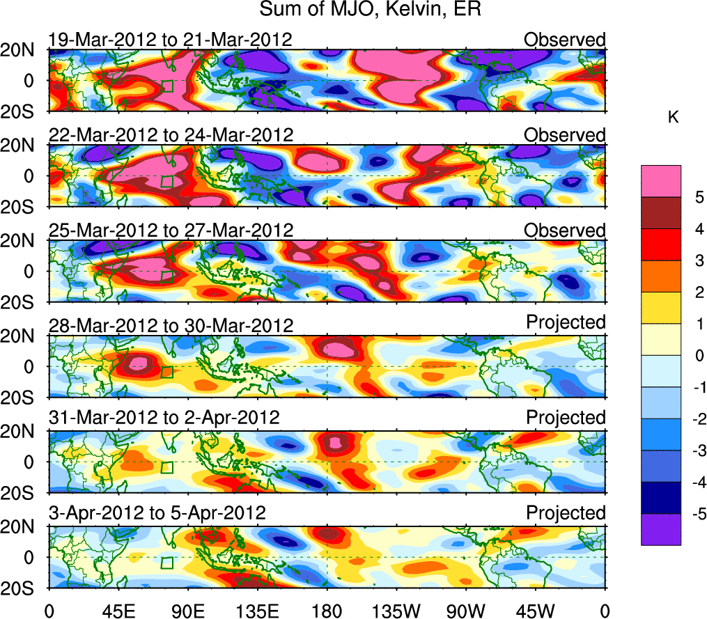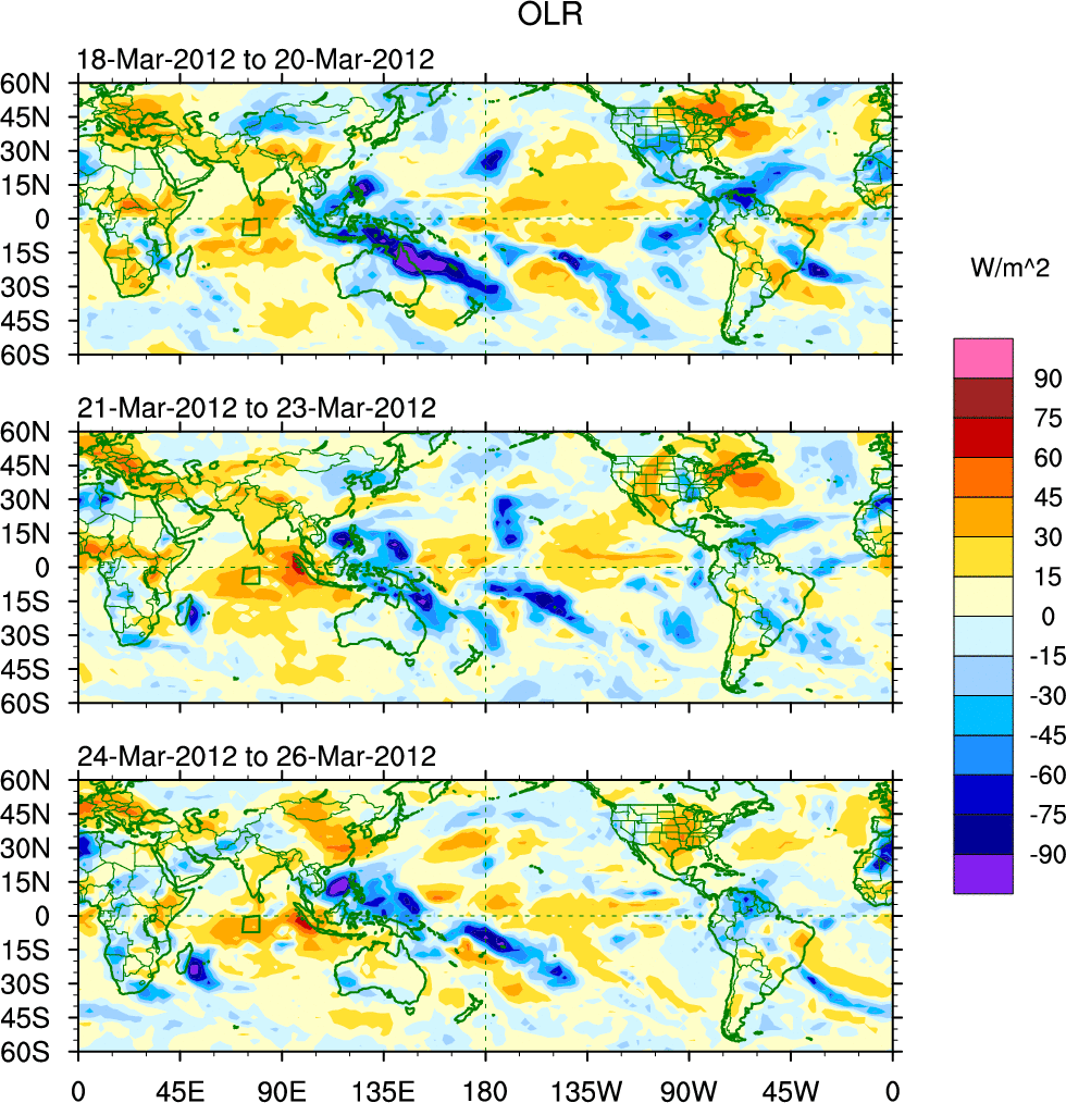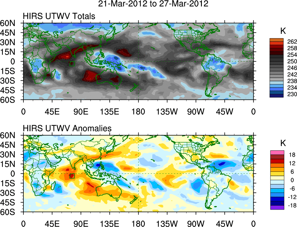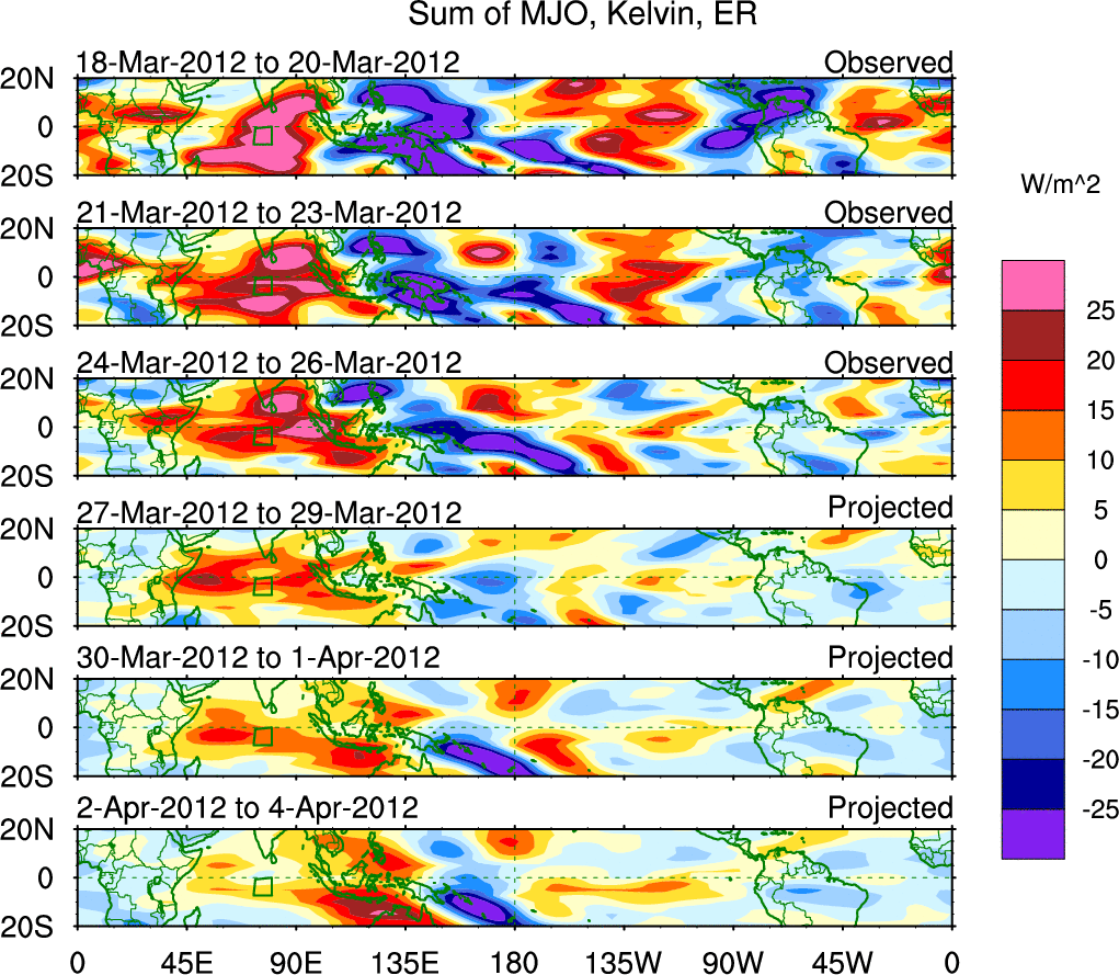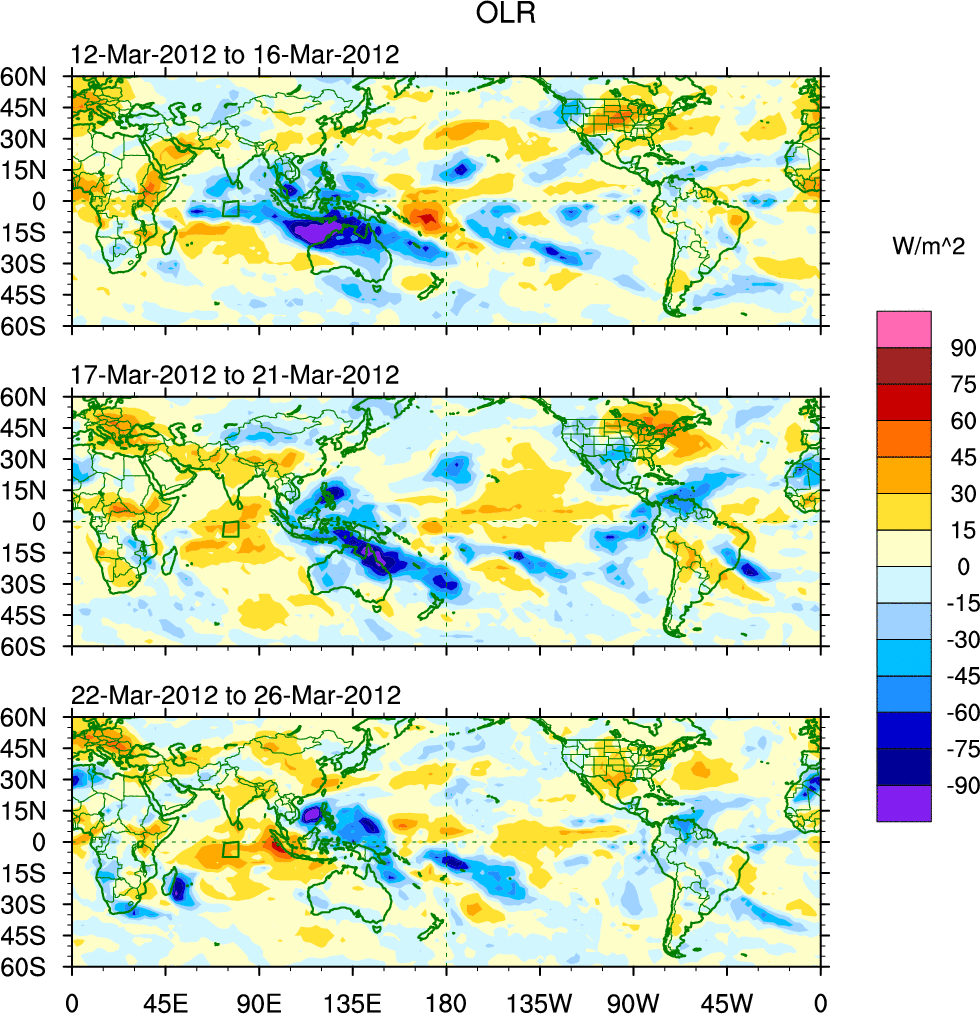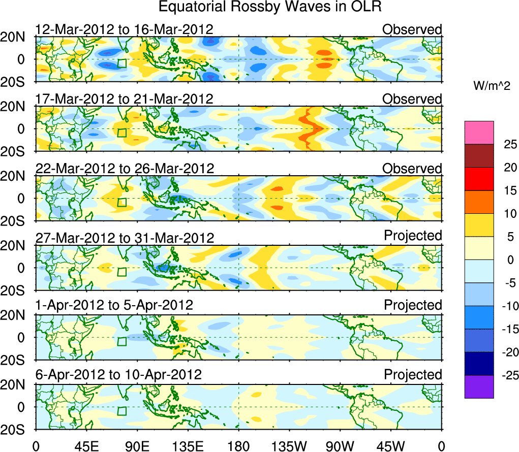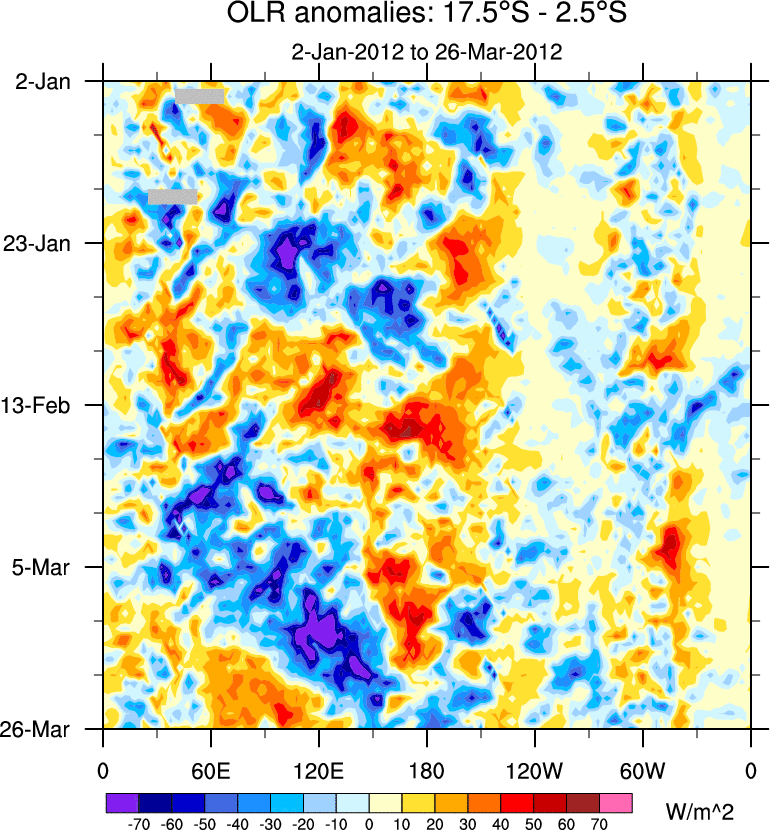 To identify tropical waves in near real-time, the OLR and UTWV data are filtered following Wheeler & Weickmann (2001 MWR). The daily anomalies are calculated using the first 3 harmonics of the seasonal cycle for 1979–2009. Missing values are then filled using linear interpolation in space and time. The most recent 365 days of anomalies are padded with 659 days of zeroes, and the result is filtered for each wave type.