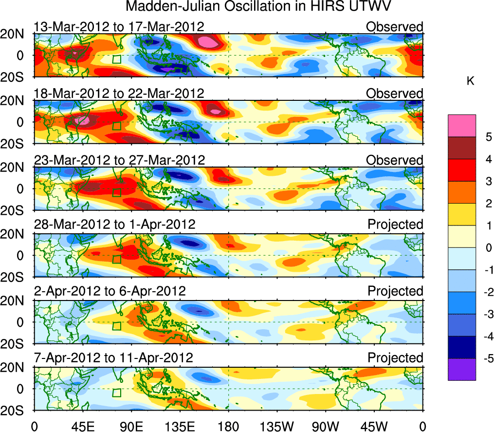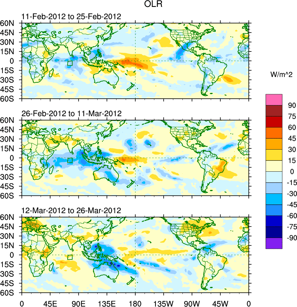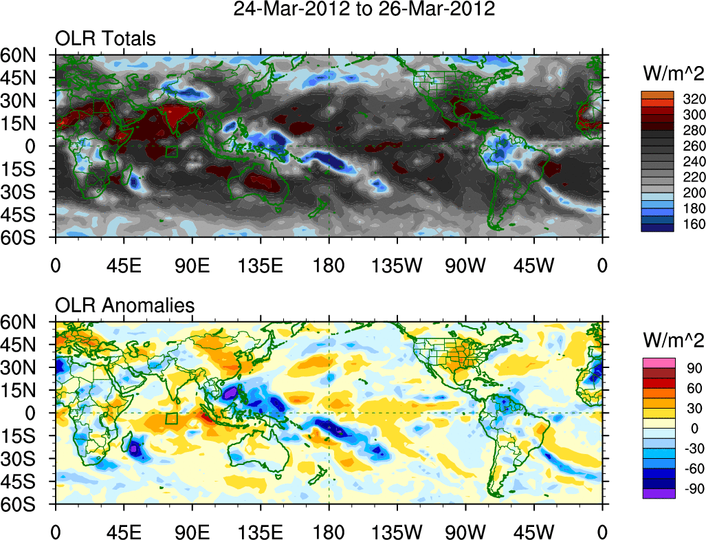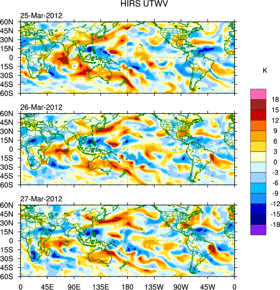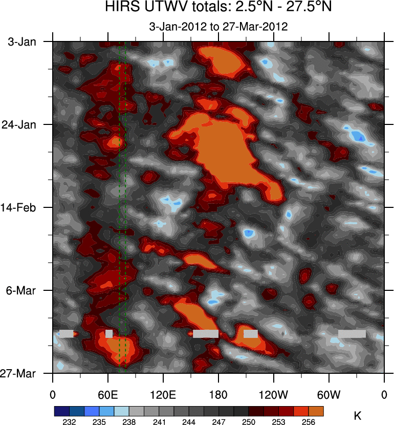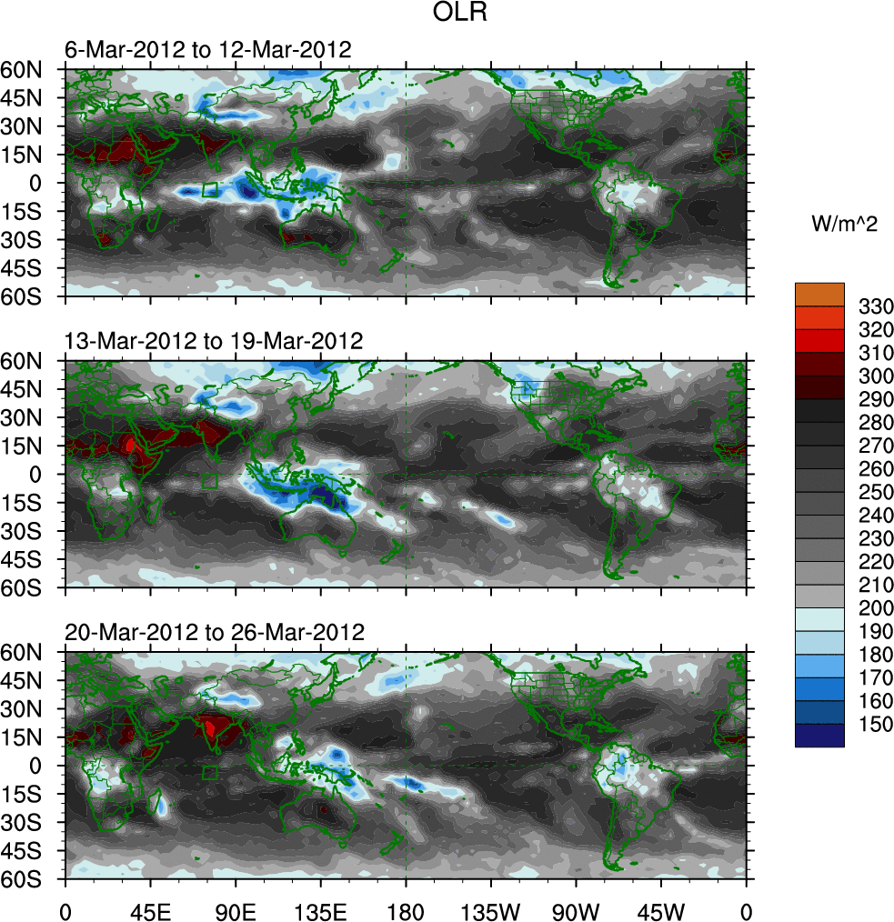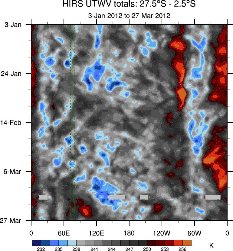 To identify tropical waves in near real-time, the OLR and UTWV data are filtered following Wheeler & Weickmann (2001 MWR). The daily anomalies are calculated using the first 3 harmonics of the seasonal cycle for 1979–2009. Missing values are then filled using linear interpolation in space and time. The most recent 365 days of anomalies are padded with 659 days of zeroes, and the result is filtered for each wave type.