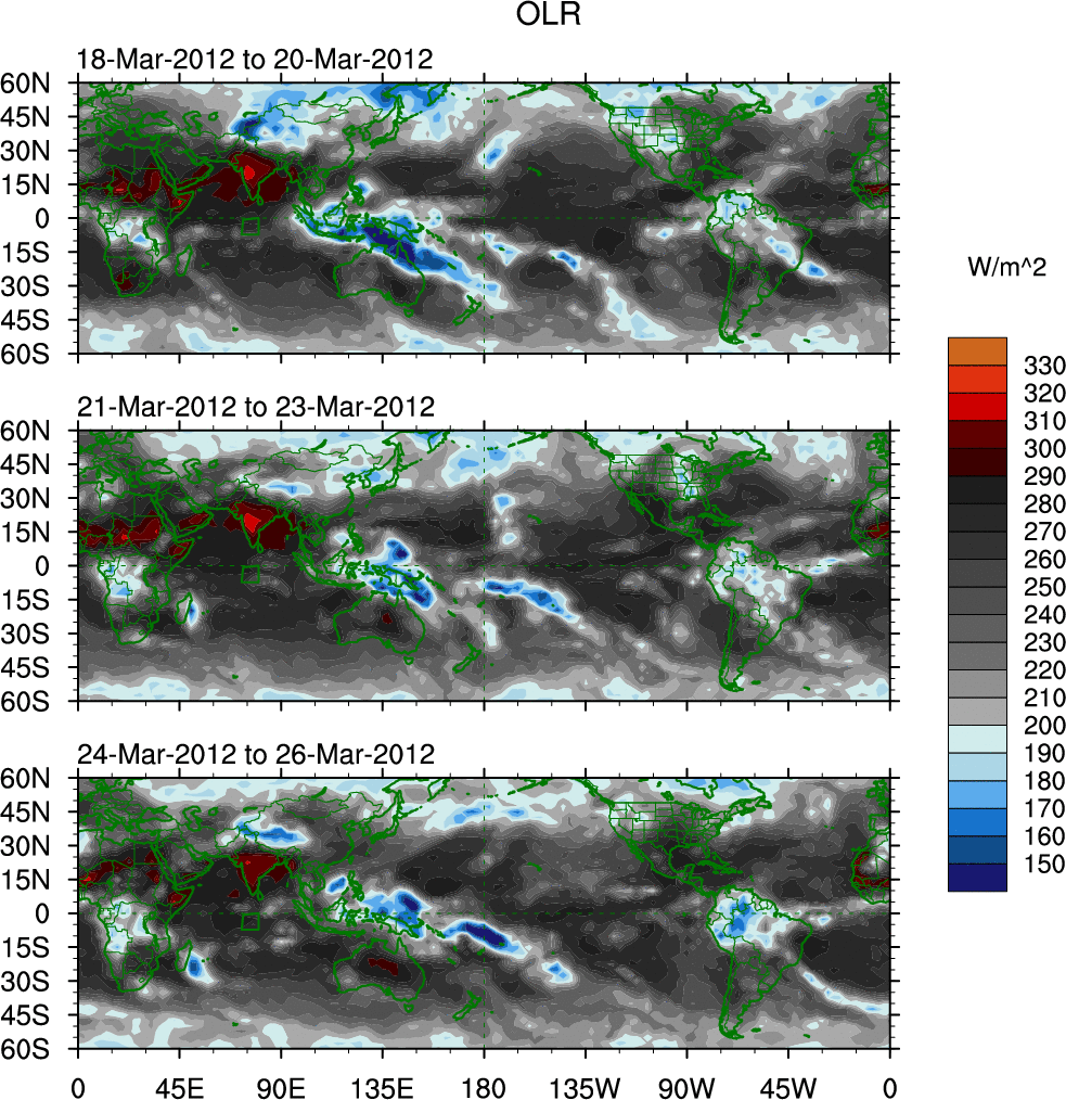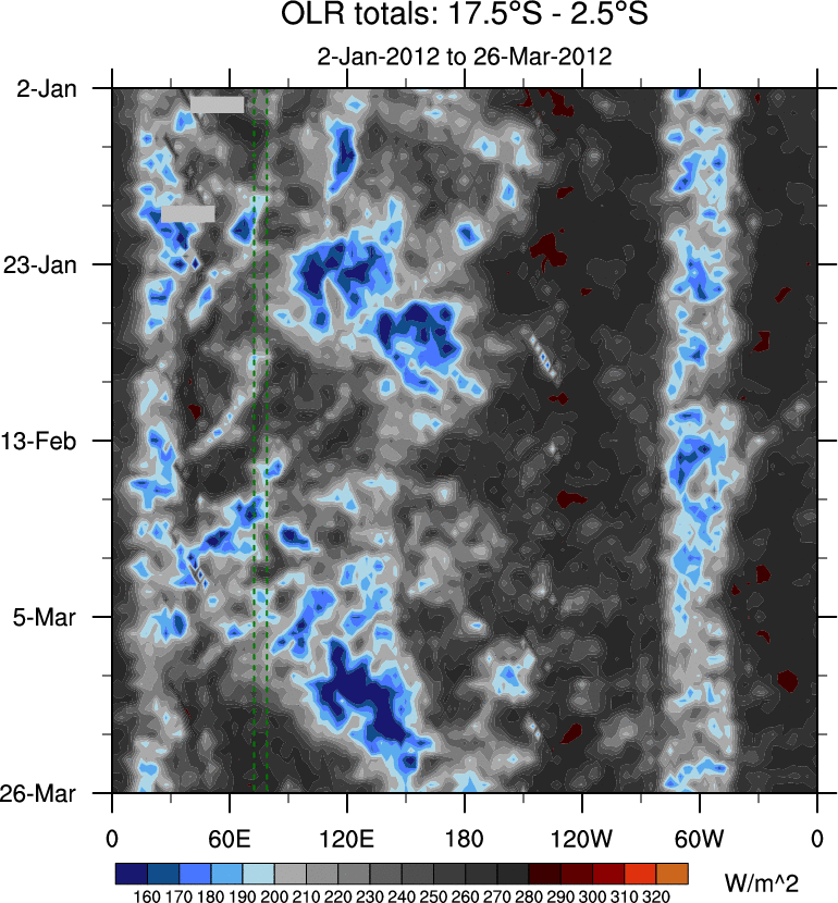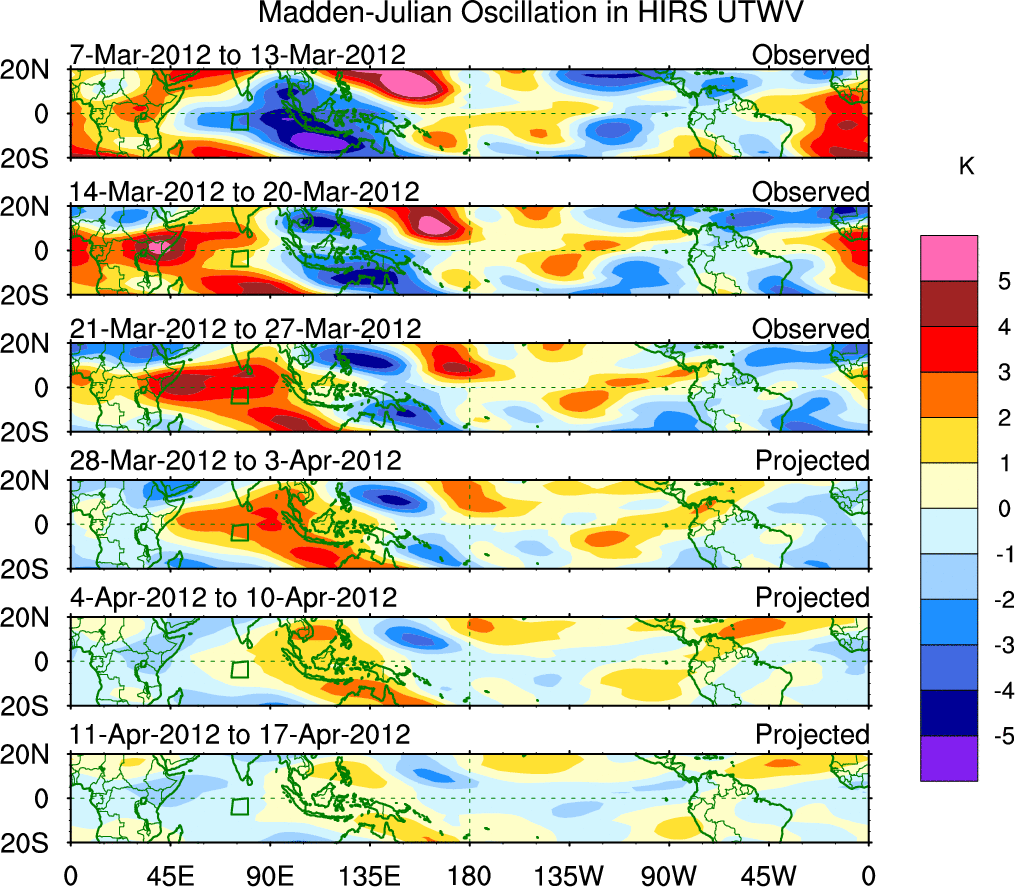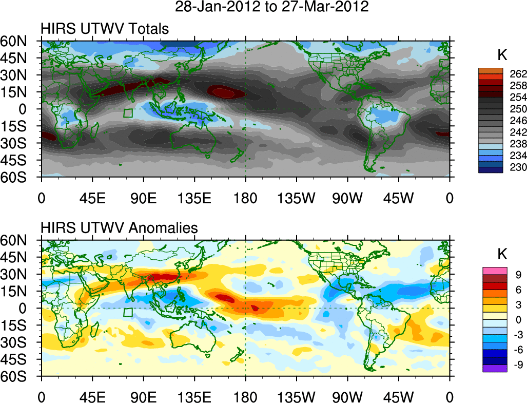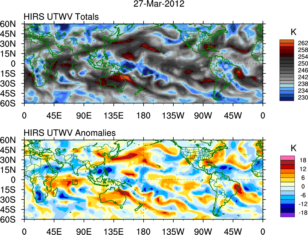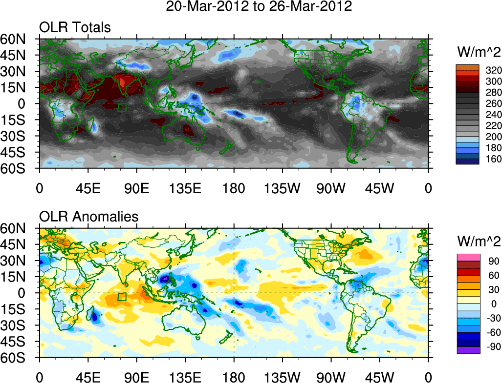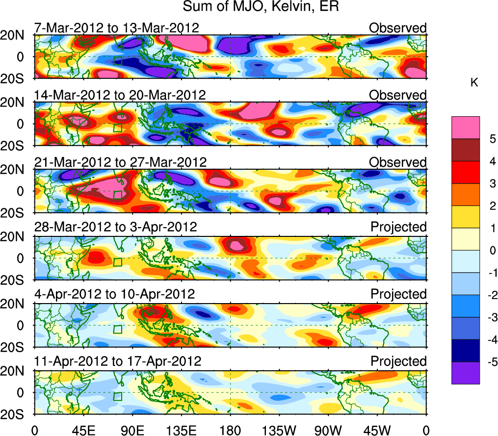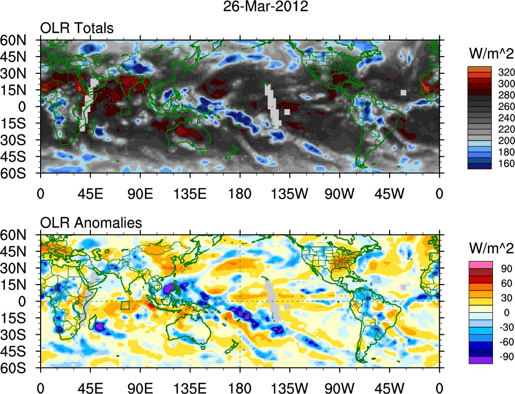 To identify tropical waves in near real-time, the OLR and UTWV data are filtered following Wheeler & Weickmann (2001 MWR). The daily anomalies are calculated using the first 3 harmonics of the seasonal cycle for 1979–2009. Missing values are then filled using linear interpolation in space and time. The most recent 365 days of anomalies are padded with 659 days of zeroes, and the result is filtered for each wave type.