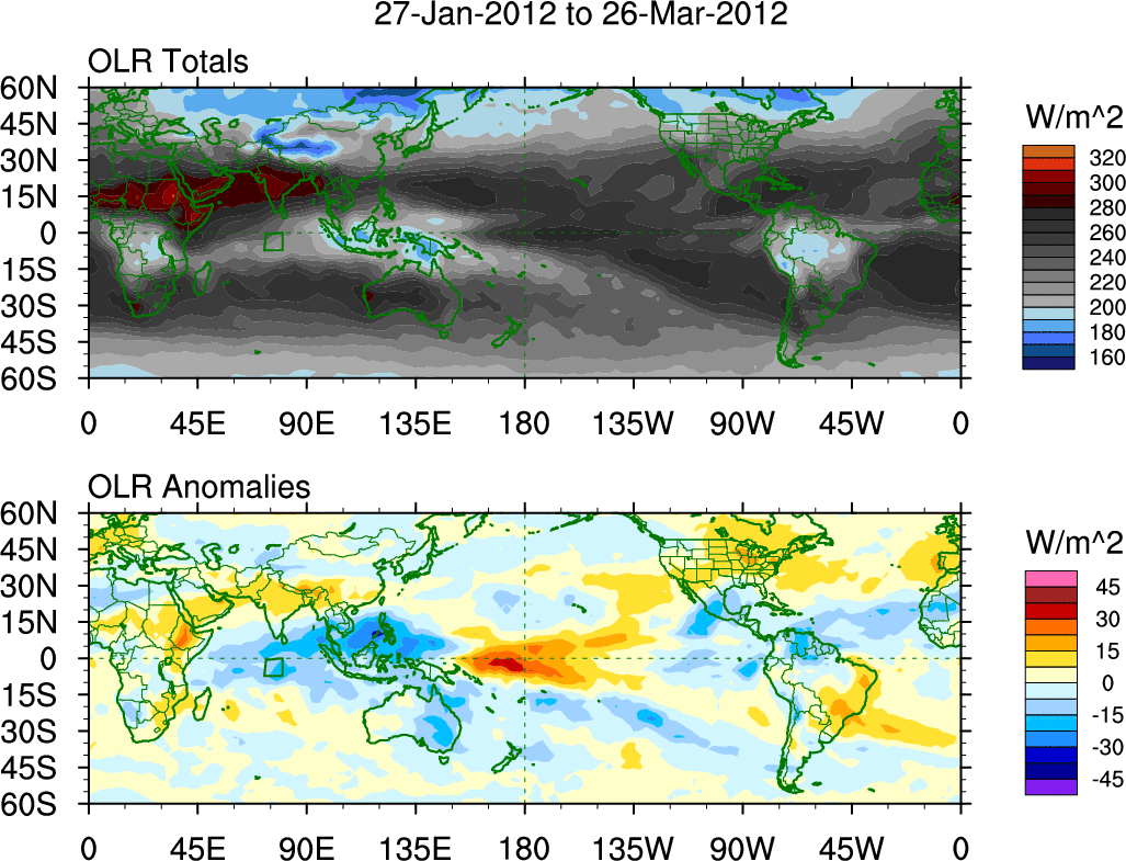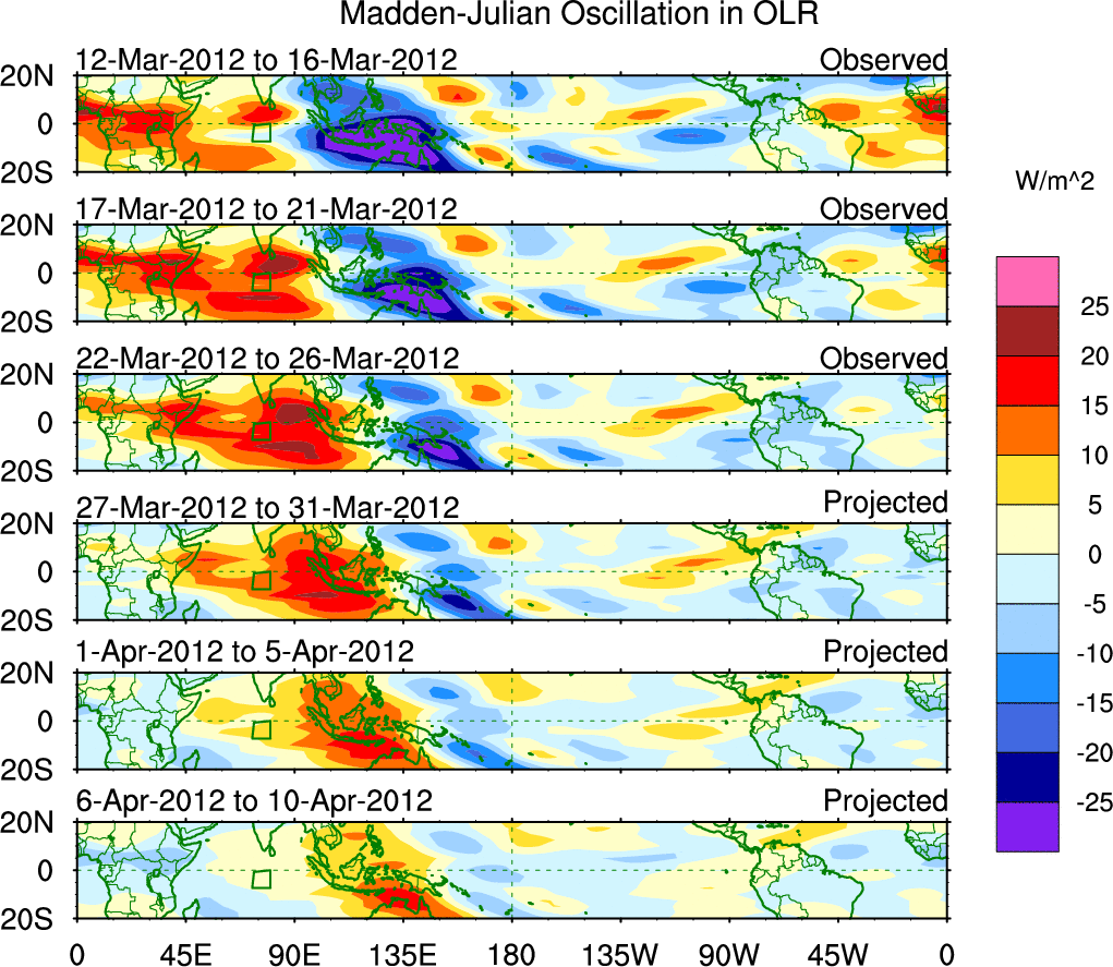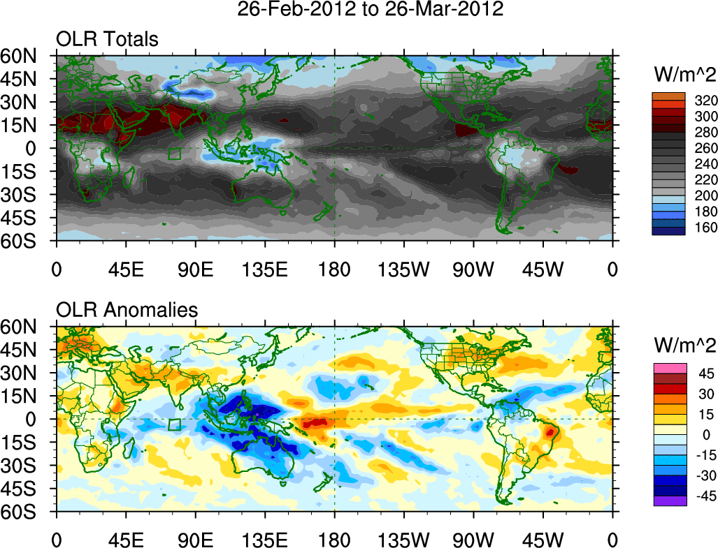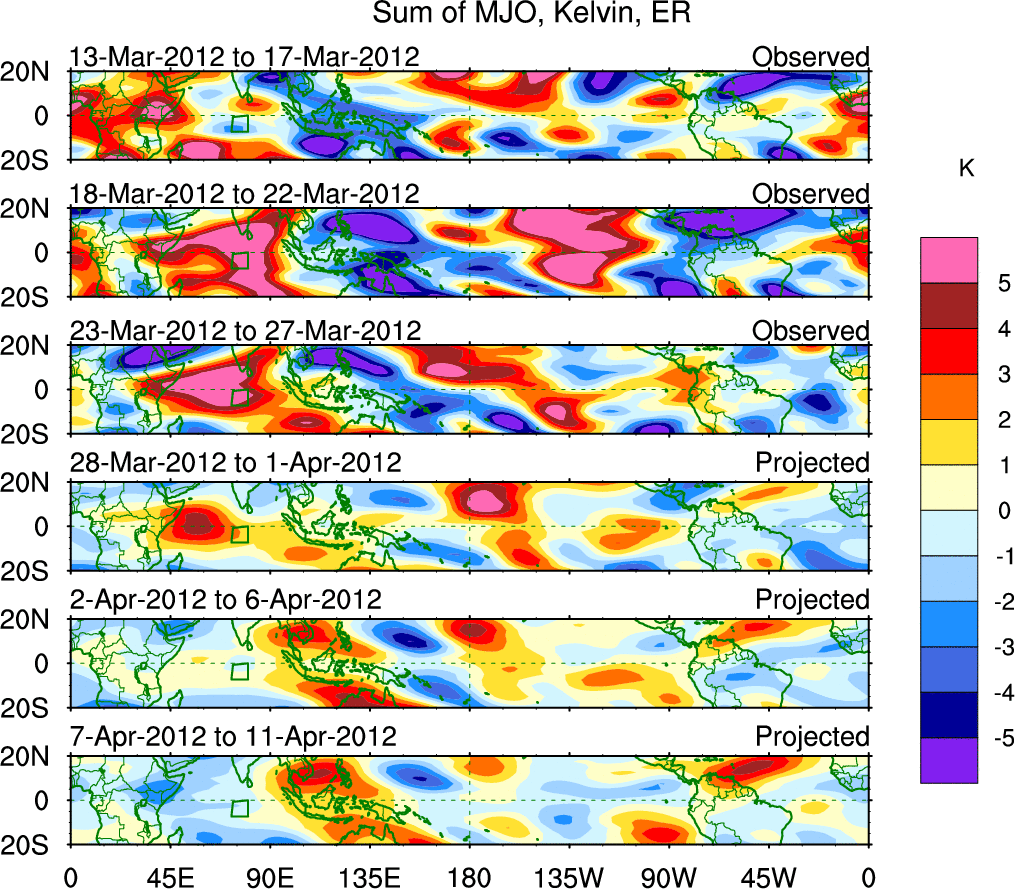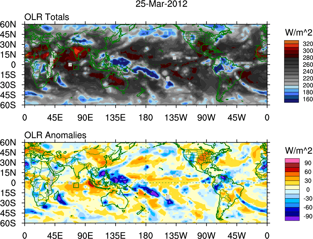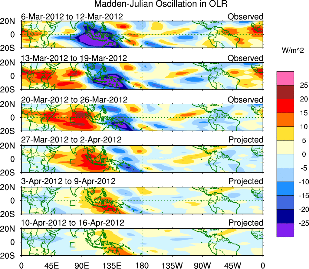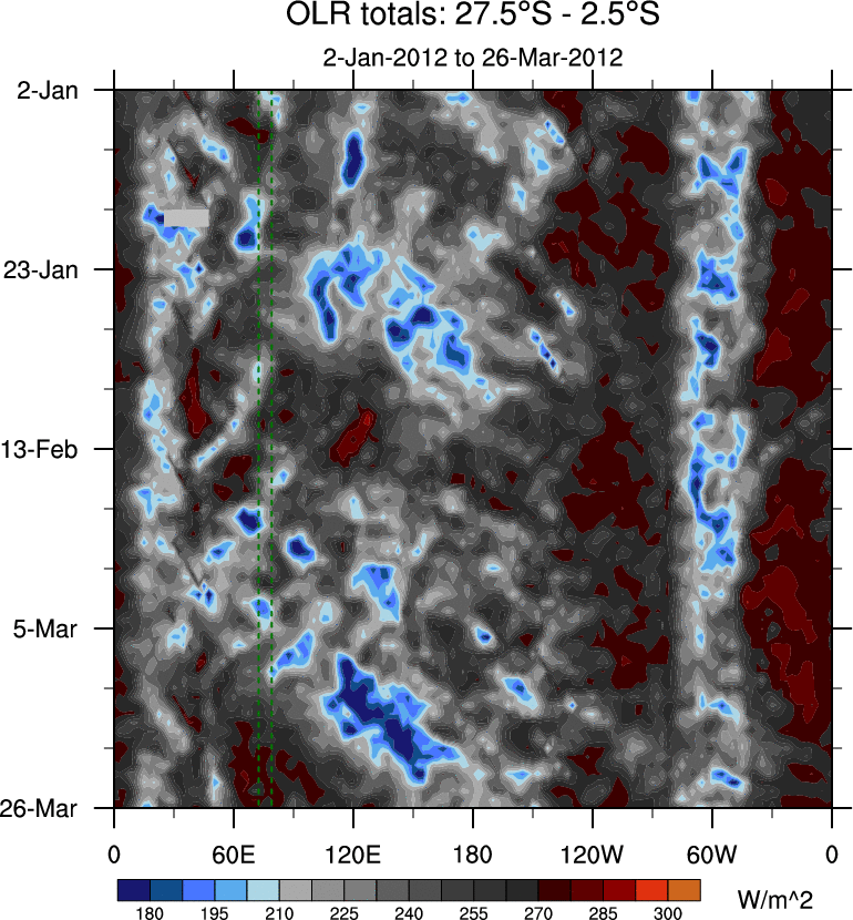 To identify tropical waves in near real-time, the OLR and UTWV data are filtered following Wheeler & Weickmann (2001 MWR). The daily anomalies are calculated using the first 3 harmonics of the seasonal cycle for 1979–2009. Missing values are then filled using linear interpolation in space and time. The most recent 365 days of anomalies are padded with 659 days of zeroes, and the result is filtered for each wave type.