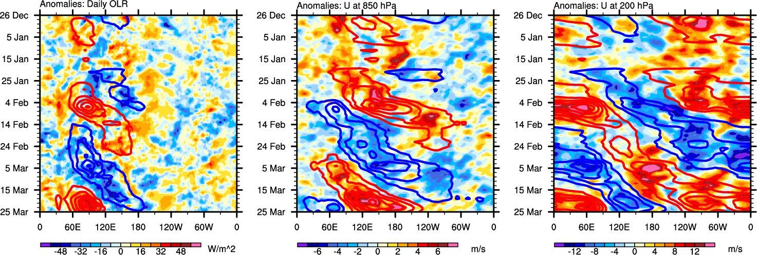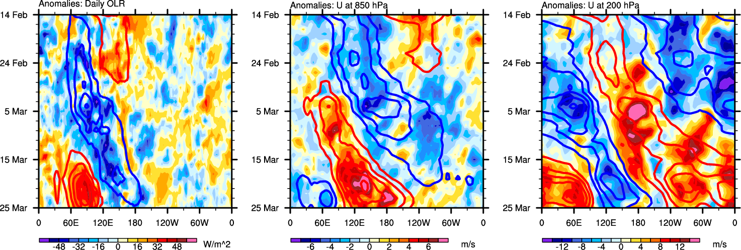 The Hovmollers show longitude-time plots for OLR, U-850, and U-200. The shading indicates the observed anomalies, while the contours are the projection of those anomalies onto the RMM EOFs.