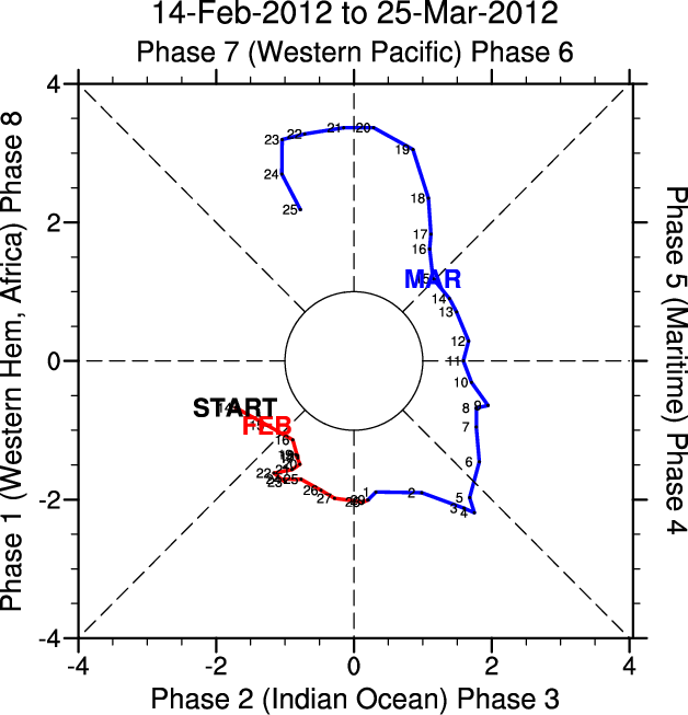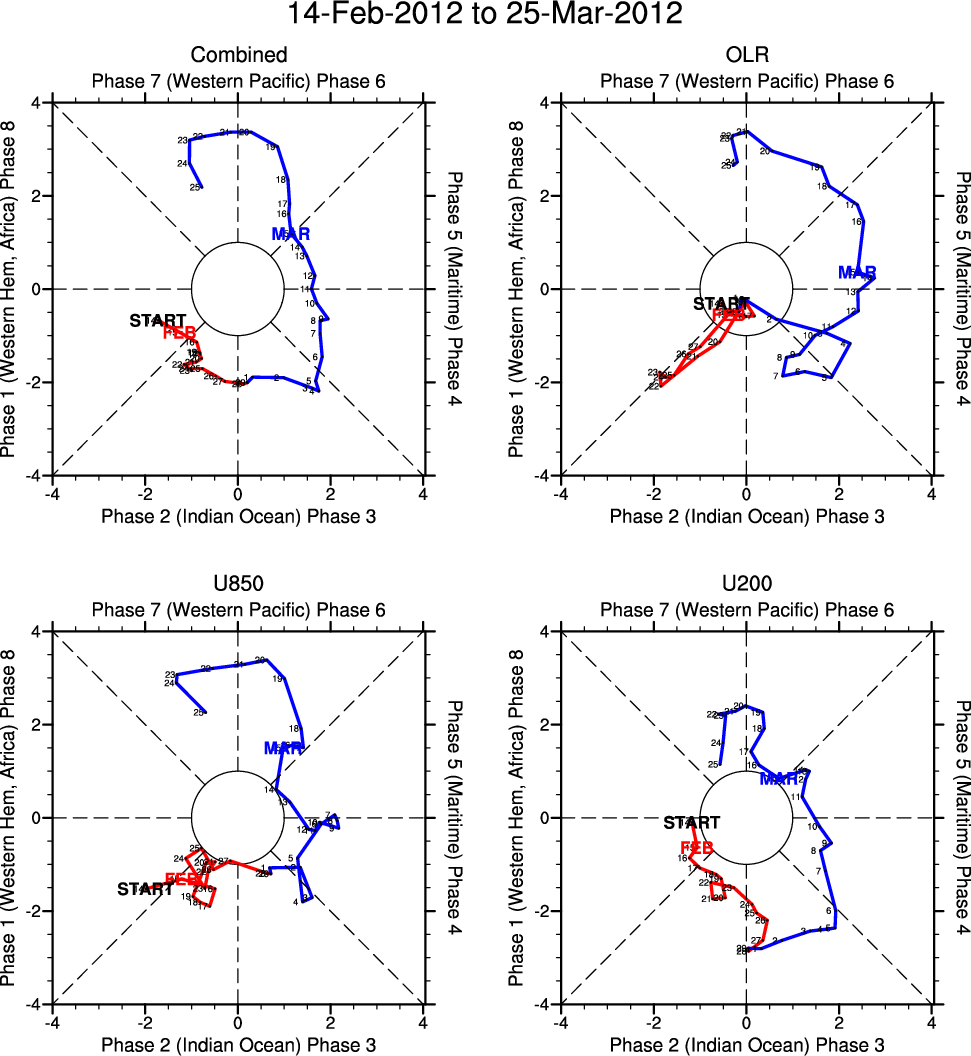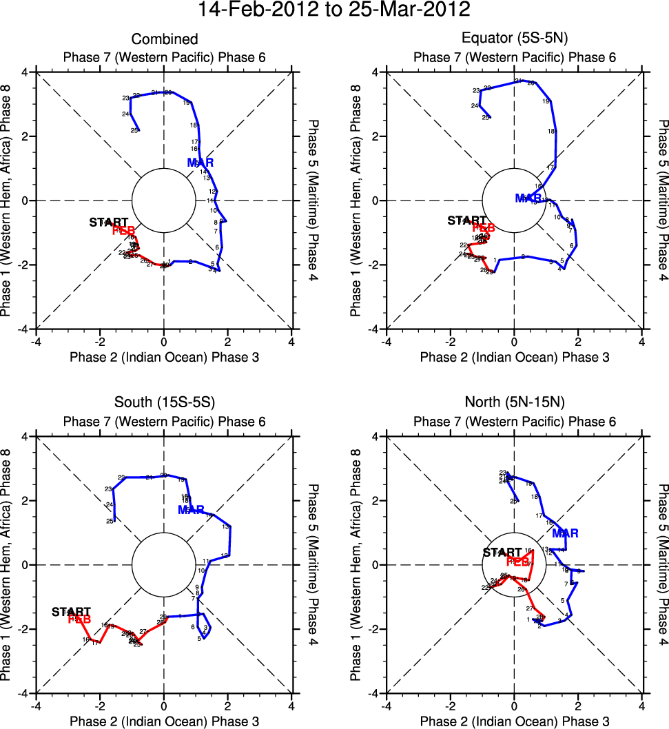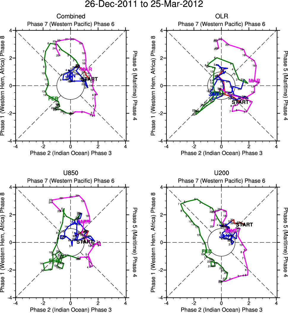 Wheeler and Hendon (2004) constructed the RMM index for monitoring the MJO. This index consists of the first two principal components (PCs) of OLR, 850-hPa zonal wind, and 200-hPa zonal wind averaged 15S-15N.