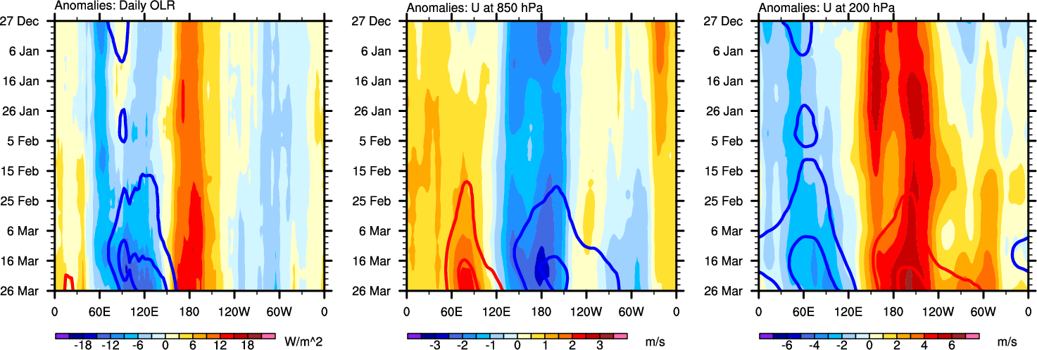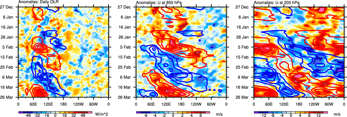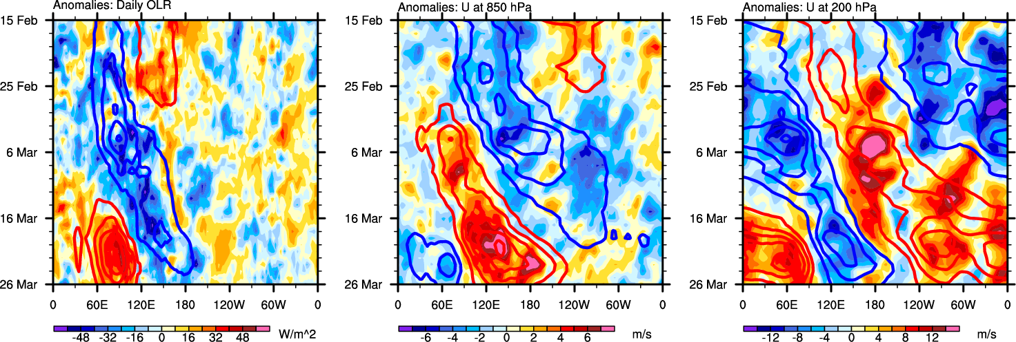 The Hovmollers show longitude-time plots for OLR, U-850, and U-200. The shading indicates the observed anomalies, while the contours are the projection of those anomalies onto the RMM EOFs.