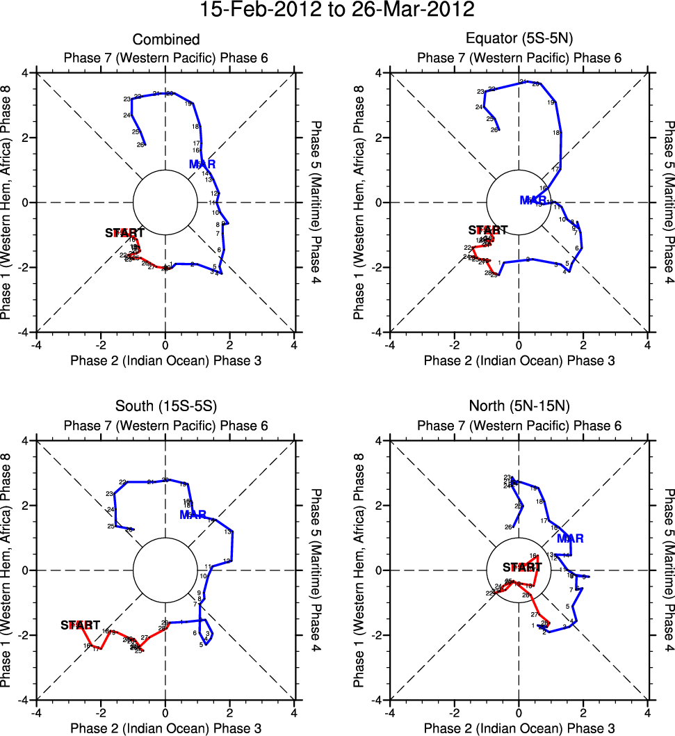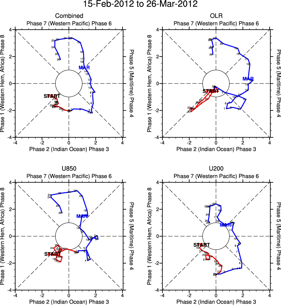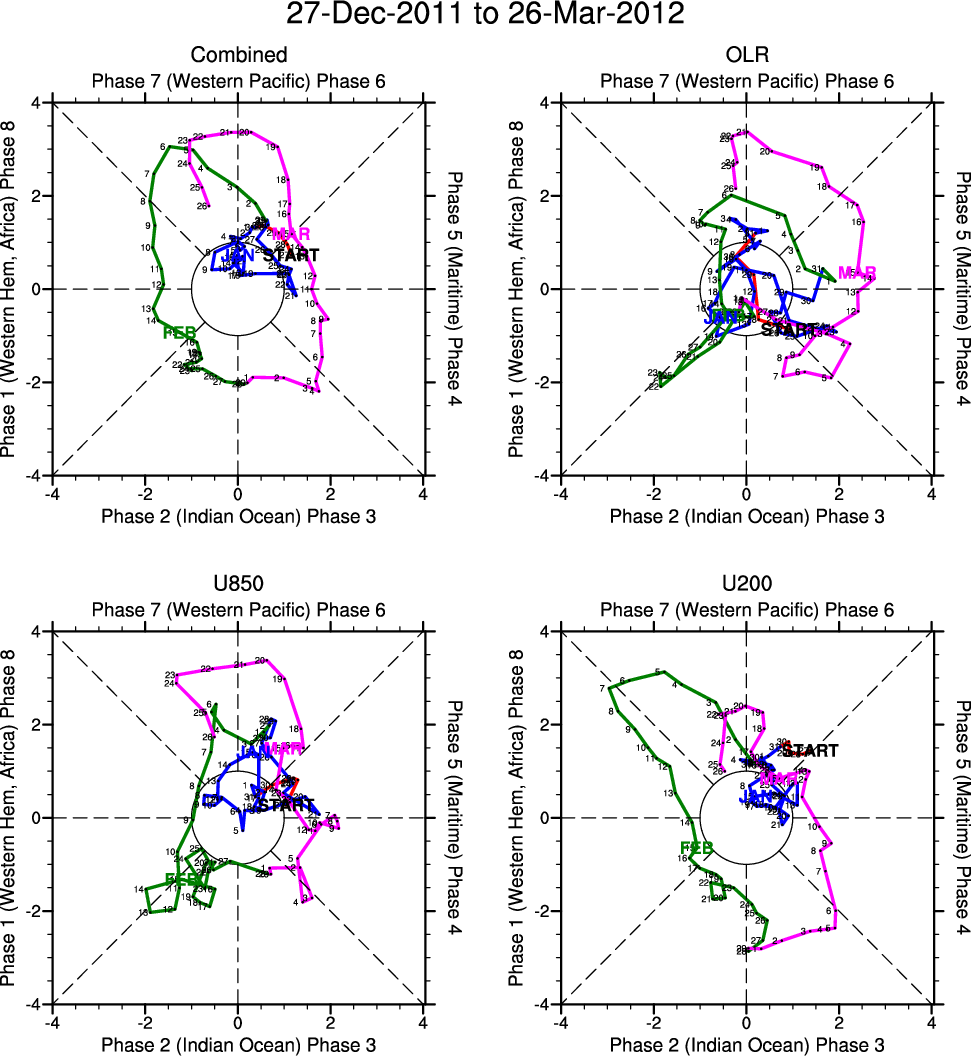 Wheeler and Hendon (2004) constructed the RMM index for monitoring the MJO. This index consists of the first two principal components (PCs) of OLR, 850-hPa zonal wind, and 200-hPa zonal wind averaged 15S-15N.