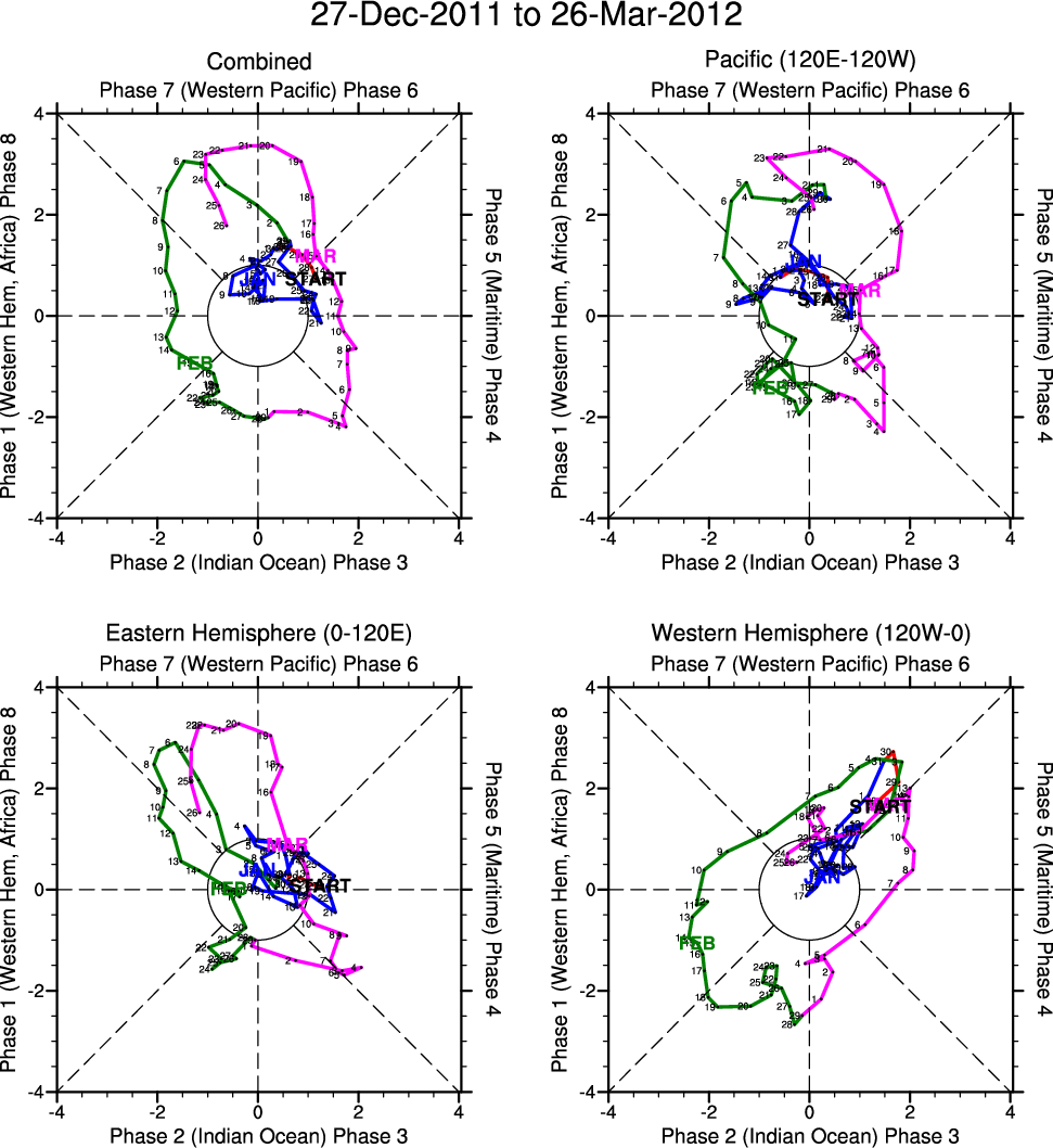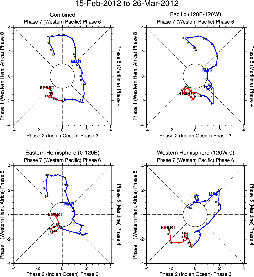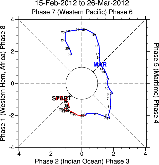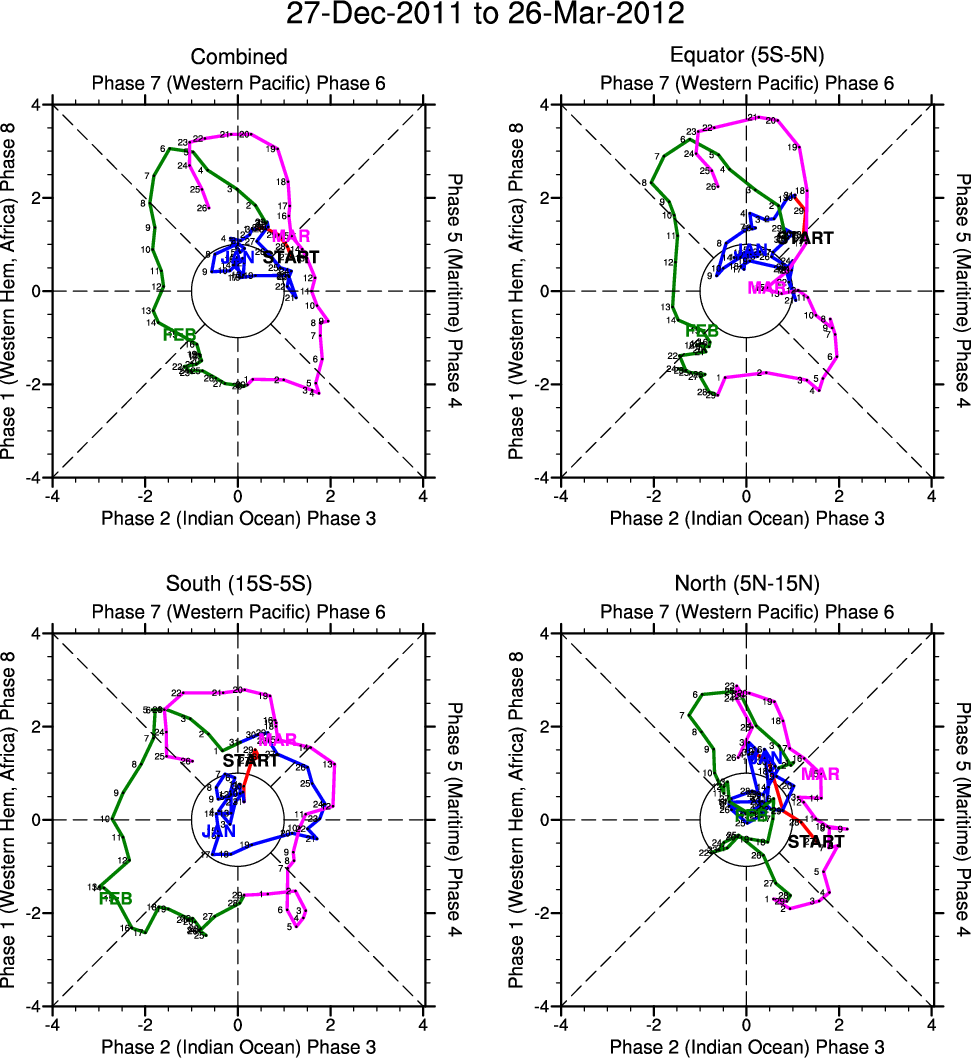 Wheeler and Hendon (2004) constructed the RMM index for monitoring the MJO. This index consists of the first two principal components (PCs) of OLR, 850-hPa zonal wind, and 200-hPa zonal wind averaged 15S-15N.