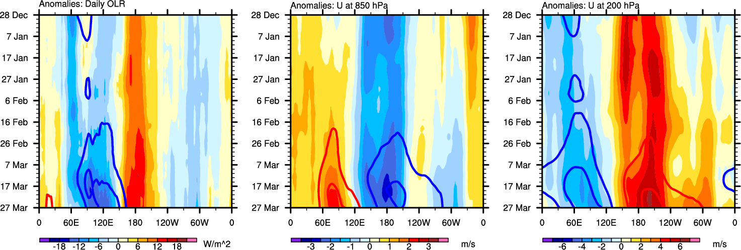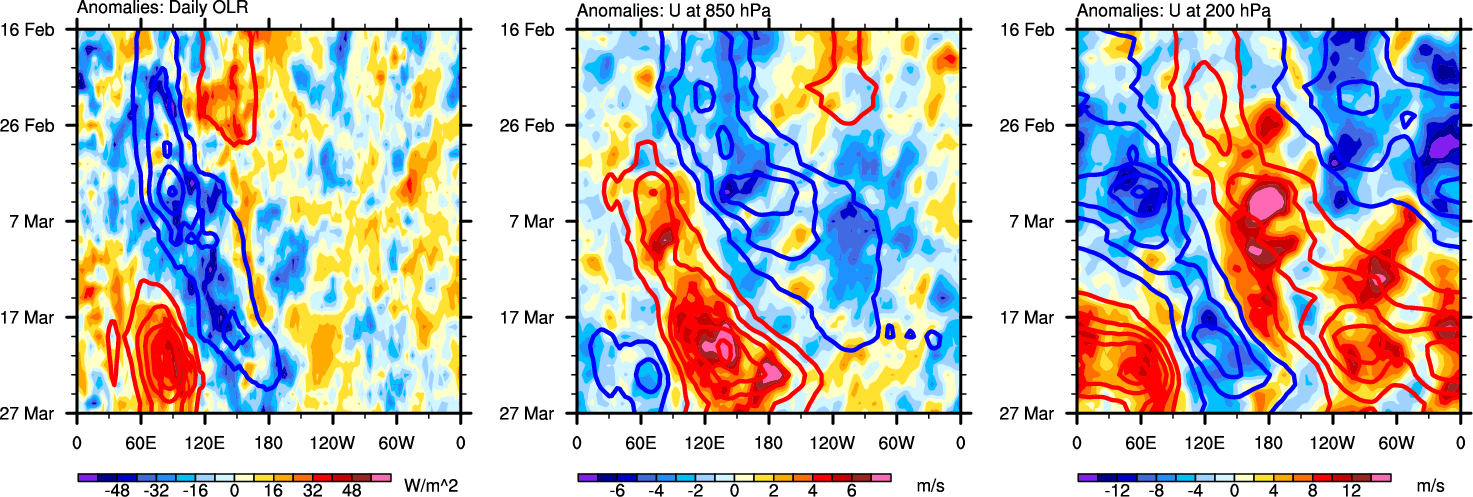 The Hovmollers show longitude-time plots for OLR, U-850, and U-200. The shading indicates the observed anomalies, while the contours are the projection of those anomalies onto the RMM EOFs.